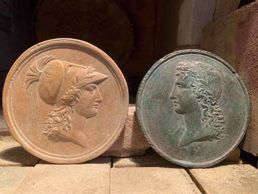 On offer here is a stunning replica portrait of the Goddess Athena and the God Apollo. Athena wears her typical plumed helmet with an engraved, winged lion shown on the crown of the headdress . The raised relief is of a high order and captures the grace and power of this most magestic god of the Greco-Roman world.