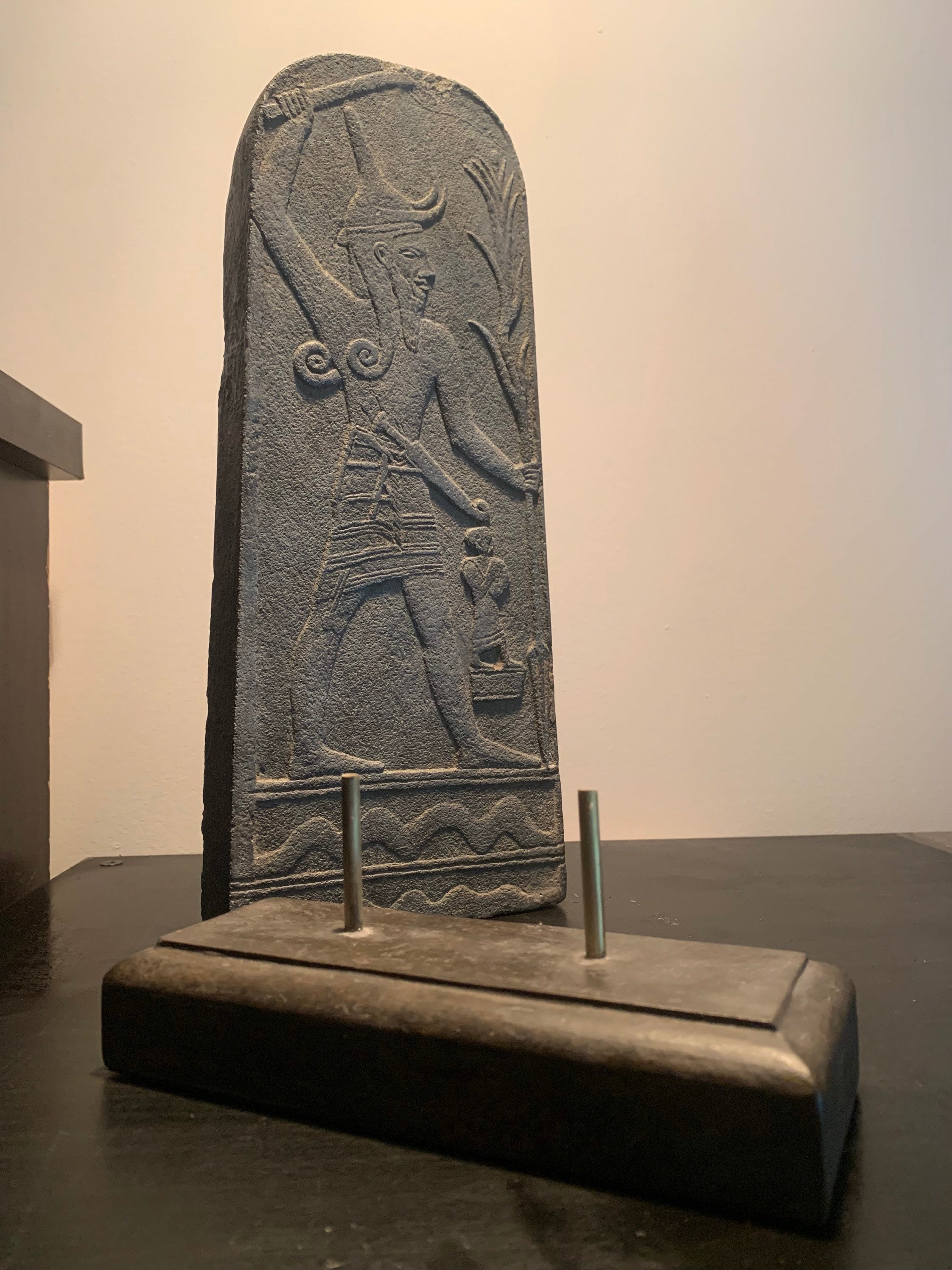 This explains why essentially the carving looks Egyptian in overall pose and proportion, however, it has distinctive differences. The grasping of a lightning bolt is very unusual as is the narrow, horned headdress. Even the multiple curls of the hair are very different to how an Egyptian male figure is depicted - mortal or otherwise.