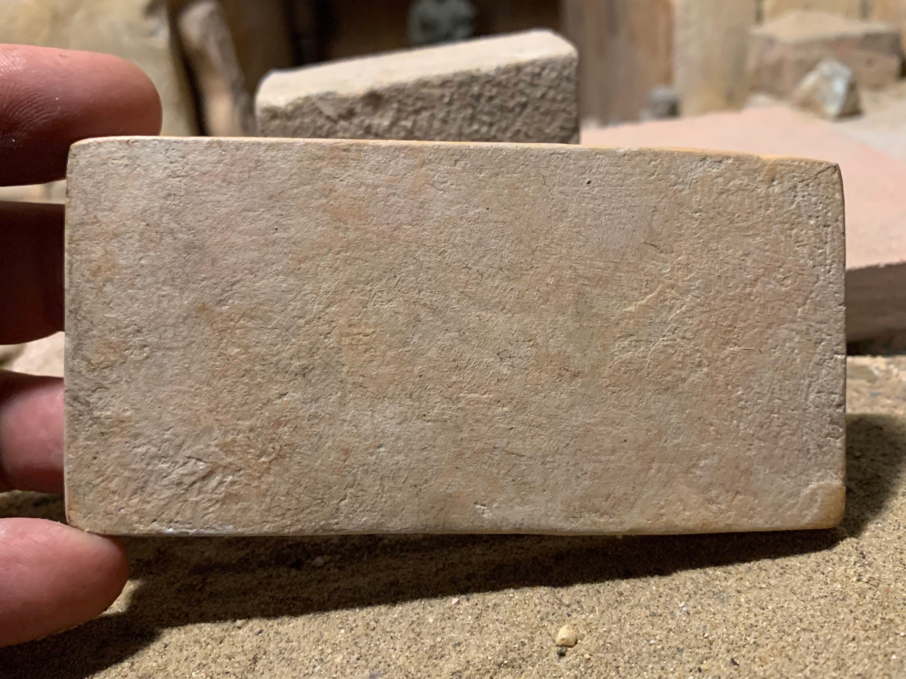 Made of a limestone and quartzite composition stone and has been given an aged ochre patina.