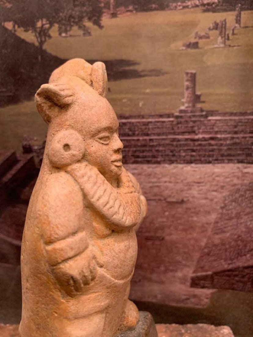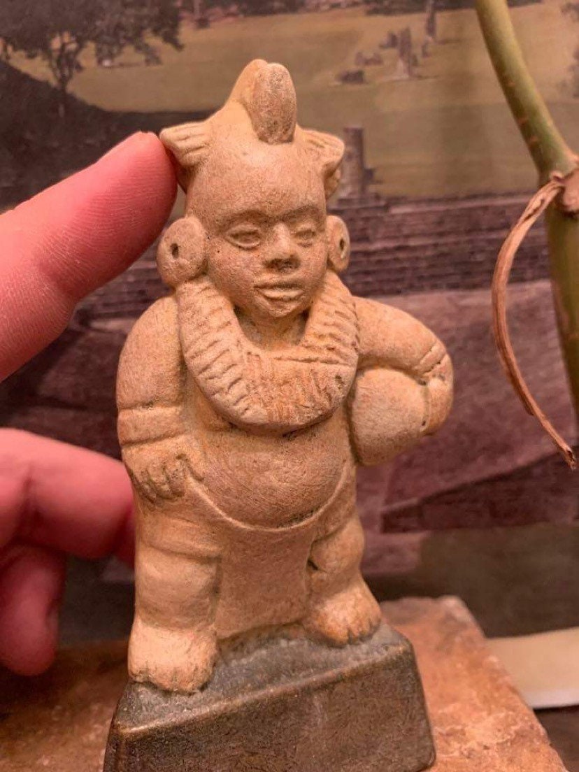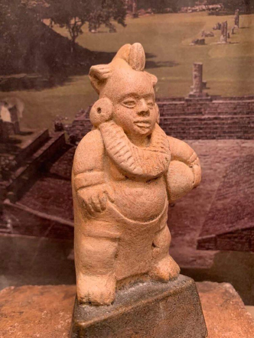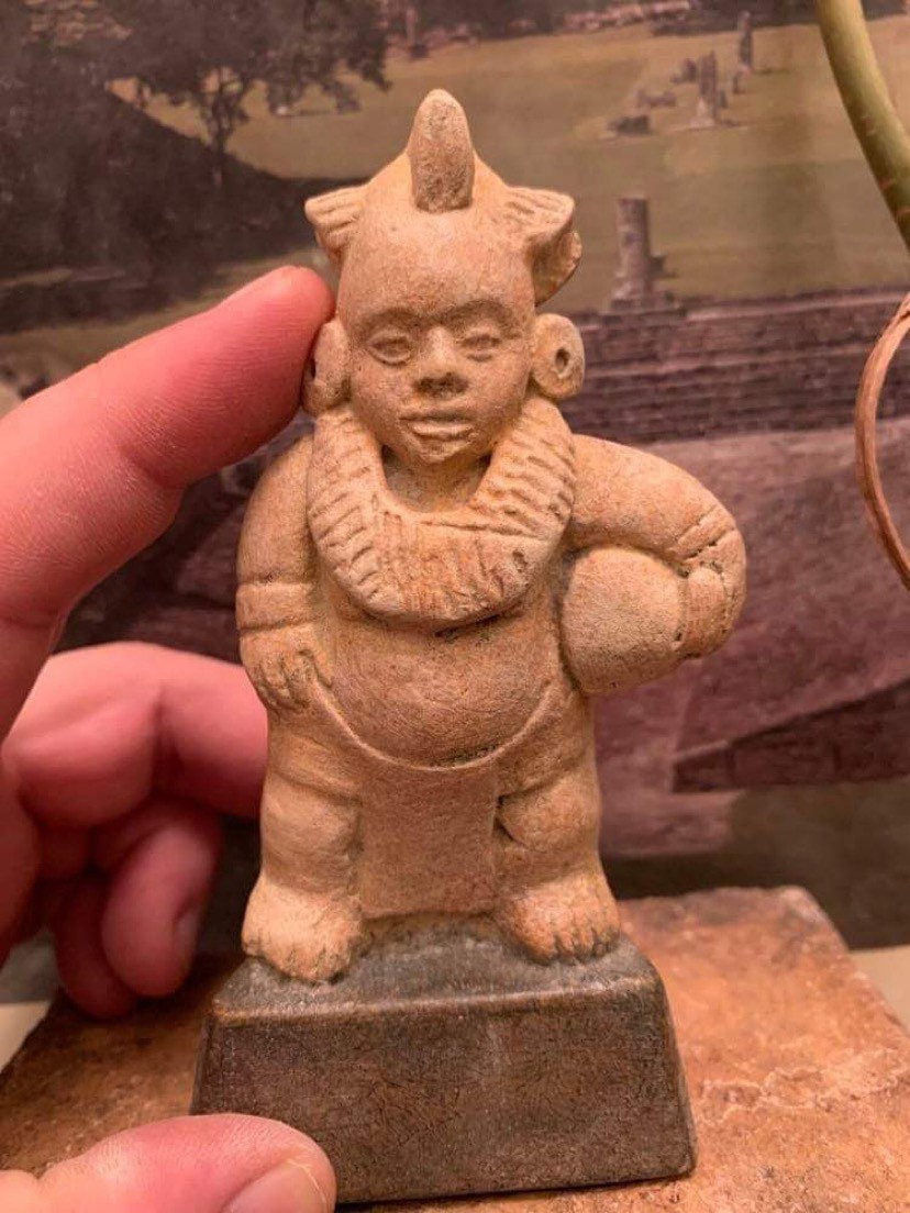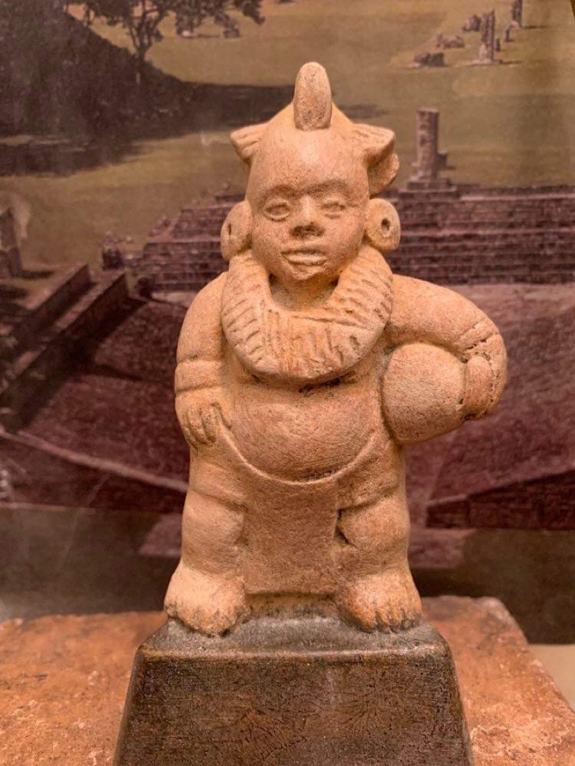 This is a great replica of an ancient pre-Columbian statue featuring the unmistakable form of a ball player. The origins of all football and basketball games can be traced to the surviving ball court stadiums and statues giving form to the actual players.