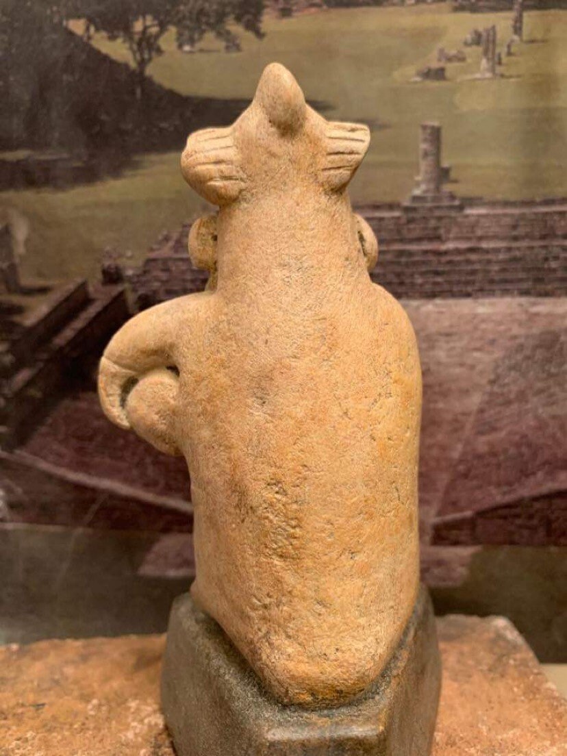 This statue represents a player that must have been quite an accomplished athlete, worthy of having such a figure made in his honor. A hint at a feathered headdress and a yoke worn over the crotch were the only clothing worn with a broad necklace and large decorative ear plugs also evident. He clutches the very ball sought after by this team sport. Minimal detail is present on the back of the figure, limited to the back of the headdress