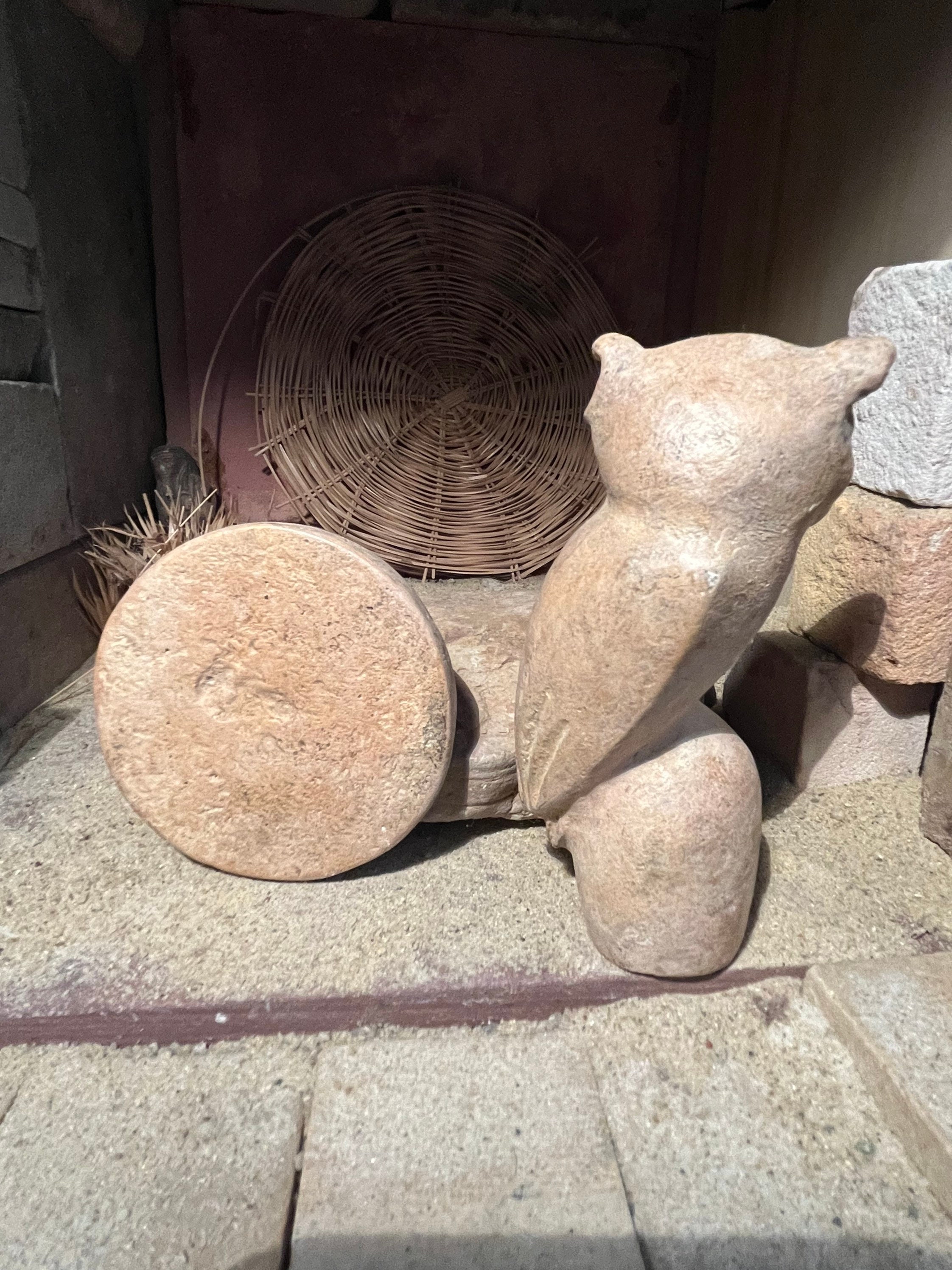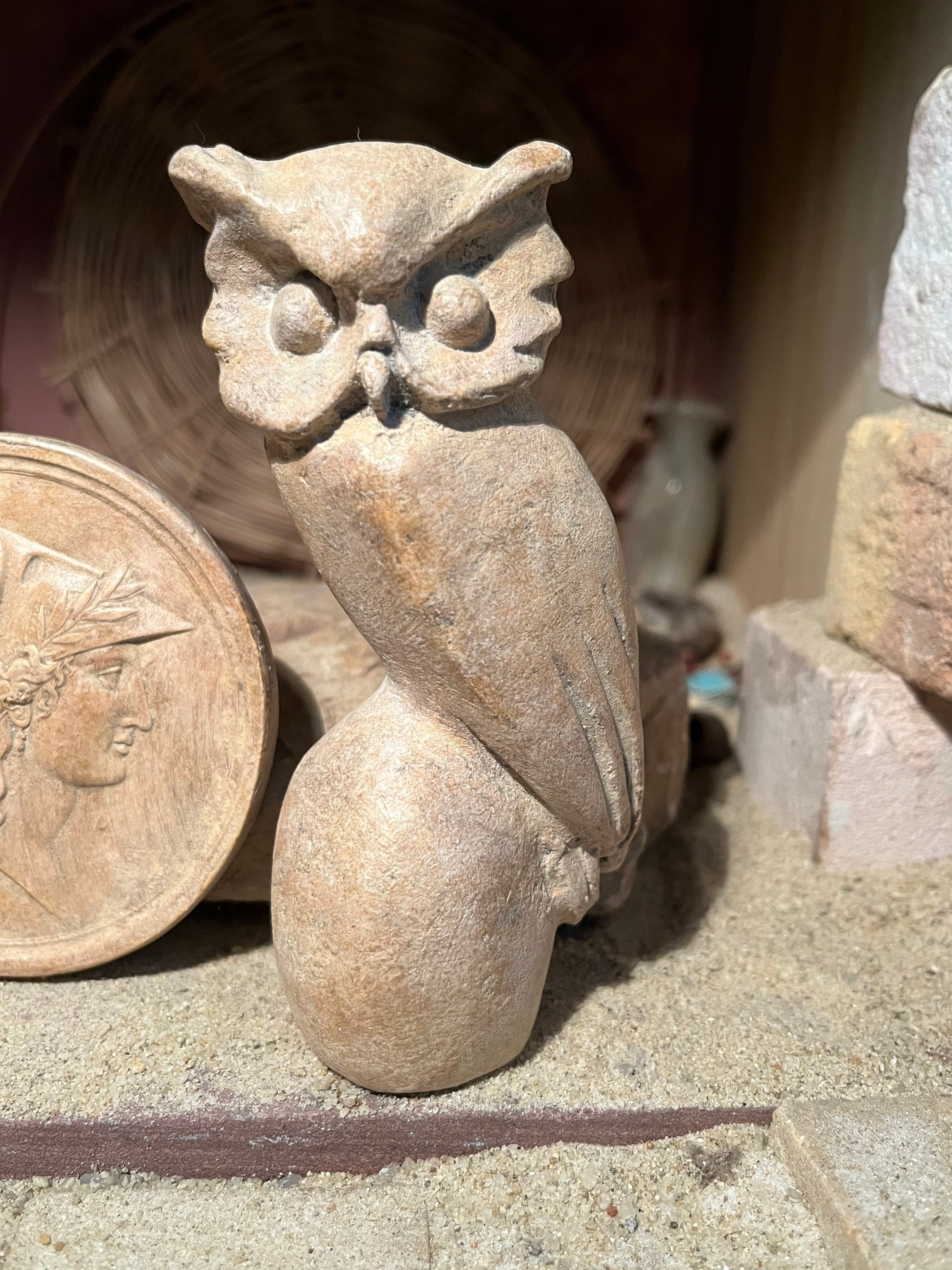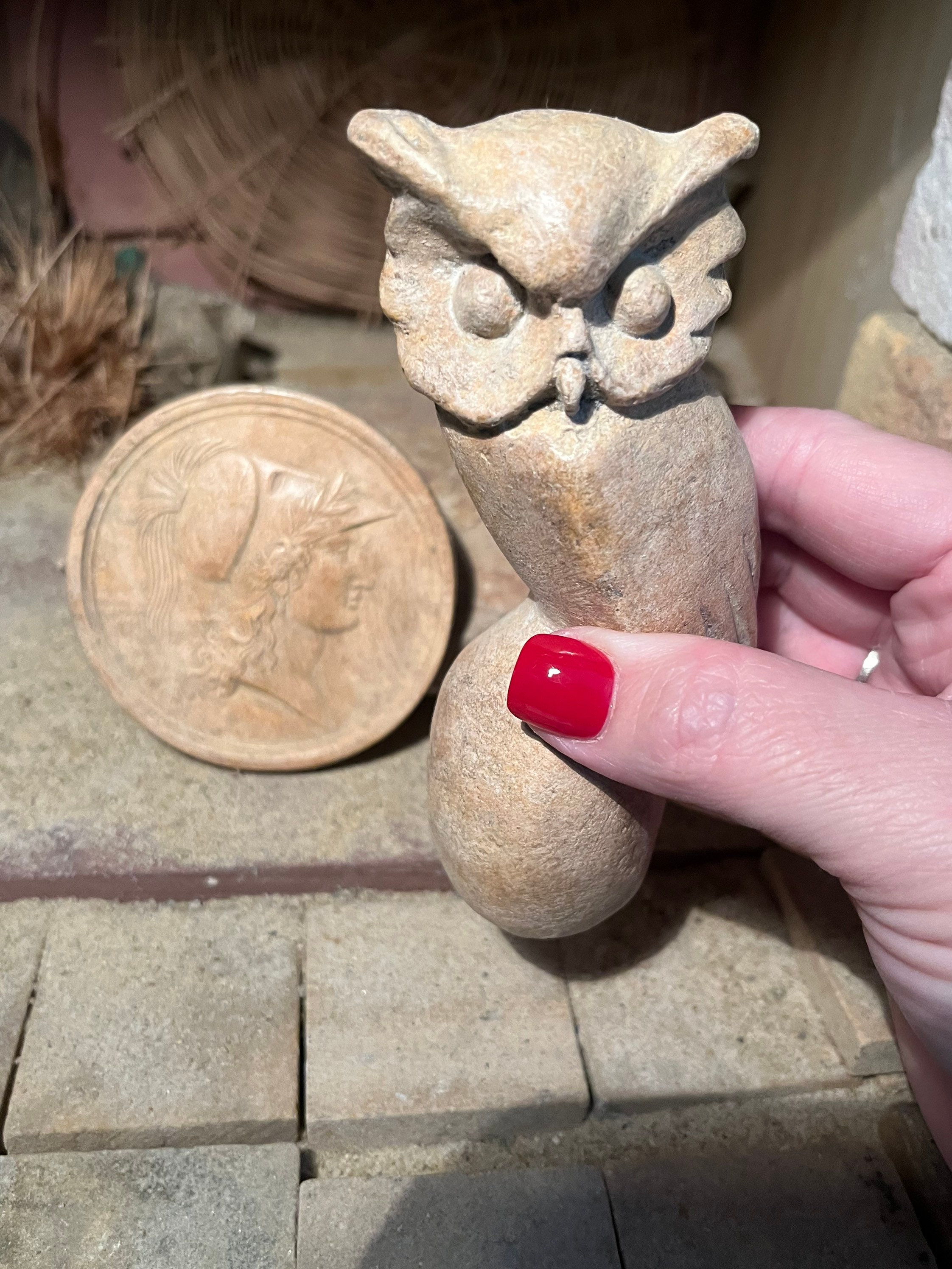 Her sacred animal was the owl which is included in an unusual looking statue form to make a delightful combination for a display.