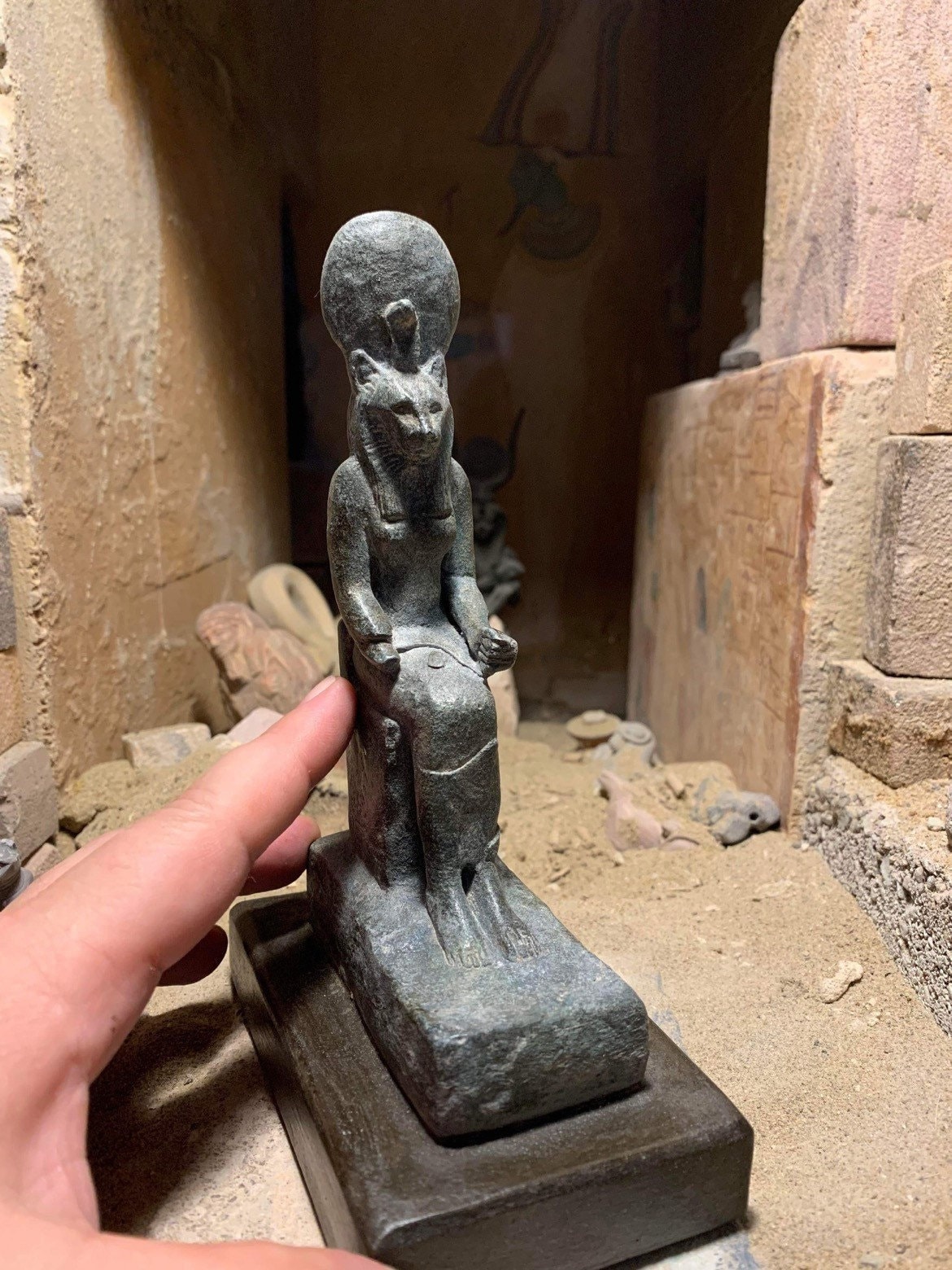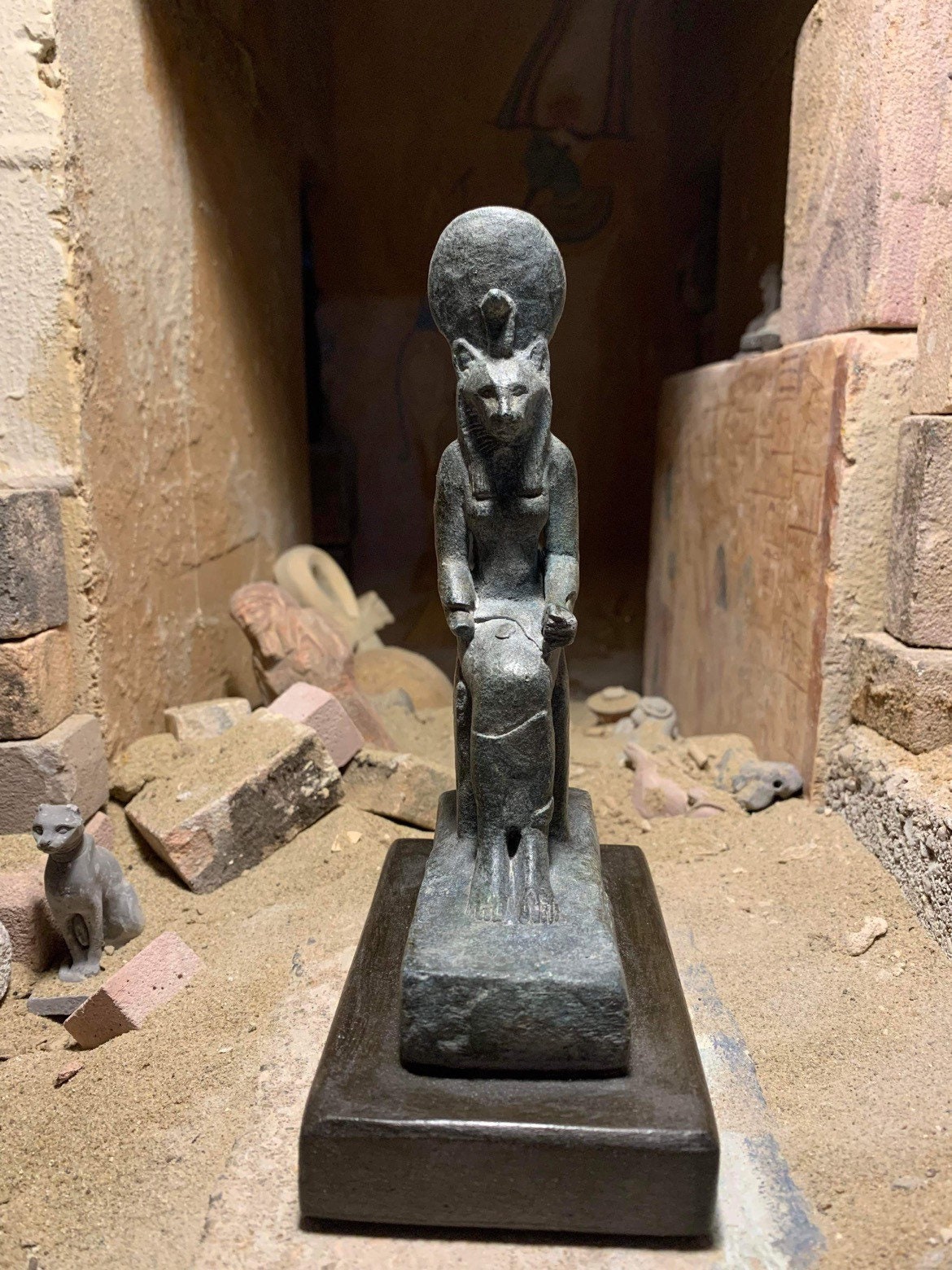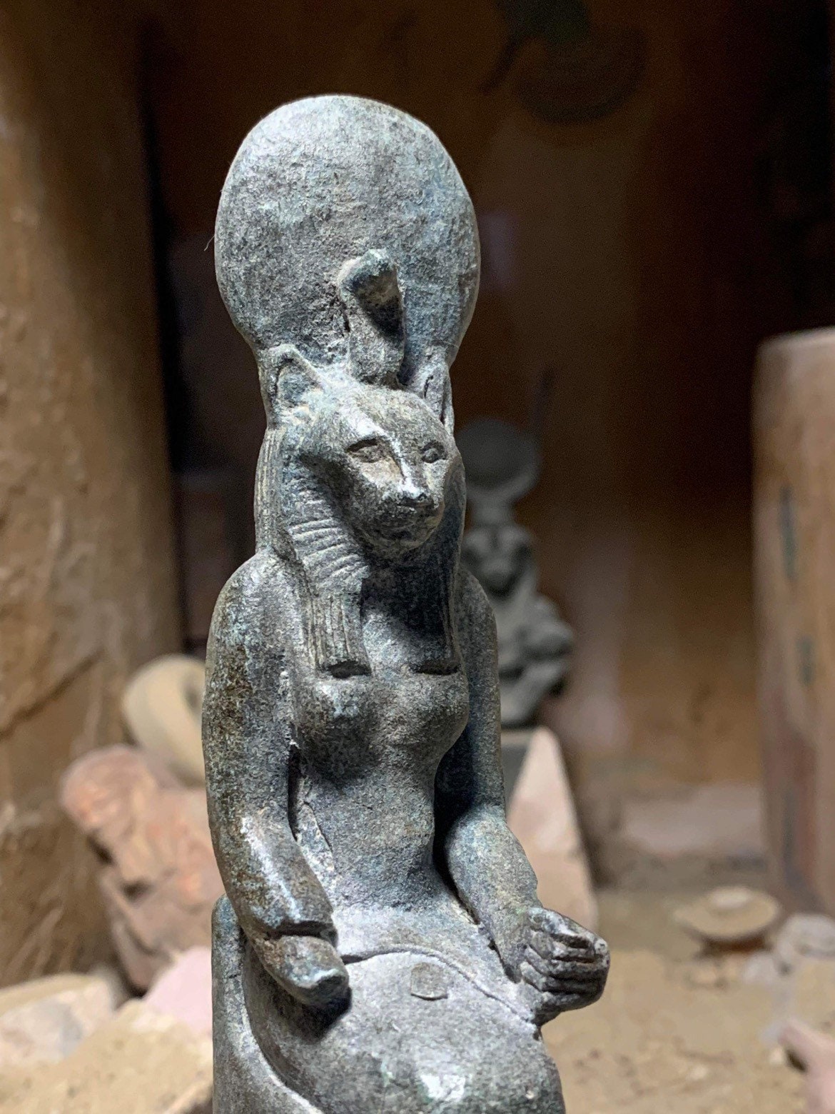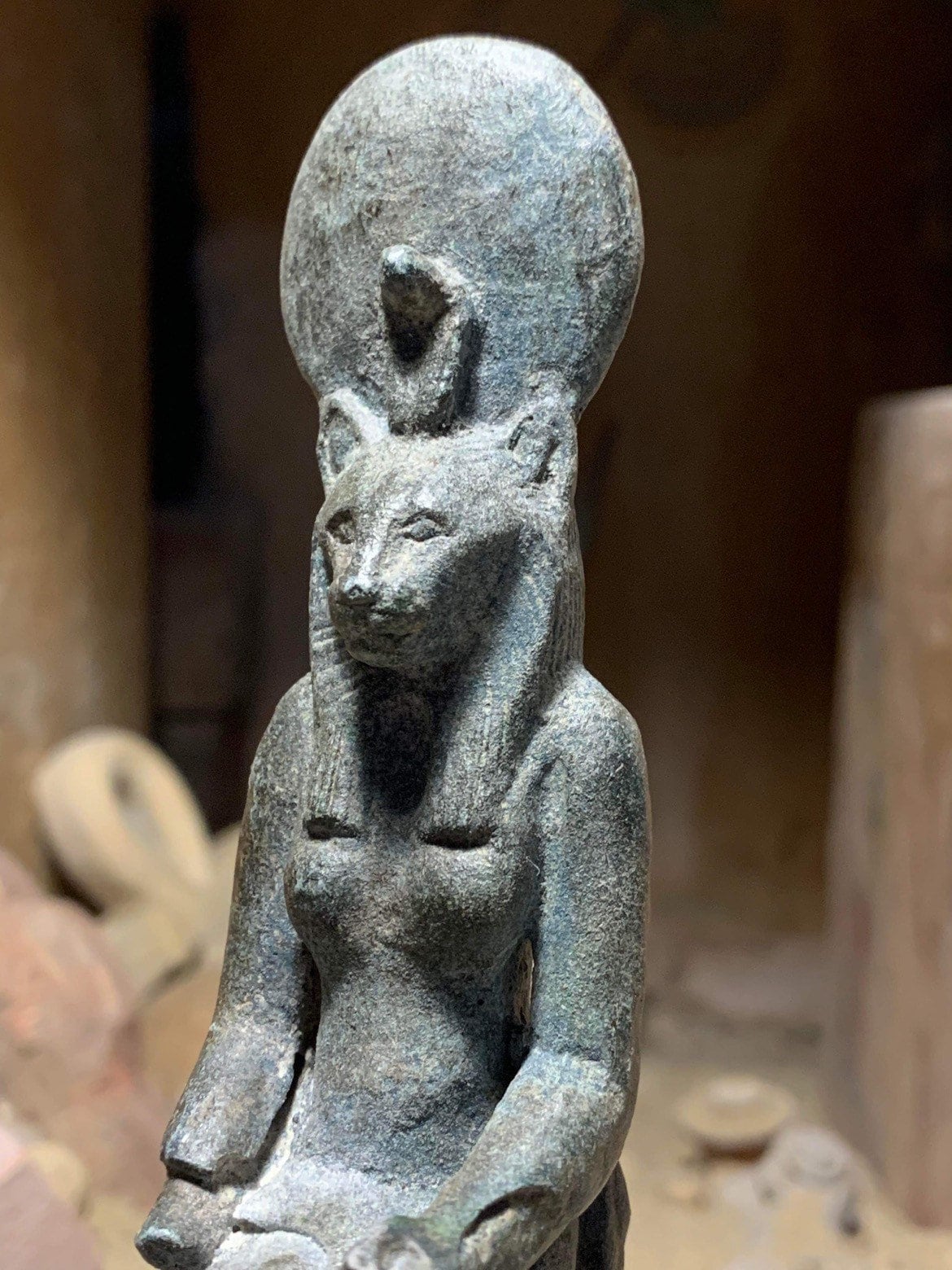 Also known as one of the daughters of Ra, the sun disc can be present in her iconography, a feature shared with Hathor and the less aggressive cat goddess Bastet.