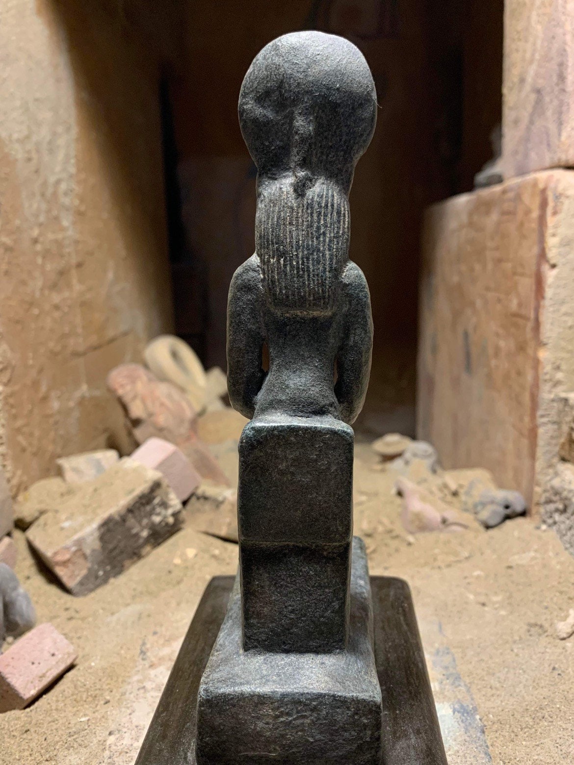 Made of a limestone and quartzite composition stone, Sekhmet has been given a well developed aged black patina. She is mounted upon a polished, felt lined stand.