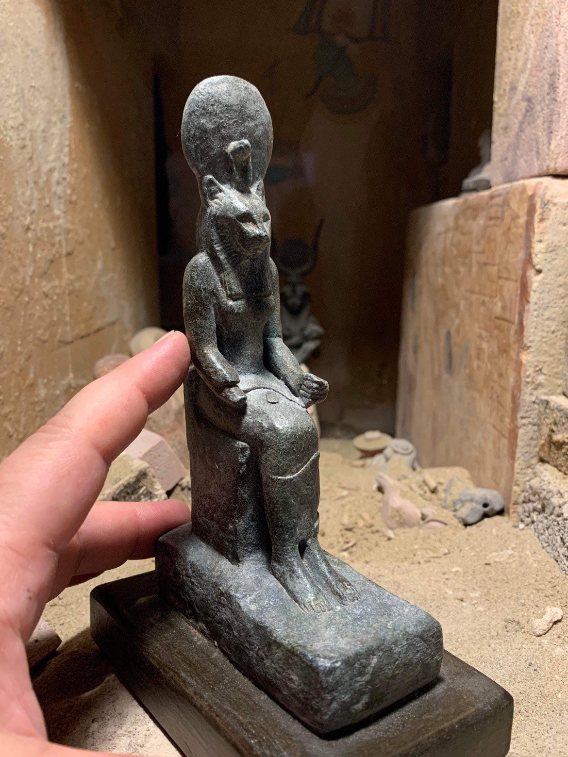 On offer here is a realistic replica statue of the powerful Egyptian goddess Sekhmet. Wearing a figure hugging dress she is seated wearing the sun disc of Ra on her head complete with protective divine cobra at it's base. The texture of the statue and the missing forearm give added authenticity.