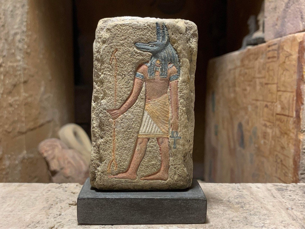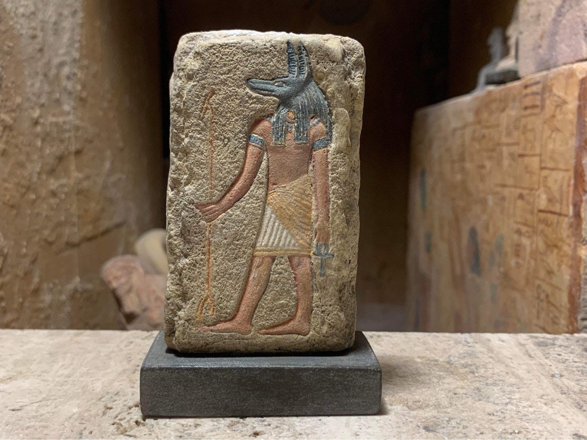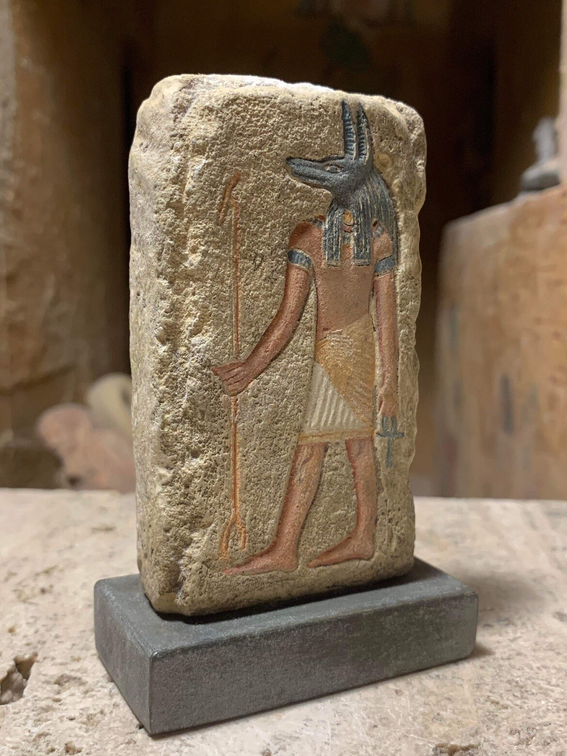 Anubis or Anpu as he was know in the Egyptian tongue, made the 1st mummy (Osiris / Assar) and was forever to be associated with mummification for all periods of Ancient Egyptian history. This small representation depicts Anubis holding a WAS/WASS sceptre which signifies dominion and mastery of his realm.