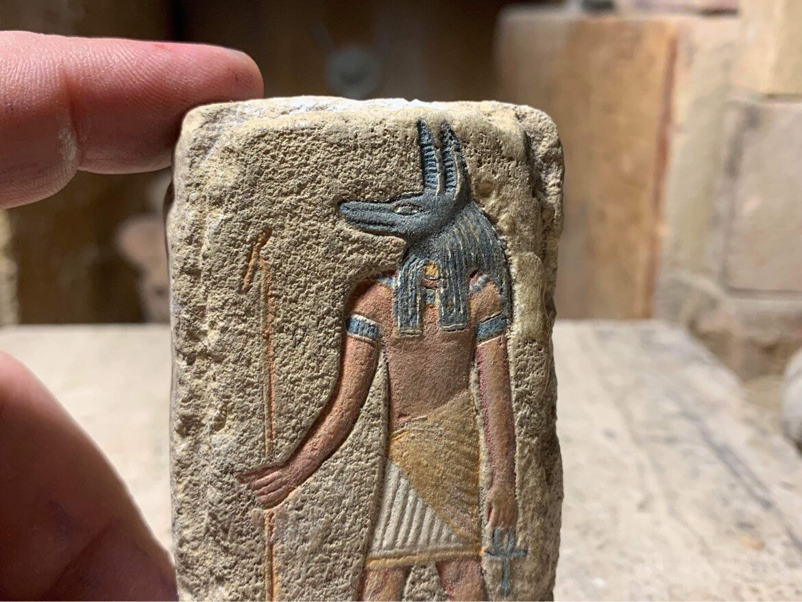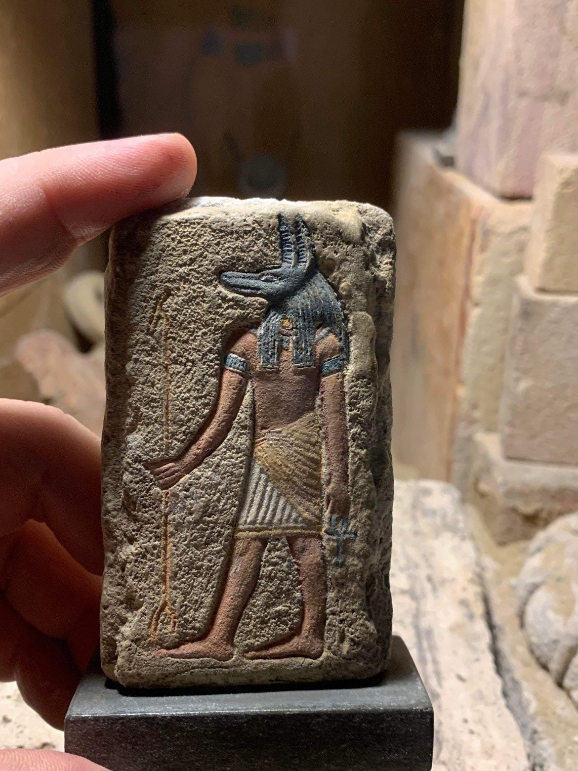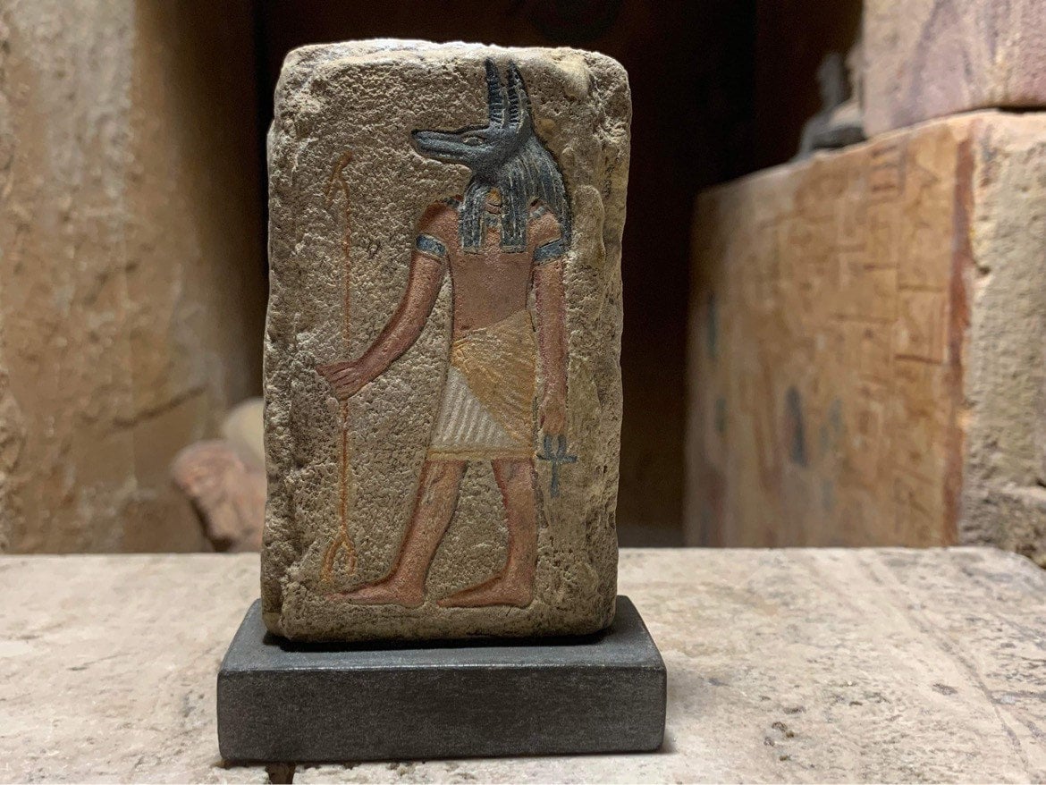 Anubis or Anpu as he was know in the Egyptian tongue, made the 1st mummy (Osiris / Assar) and was forever to be associated with mummification for all periods of Ancient Egyptian history. This small representation depicts Anubis holding a WAS/WASS sceptre which signifies dominion and mastery of his realm.