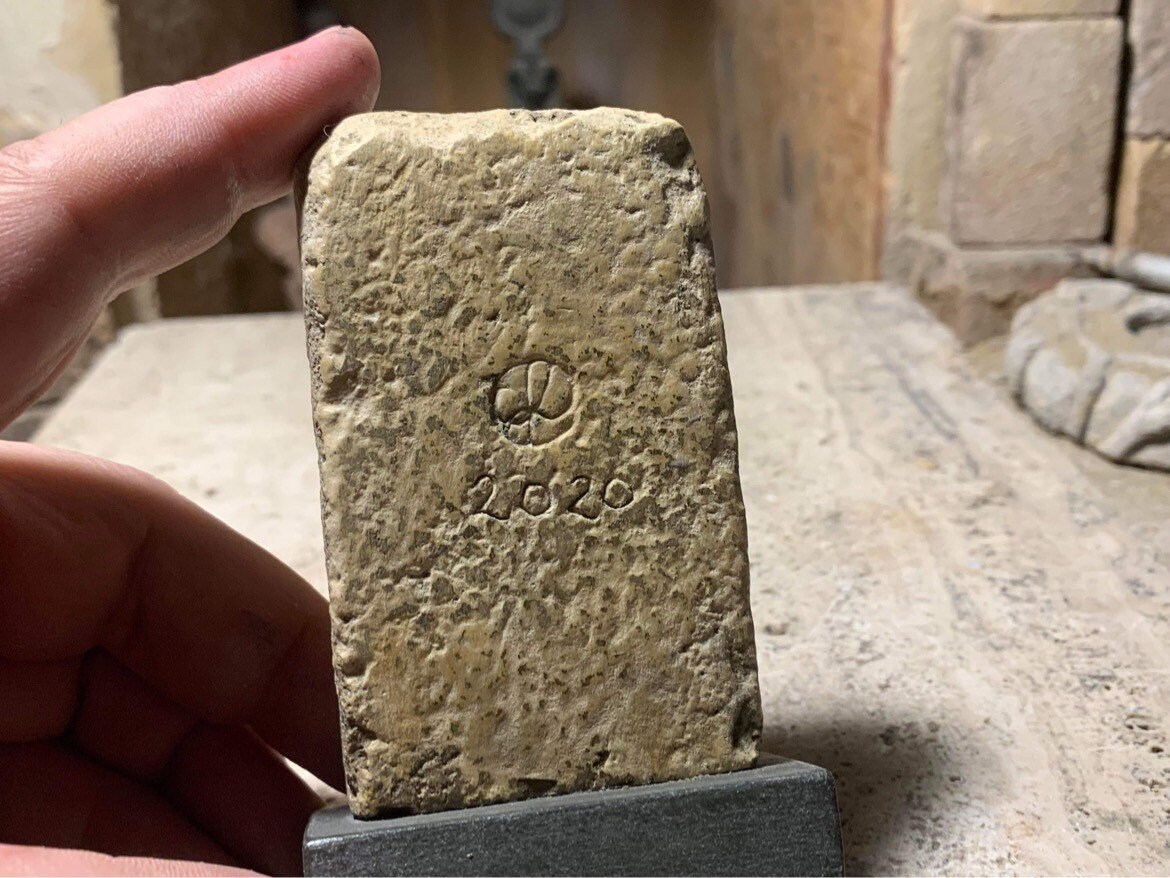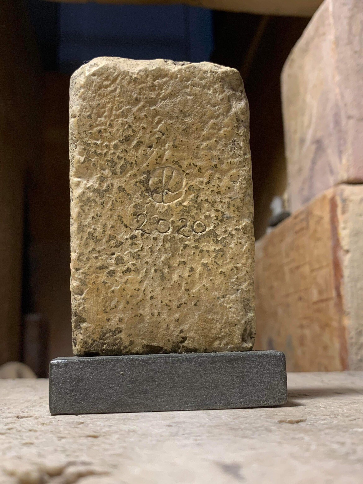 Made of a limestone and quartzite composition stone and has been mounted on a polished felt based stand and is signed on the back.