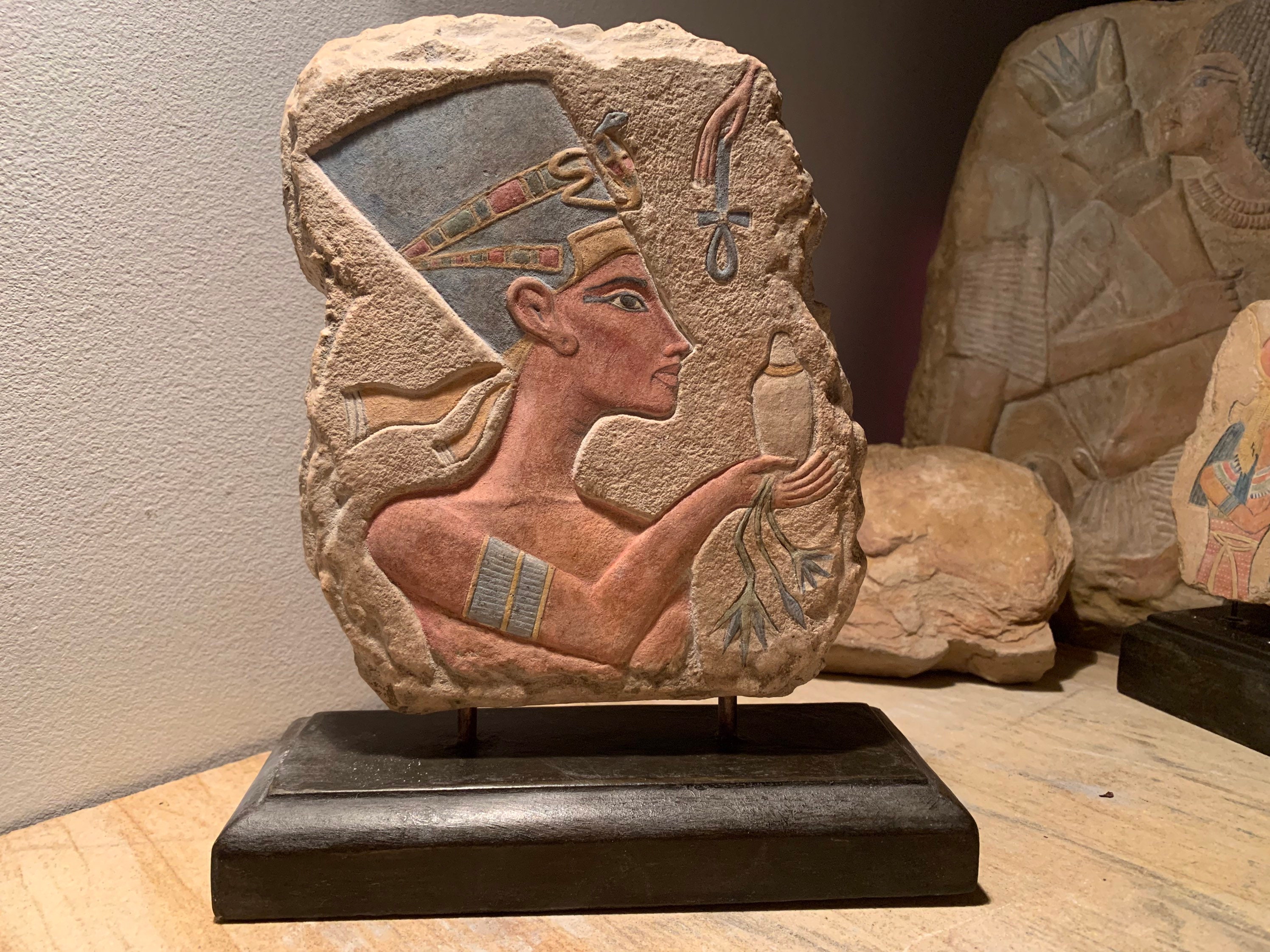 This actual piece shows subtle flesh tones, soft reds, yellow ochre, papyrus green, black & white and is dominated by the blue hues of that unique and magnificent crown that was her signature feature in sculpture and relief representations.