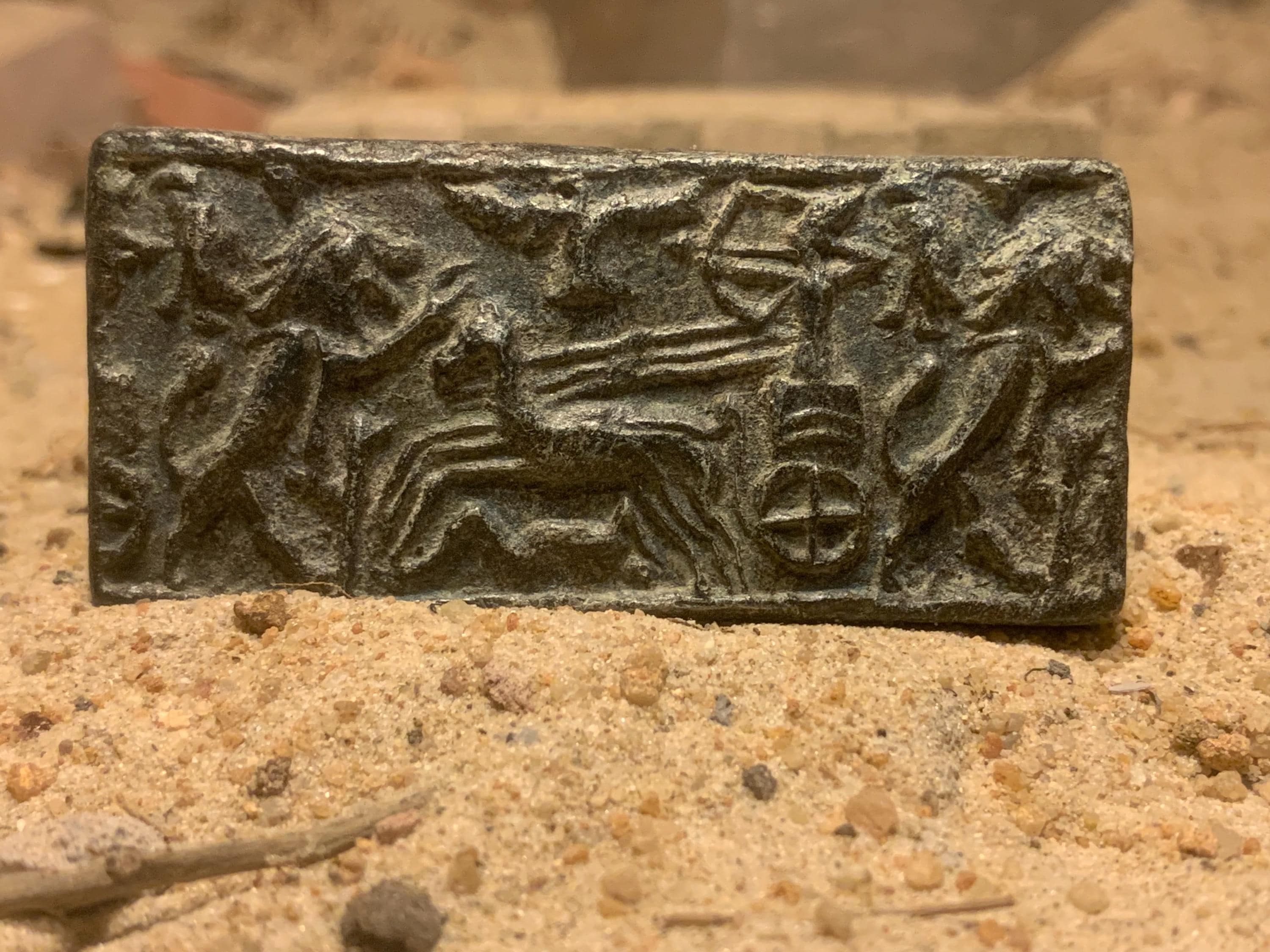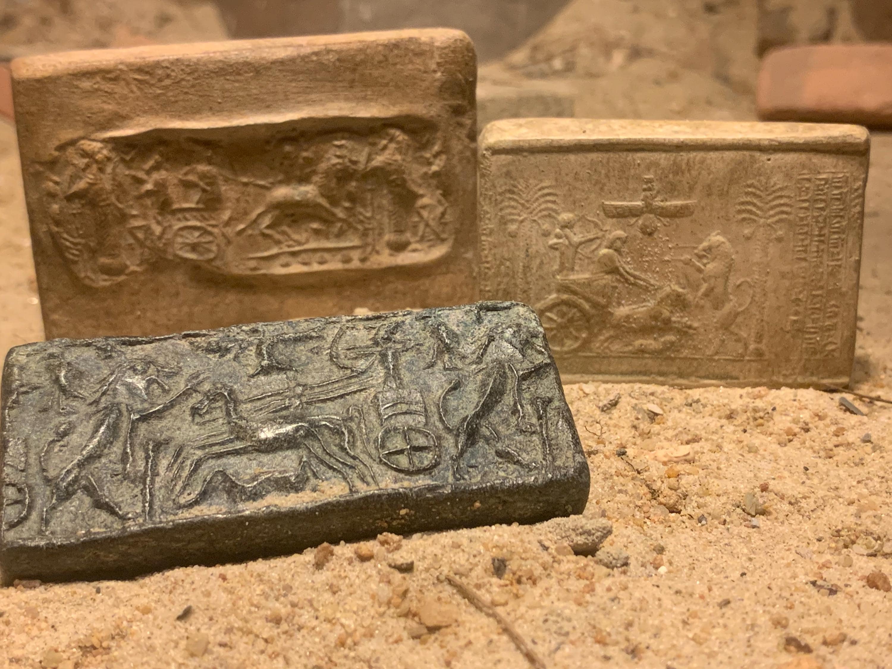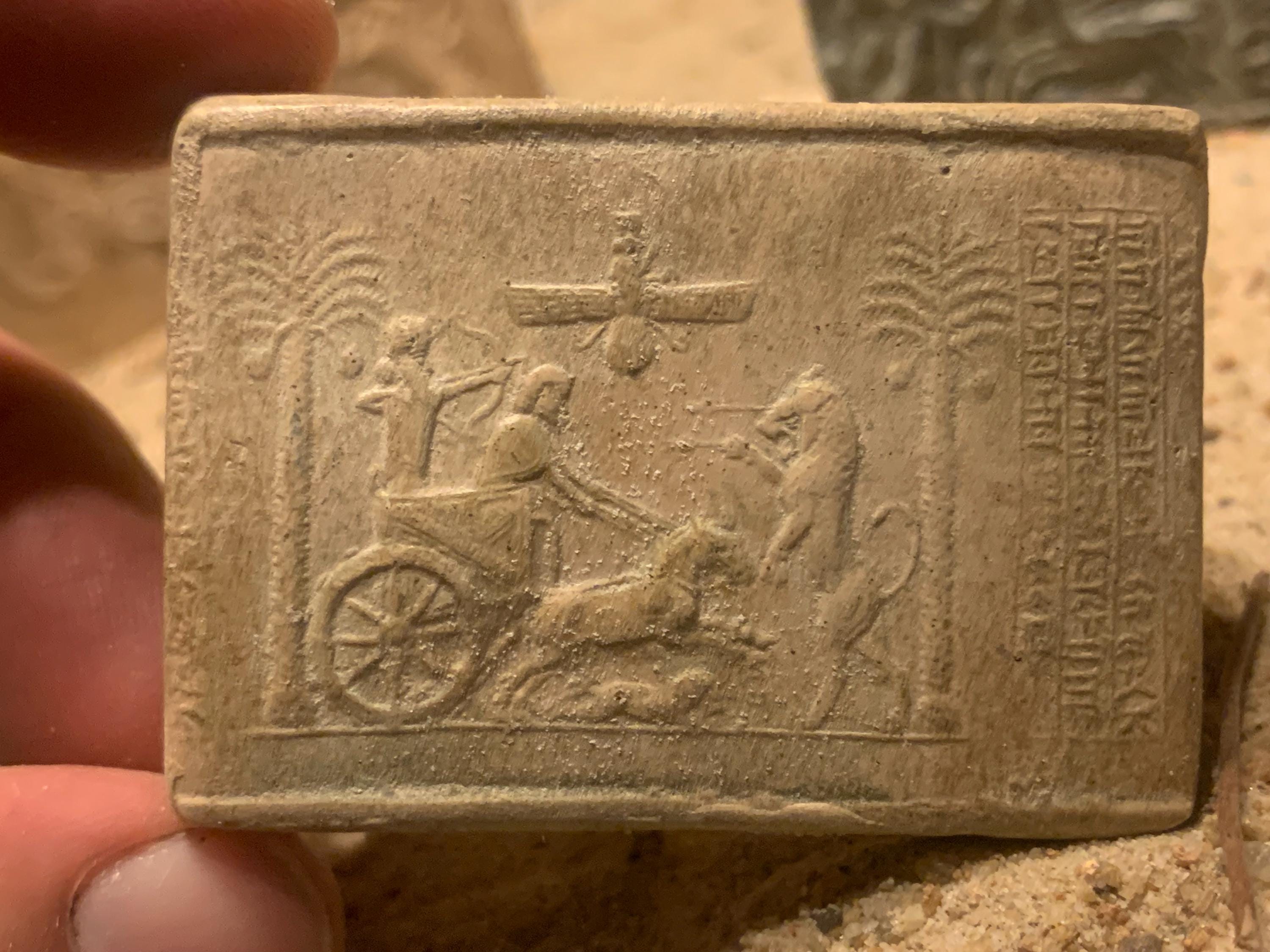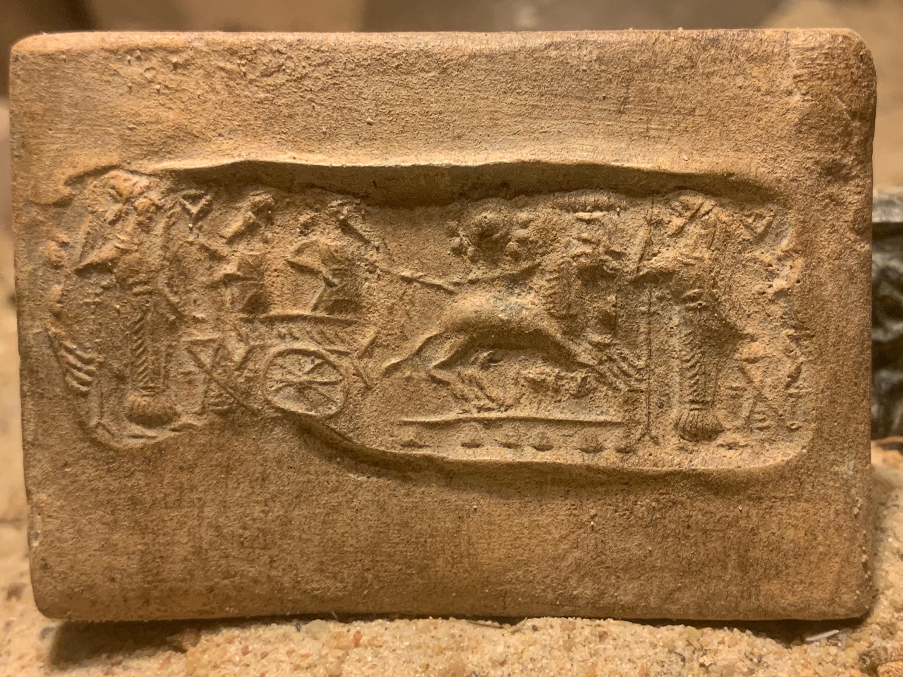 The Elamite cylinder seal impression replica features an early depiction of the chariot in military service. The invasion of Babylon by the Elamites, effectively ended the Kassite dynasty circa 1155 B.C.E.