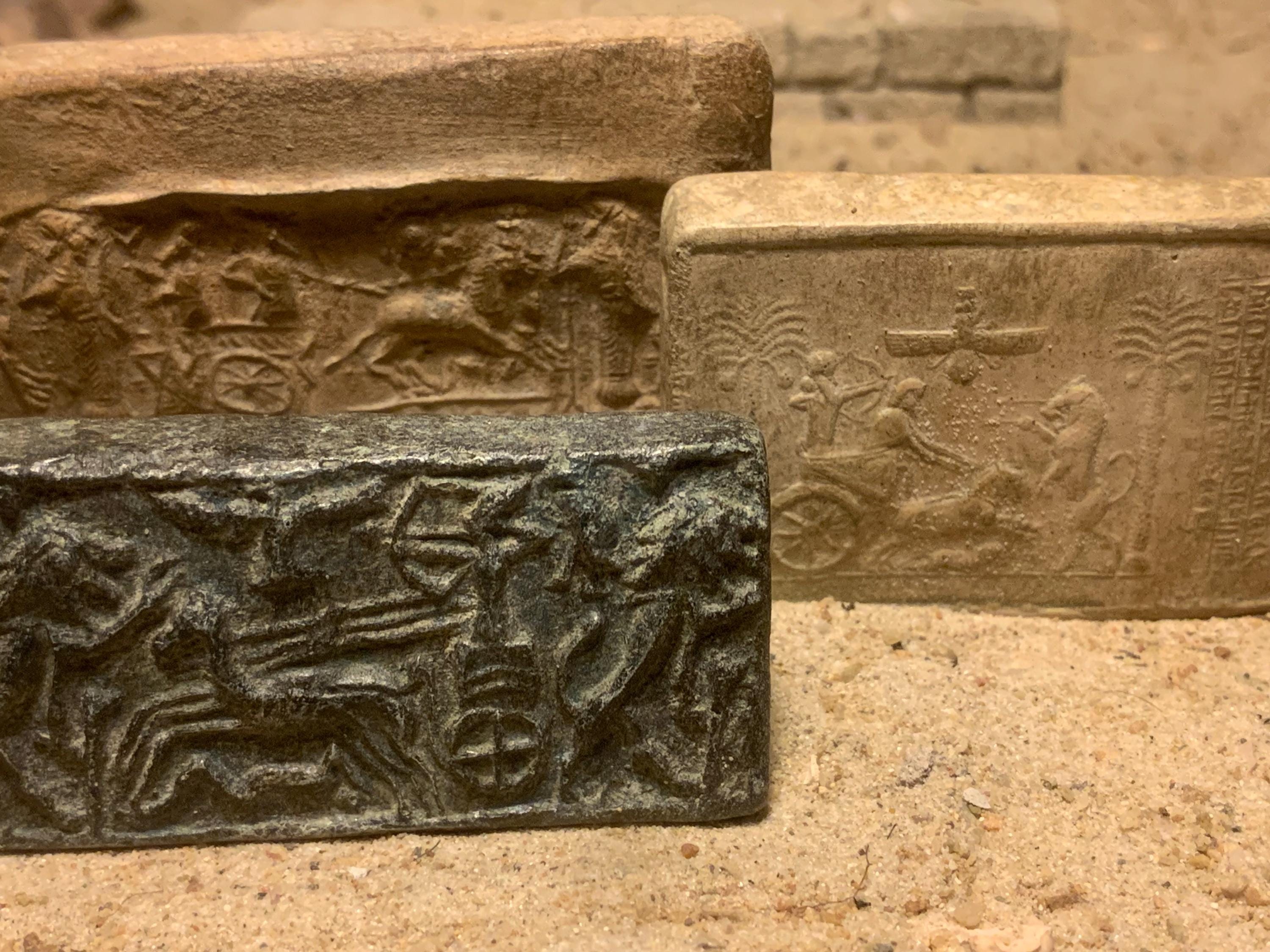 On offer here are a trio of replica cylinder seal impressions which feature the chariot at different stages of development and refinement. The early Ugarit version and the later Persian example maybe separated by many generations, but they share a common pride and desire to advertise the two wheeled marvel of the age.