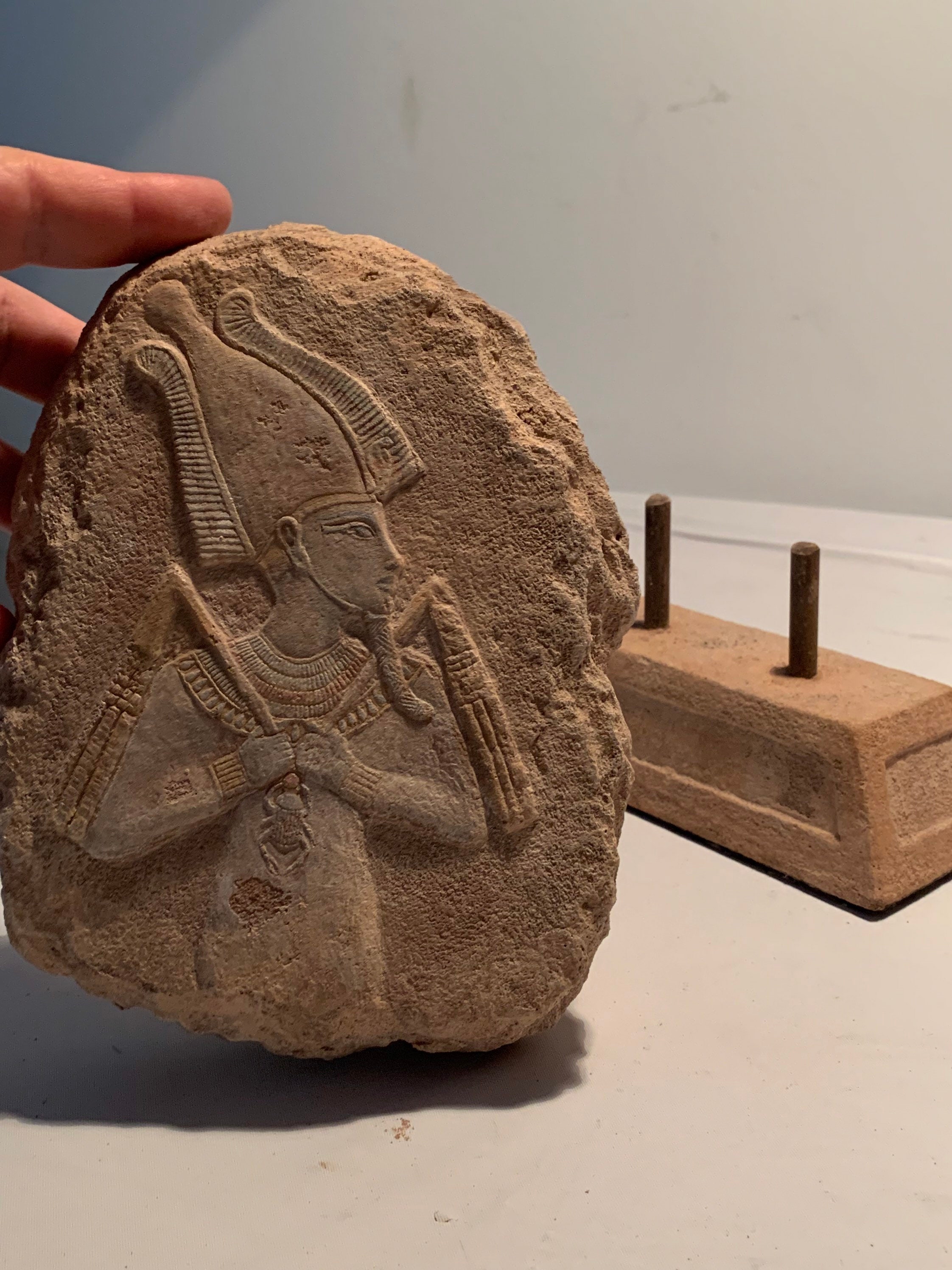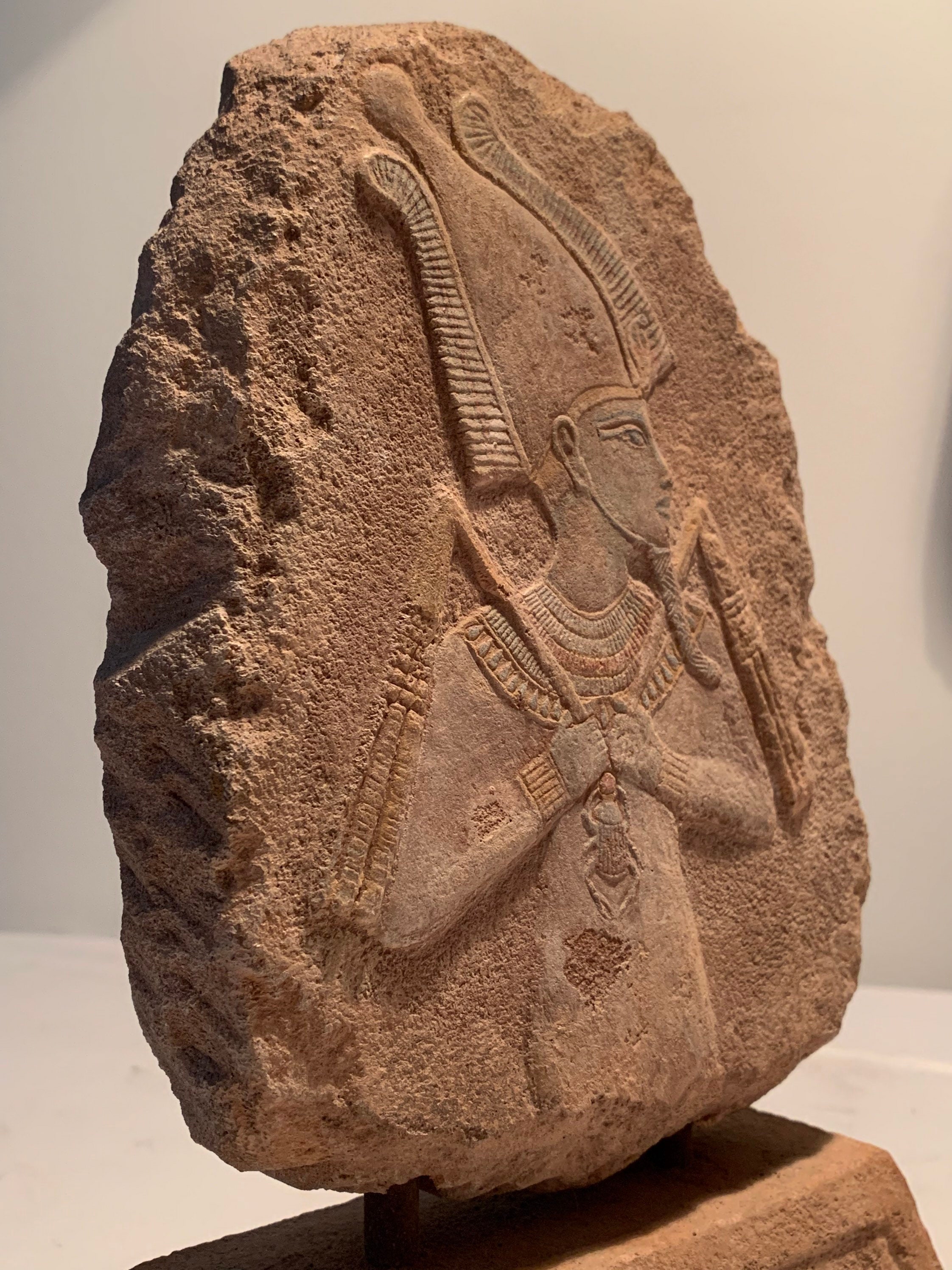 On offer here for the first time in over a decade, one of my rare carvings of Osiris. Found in the old archive on the weekend, it was produced in 2009. This is a very realistic looking fragment with subtle colours of the ancient Egyptian painter’s palette enlivening the figure and countenance of this most important god of the afterlife.