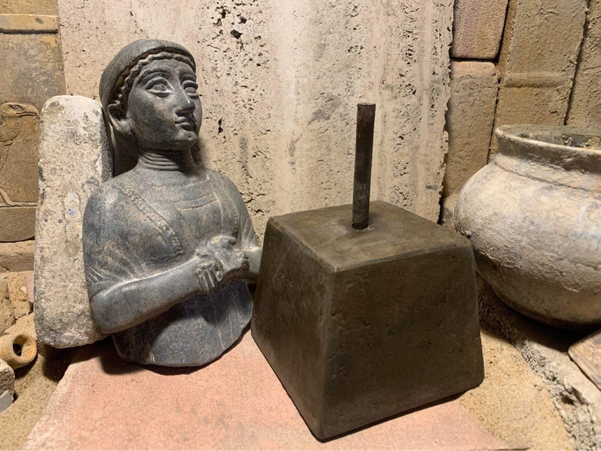 On offer here is a rare replica statue of the so called 'wife of Gudea' or the 'First lady of Lagash'. She has a distinguished face and her hair is tied back with a ribbon. She wears a fine cloak with a hint of embroidery and poses with hands clasped in a sign of prayer. It is one of the earliest and finest statues to depict a woman of supreme importance associated with the very heart of the temple.
