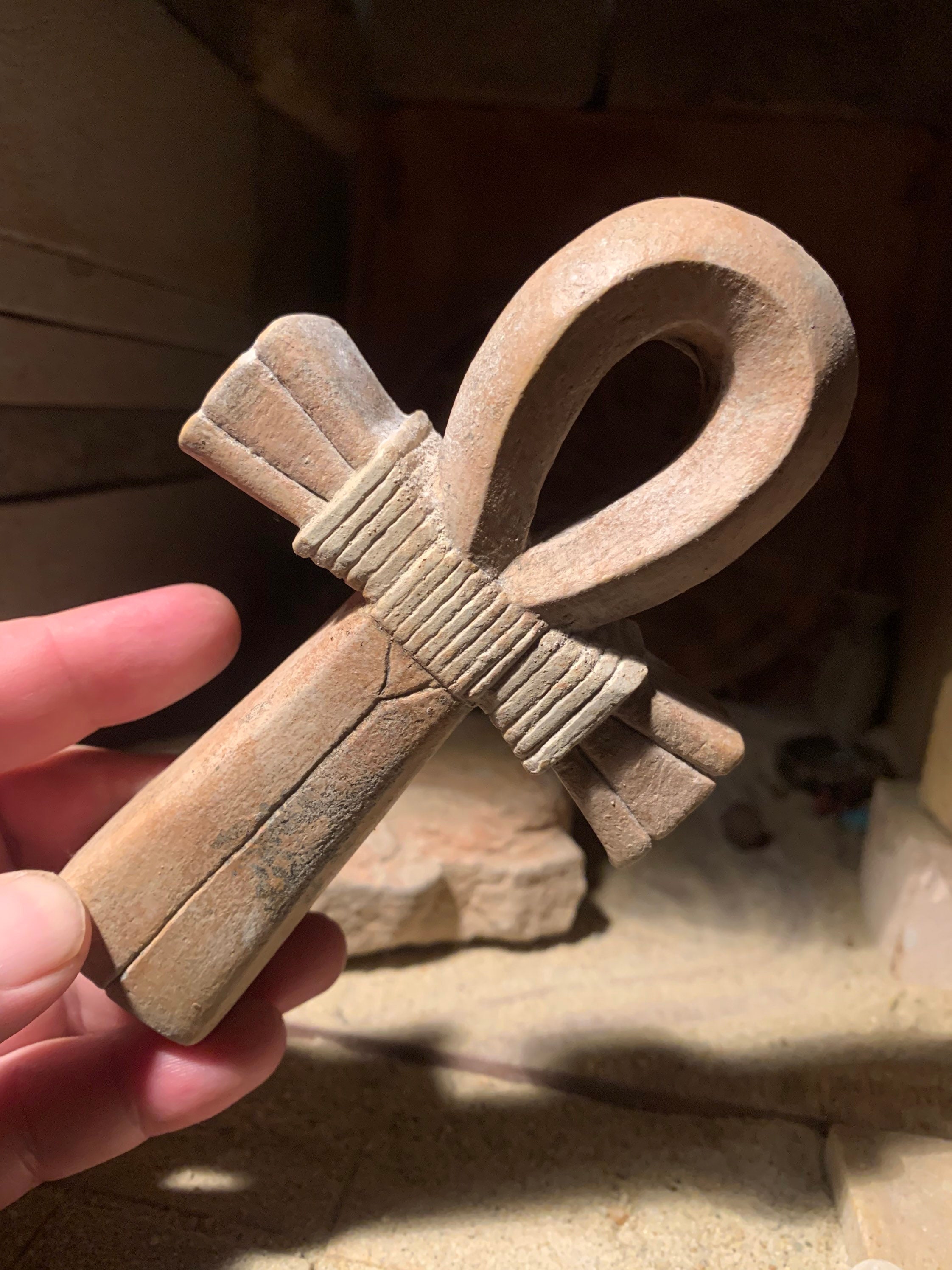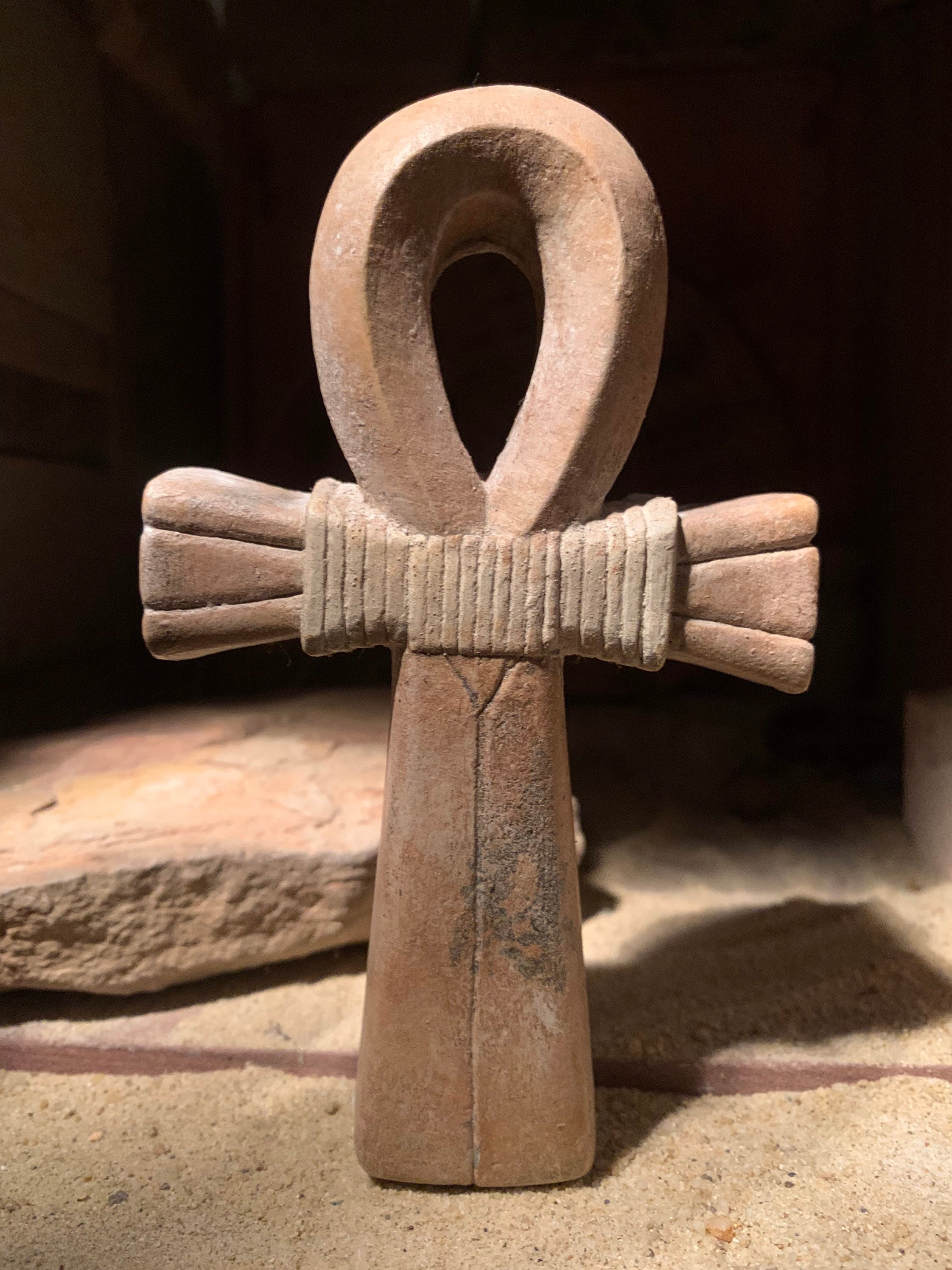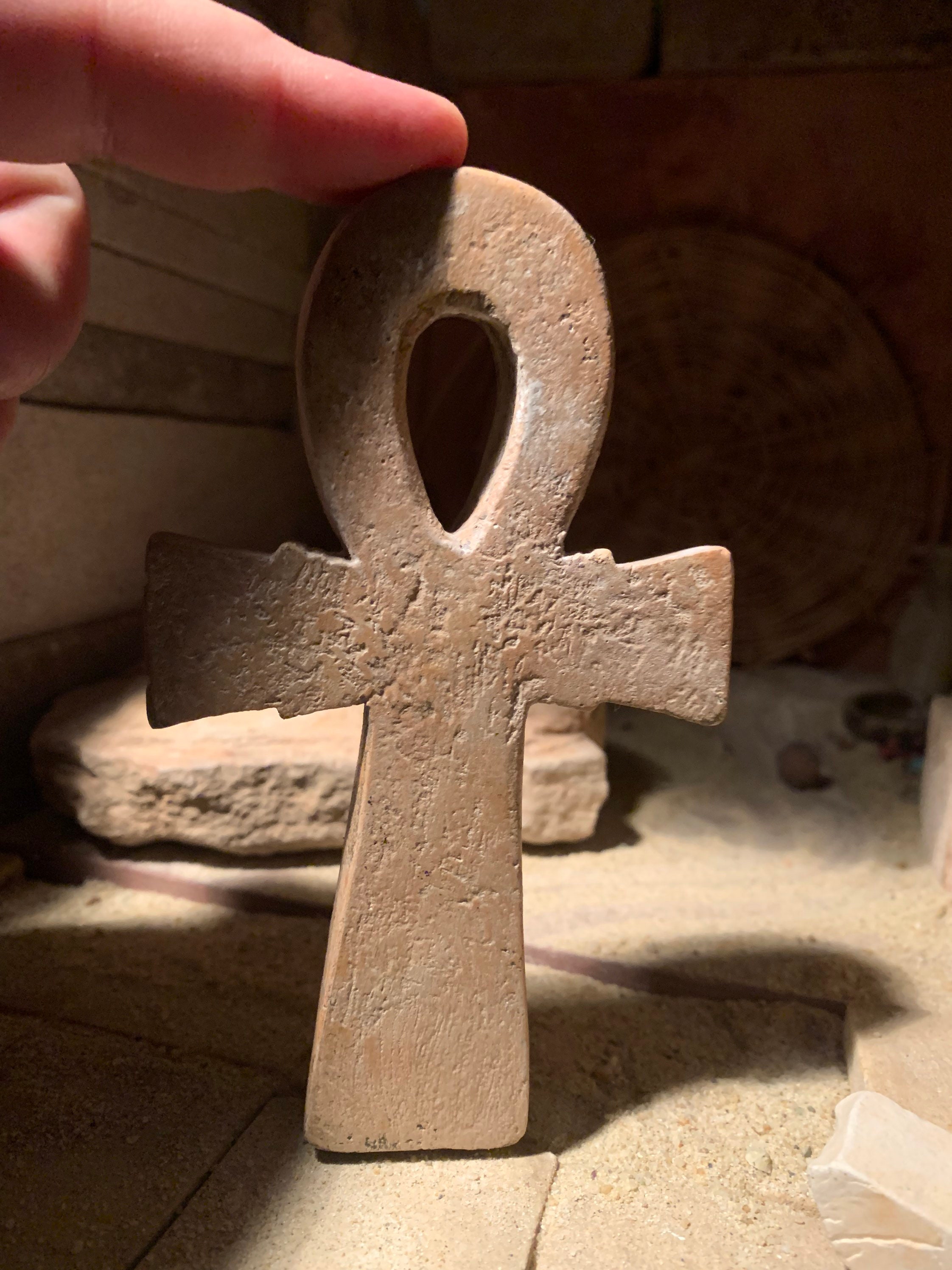 The Ankh is one of the most well known symbols of ancient Egypt and is a symbol of life and fertility. Made of a limestone and quartzite composition it has an aged ochre patina with highlights in white.