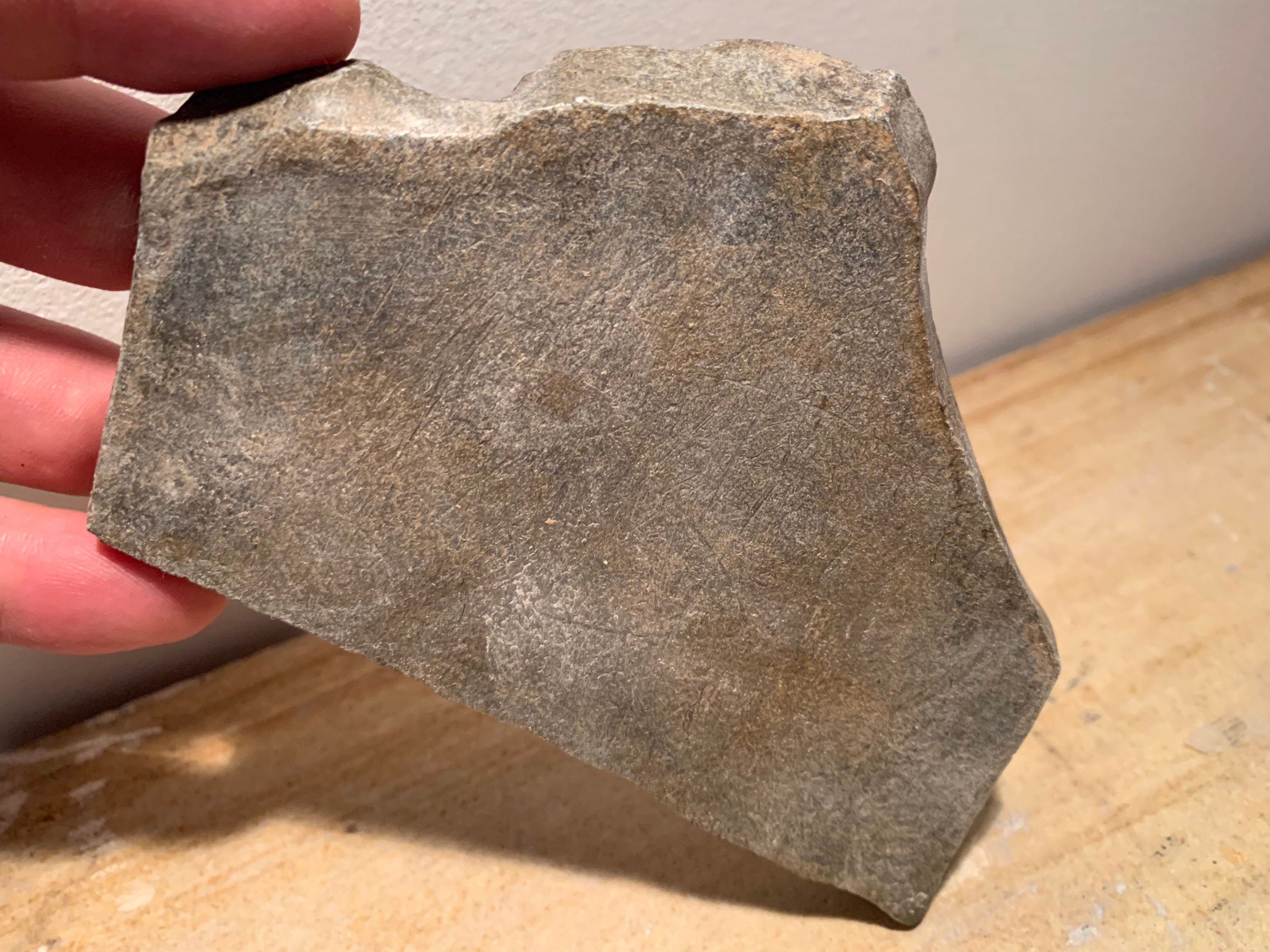 Made of a limestone and quartzite composition stone it has a well developed aged slate black patina.