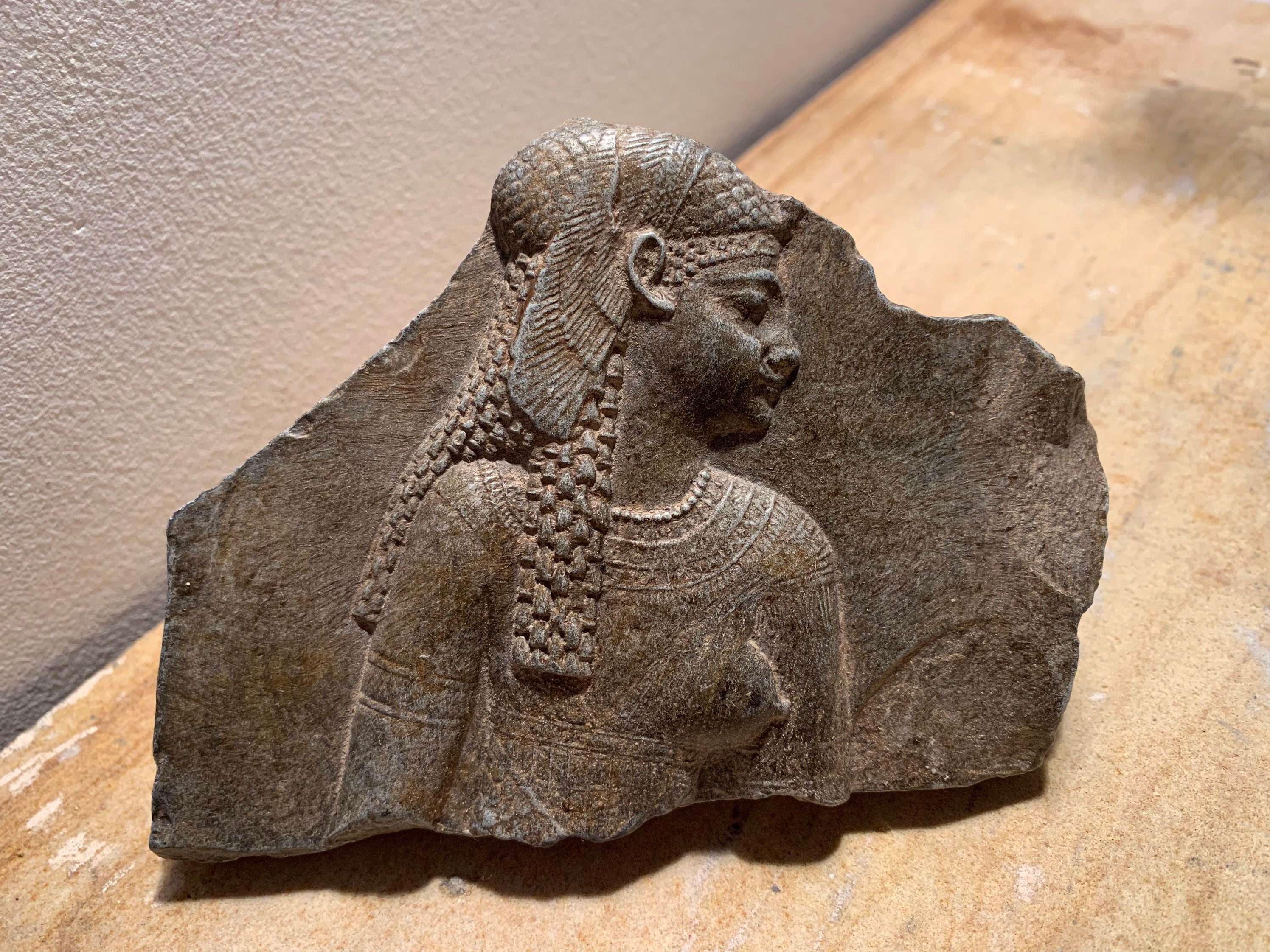 This very realistic fragment replica shows one of the best known surviving portraits of the legendary Cleopatra - the last Queen of Egypt. This was Ptolemaic style at its finest with typical high relief jutting above the surface plain of the stone displaying intricate details of face and costume.