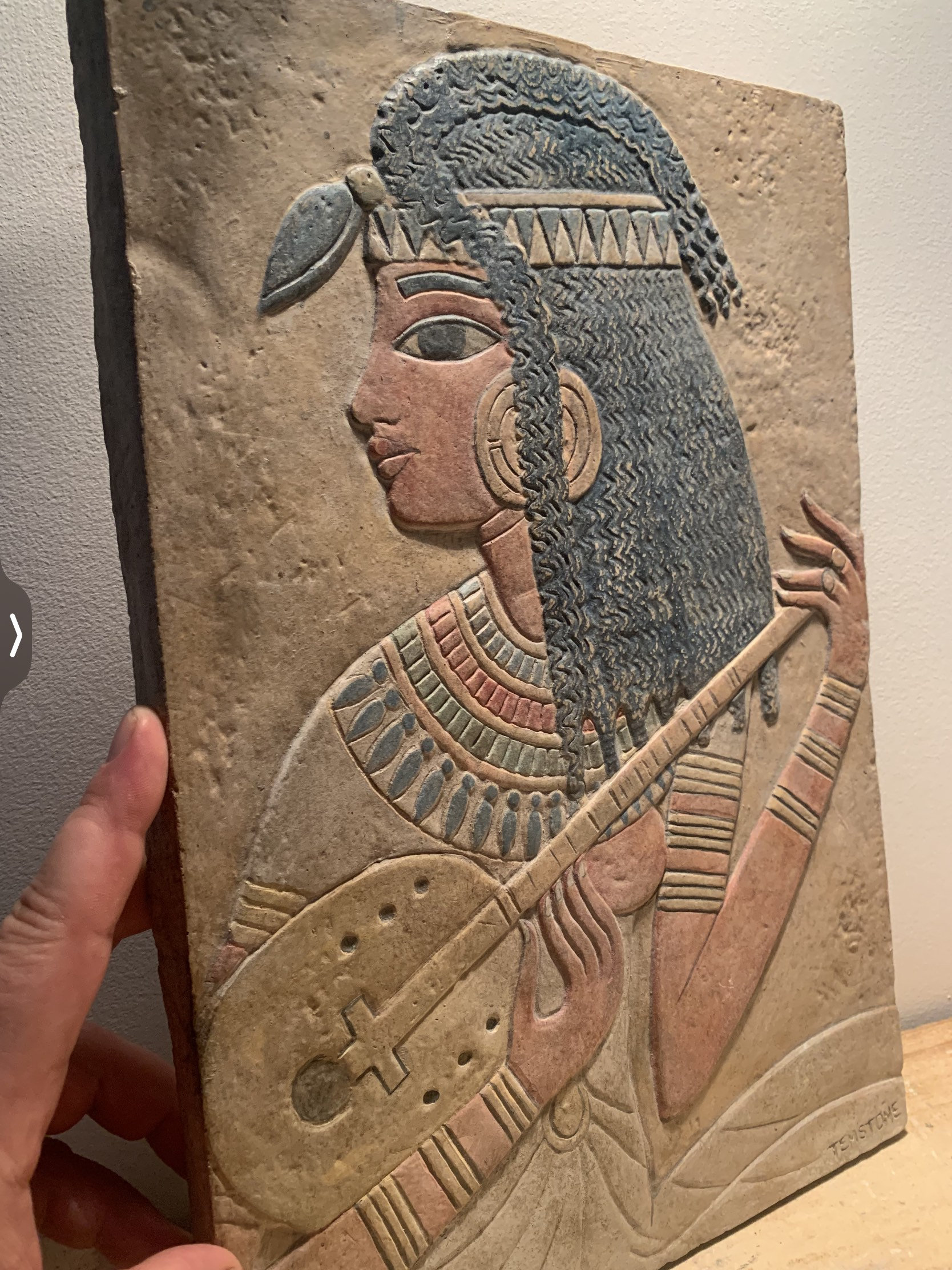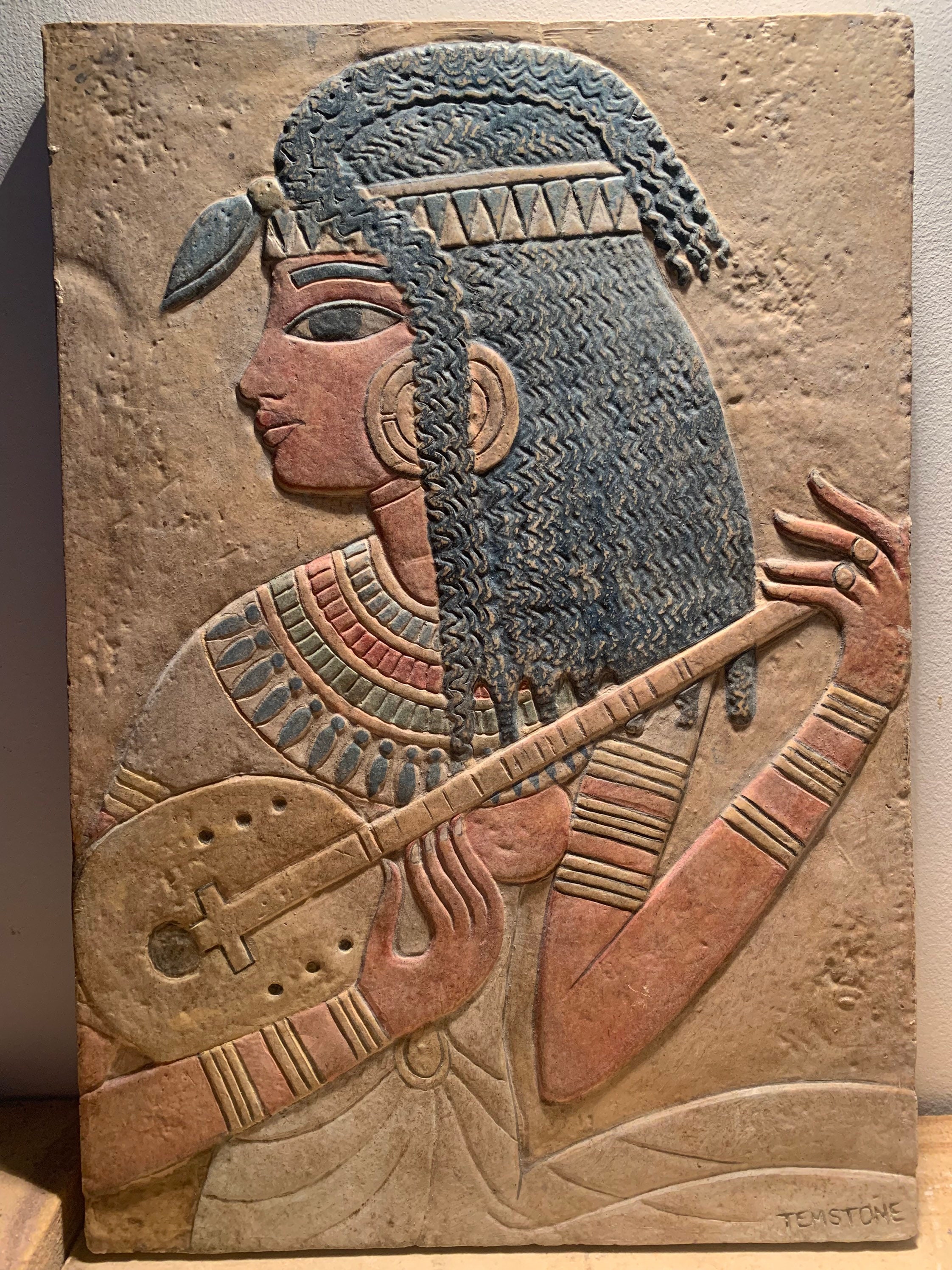 The design was based on the many Egyptian musicians that were depicted on the walls of homes and tombs alike during the 18th dynasty. The large eye and fluid fingers of the lady suggest depictions created in the reign of Amenhotep III.