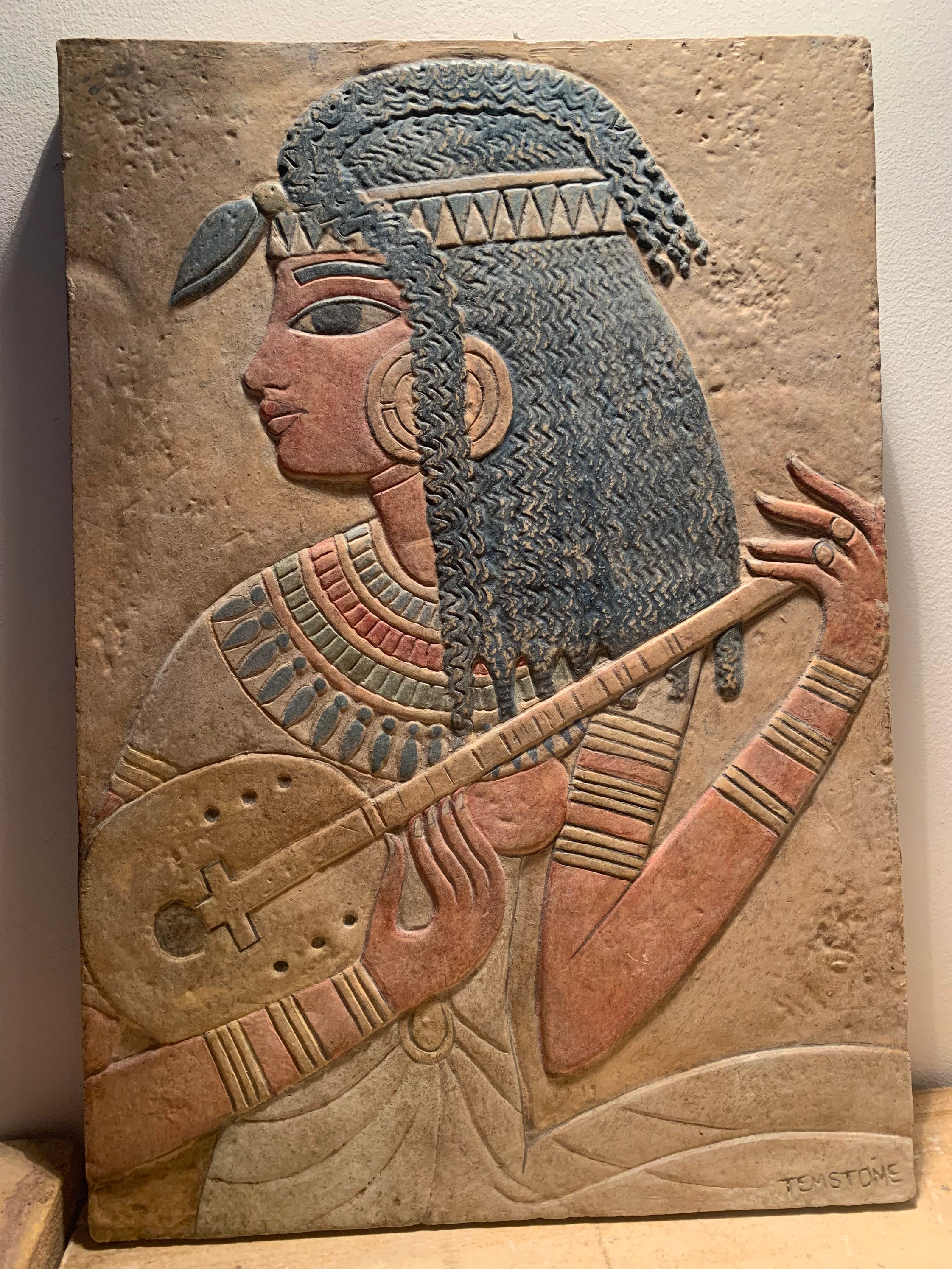 Made of Temstone which is no longer available, this piece dates to about 2004. I have added some subtle painted details to give it an ancient look and carefully drilled an angled hole on the back so she can be mounted as a wall feature if you so wish.