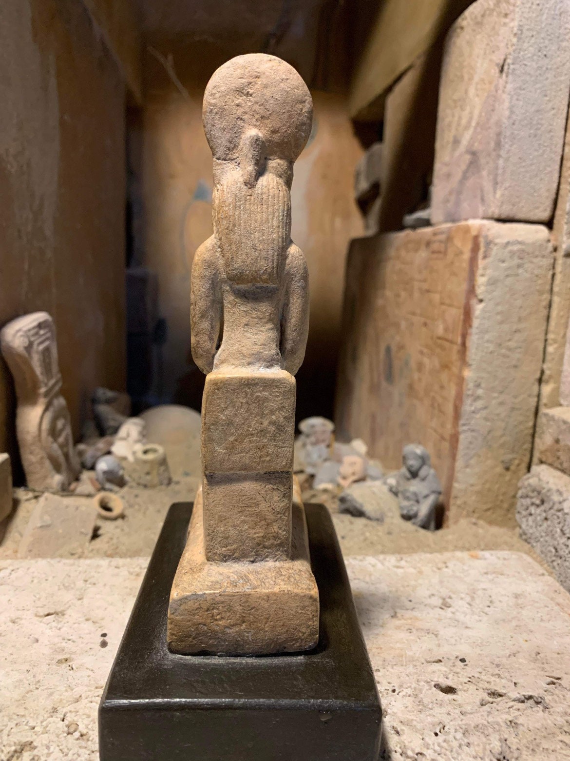 On offer here is a realistic replica statue of the powerful Egyptian goddess Sekhmet. Wearing a figure hugging dress she is seated wearing the sun disc of Ra on her head complete with protective divine cobra at it's base. The texture of the statue and the missing forearm give added authenticity.