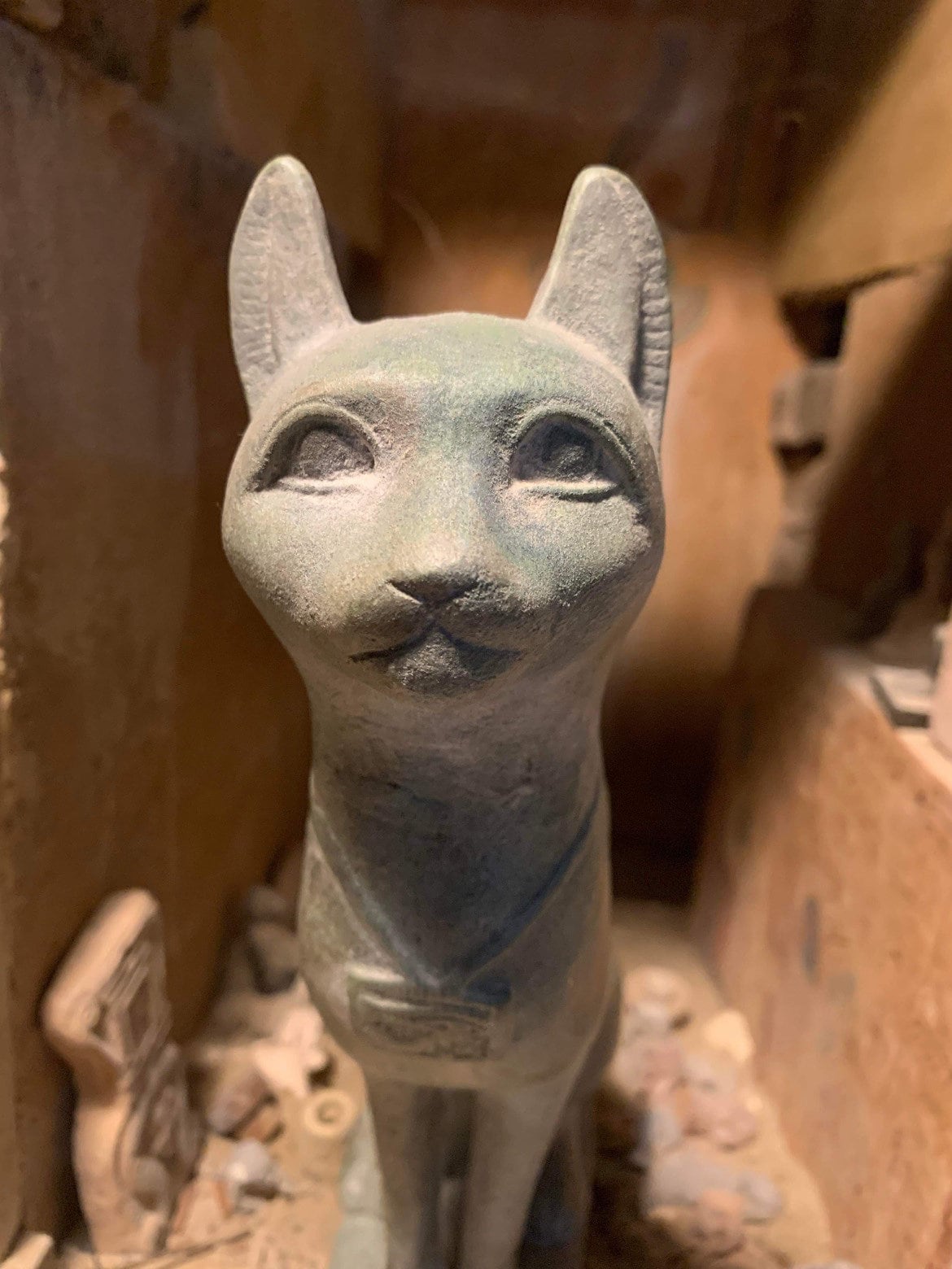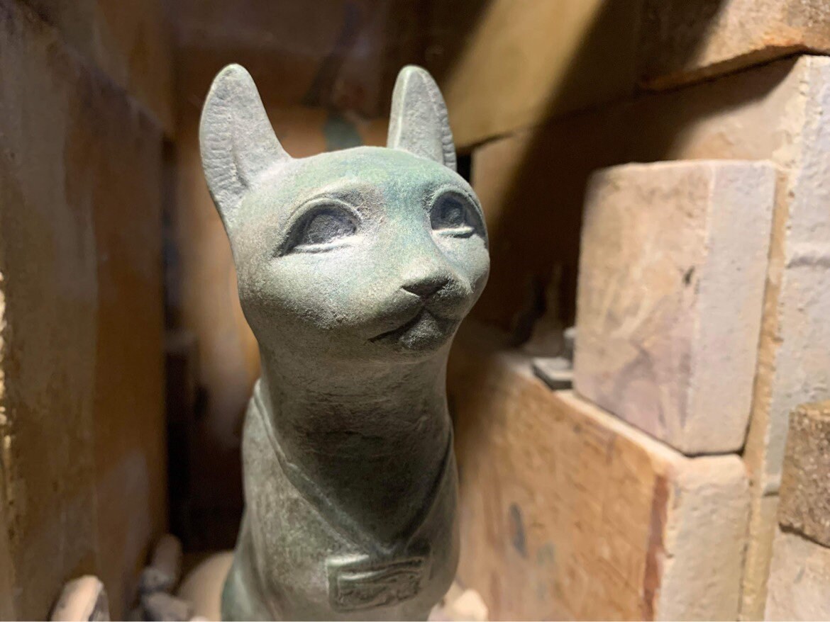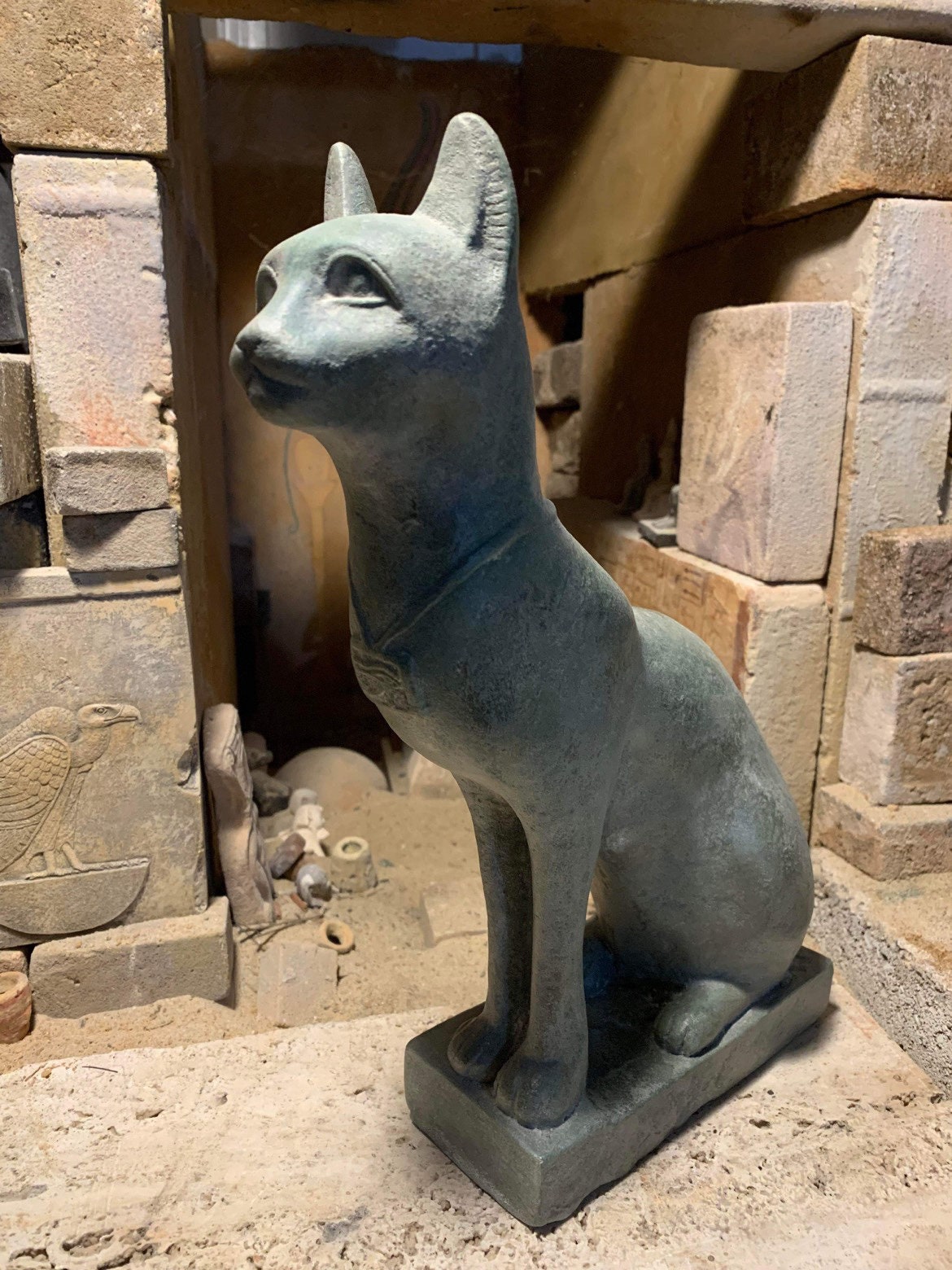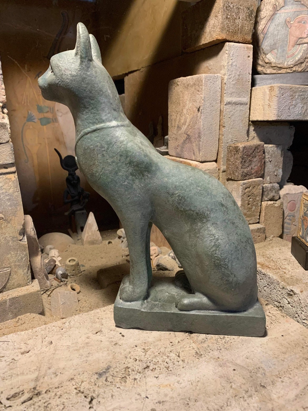 On offer here, is a large and charming statue replica of the goddess Bast. Unavailable since 2017 she is coloured in a realistic ancient green patina to give the impression that it could have been excavated from a delta temple offering thousands of years ago.