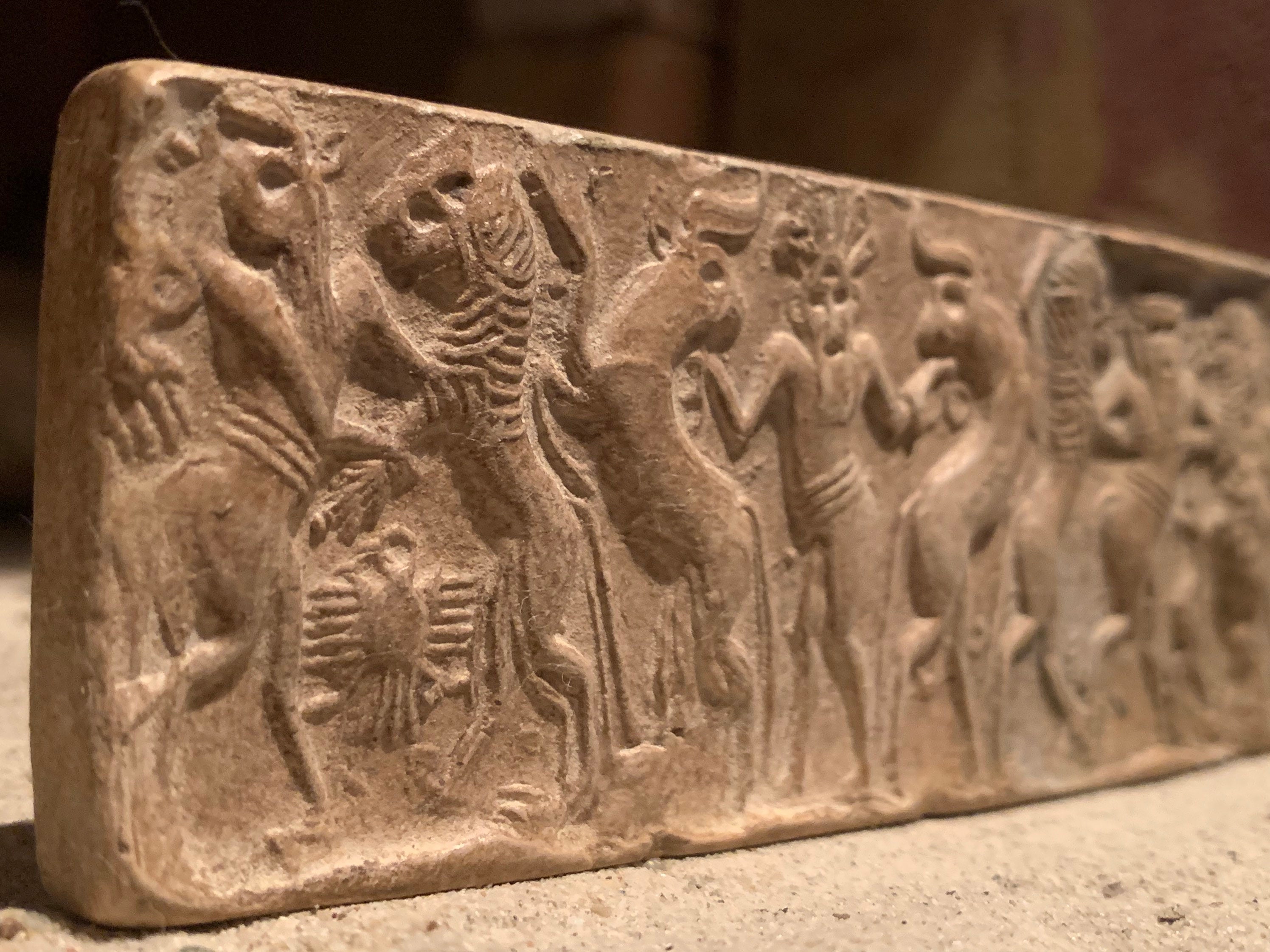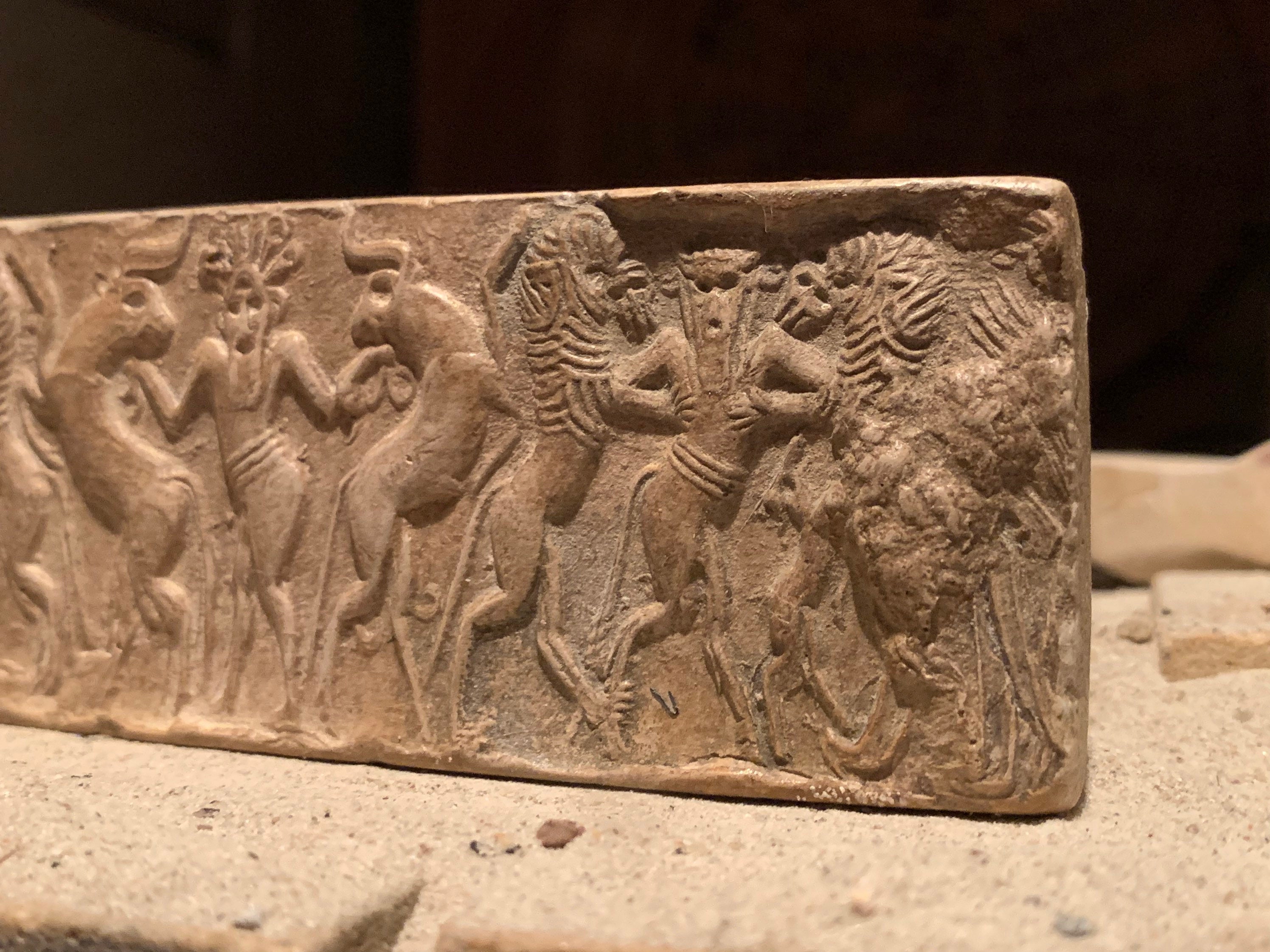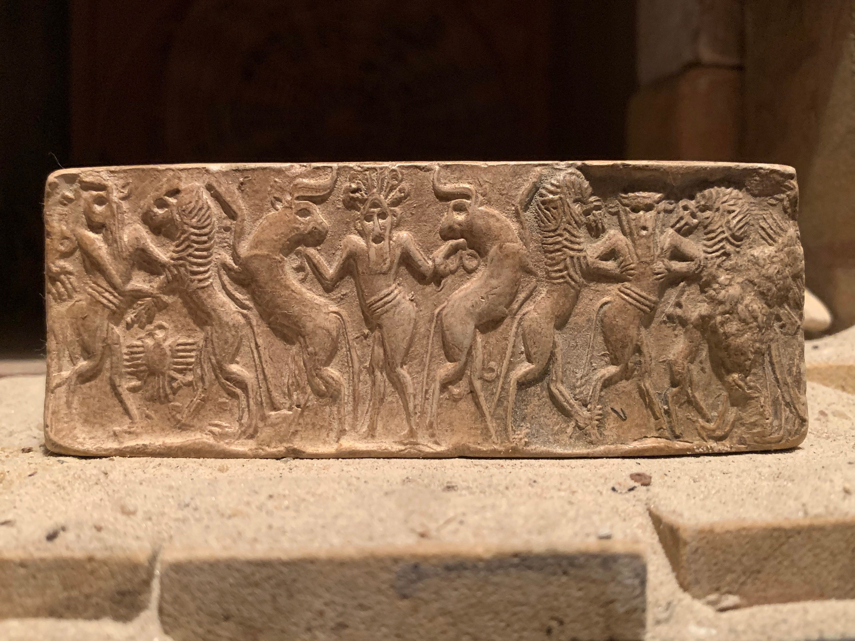 In this example the hero of the scene holds a bull in each hand in the centre. To the left the 'bull man' seen in profile fights a rampant lion while on the far right, this time a full faced bull man fights two lions. A small ibex can be seen leaning against the right lion.