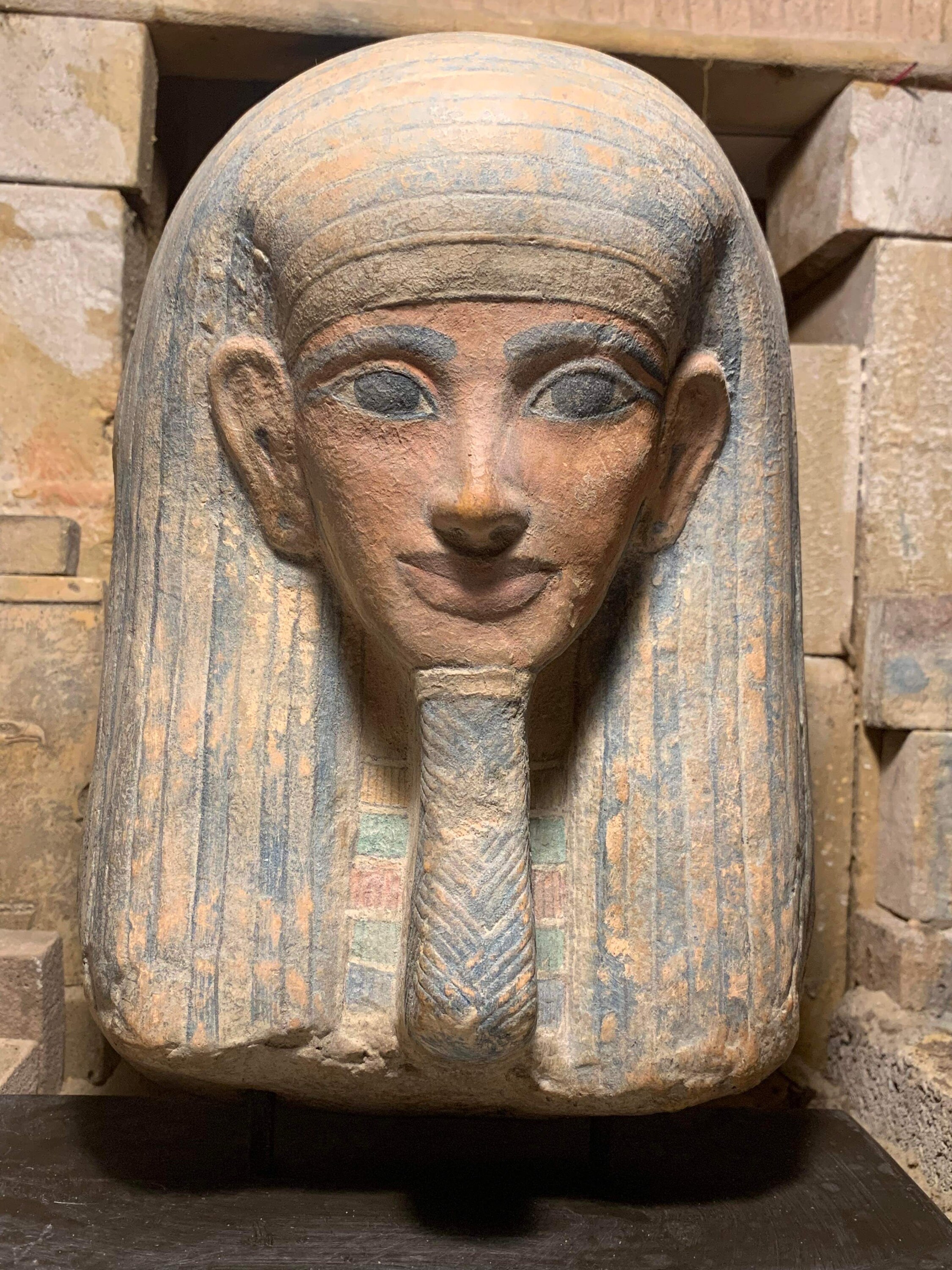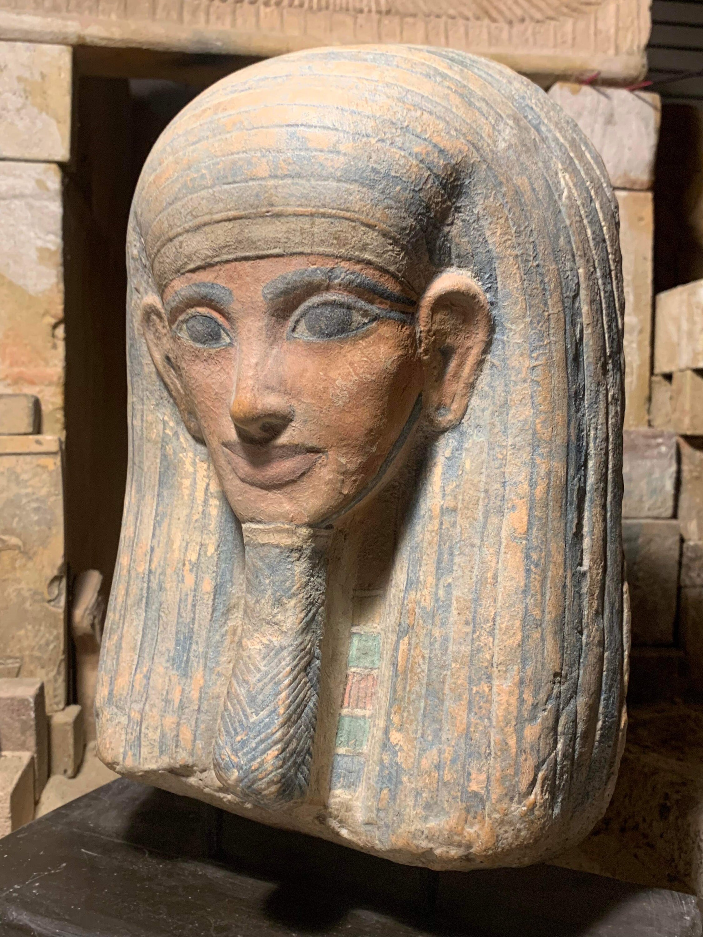 This mummy mask fragment is in this 26th dynasty style and as mentioned I had my own Saite / Thutmoside period of exploration at the turn of the century when the original mask was made. This is a great reproduction of the master carving and It represents a noble persons features and not a royal entity, due to the style of striped headdress and the lack of any royal insignia such as the Uraeus protective Cobra. The cobra that could have been located on the brow is absent here with no trace of it ever being modified to have one attatched.
