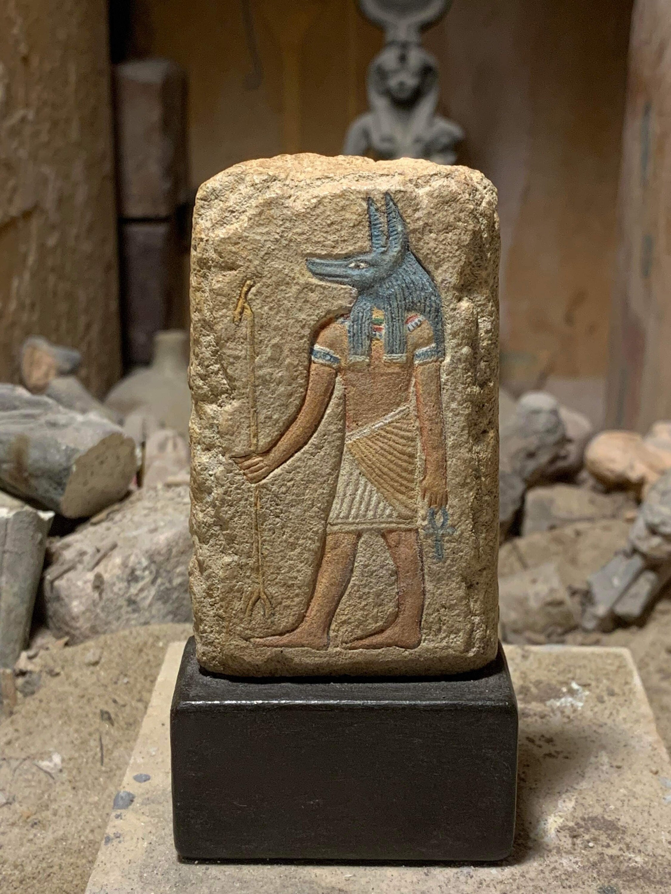Anubis or Anpu as he was know in the Egyptian tongue, made the 1st mummy (Osiris / Assar) and was forever to be associated with mummification for all periods of Ancient Egyptian history. This small representation depicts Anubis holding a WAS/WASS sceptre which signifies dominion and mastery of his realm.