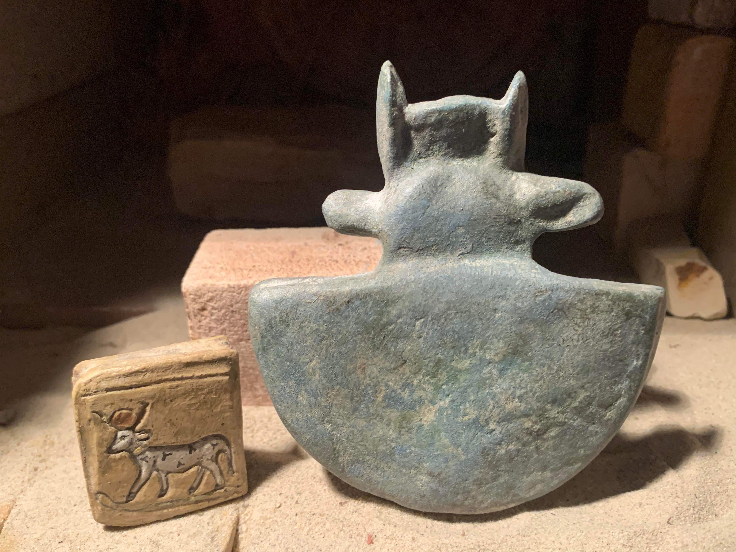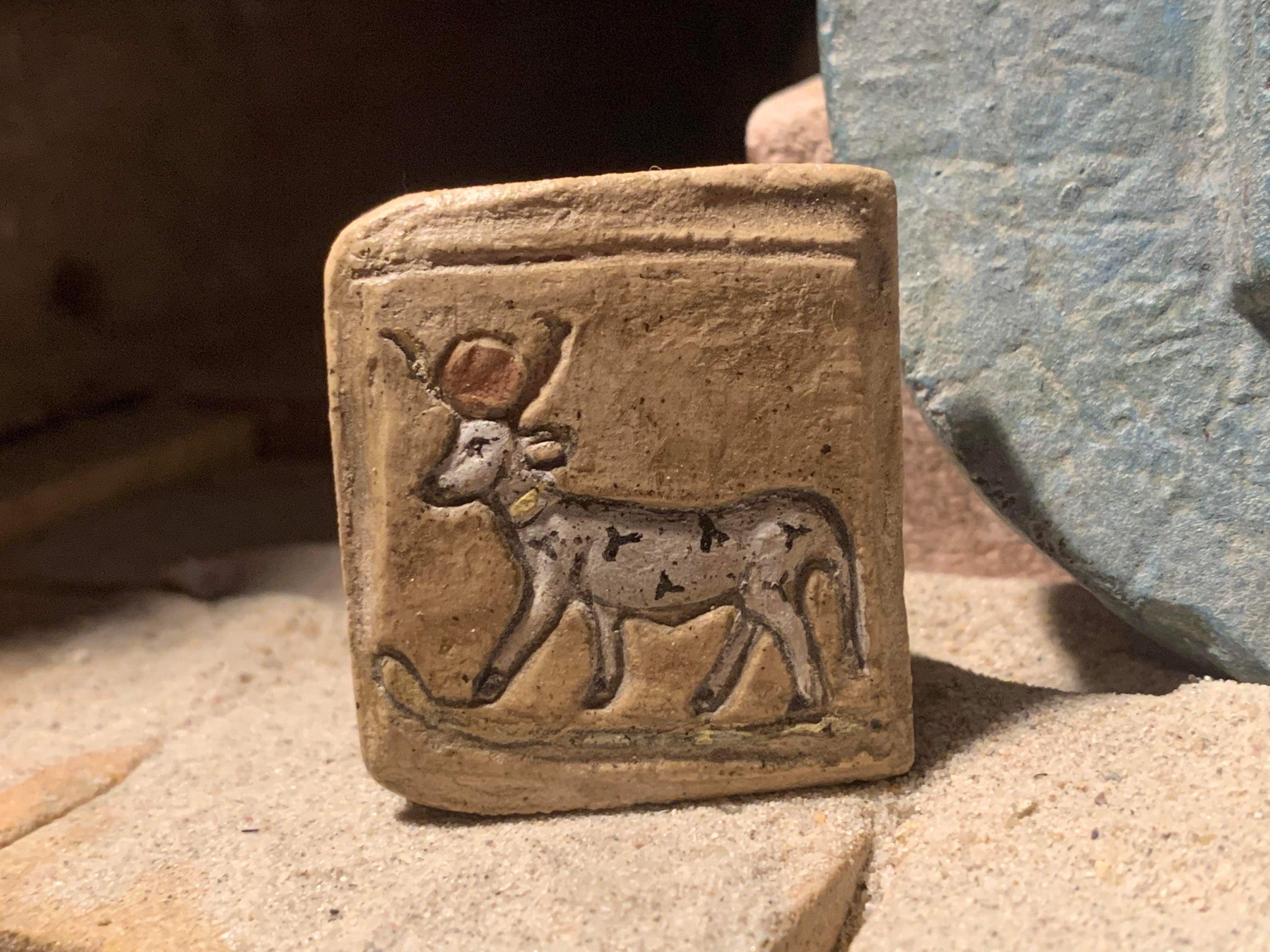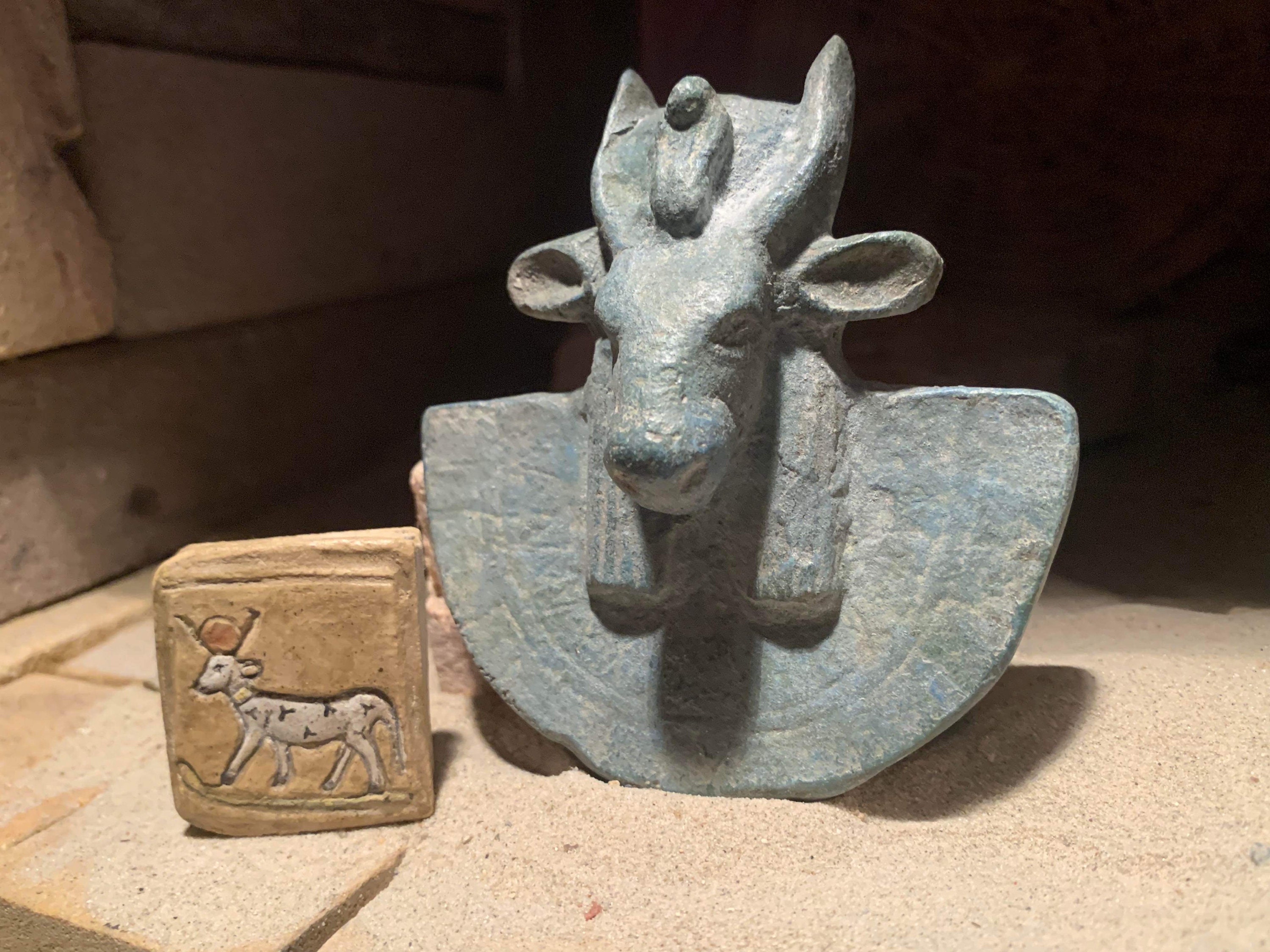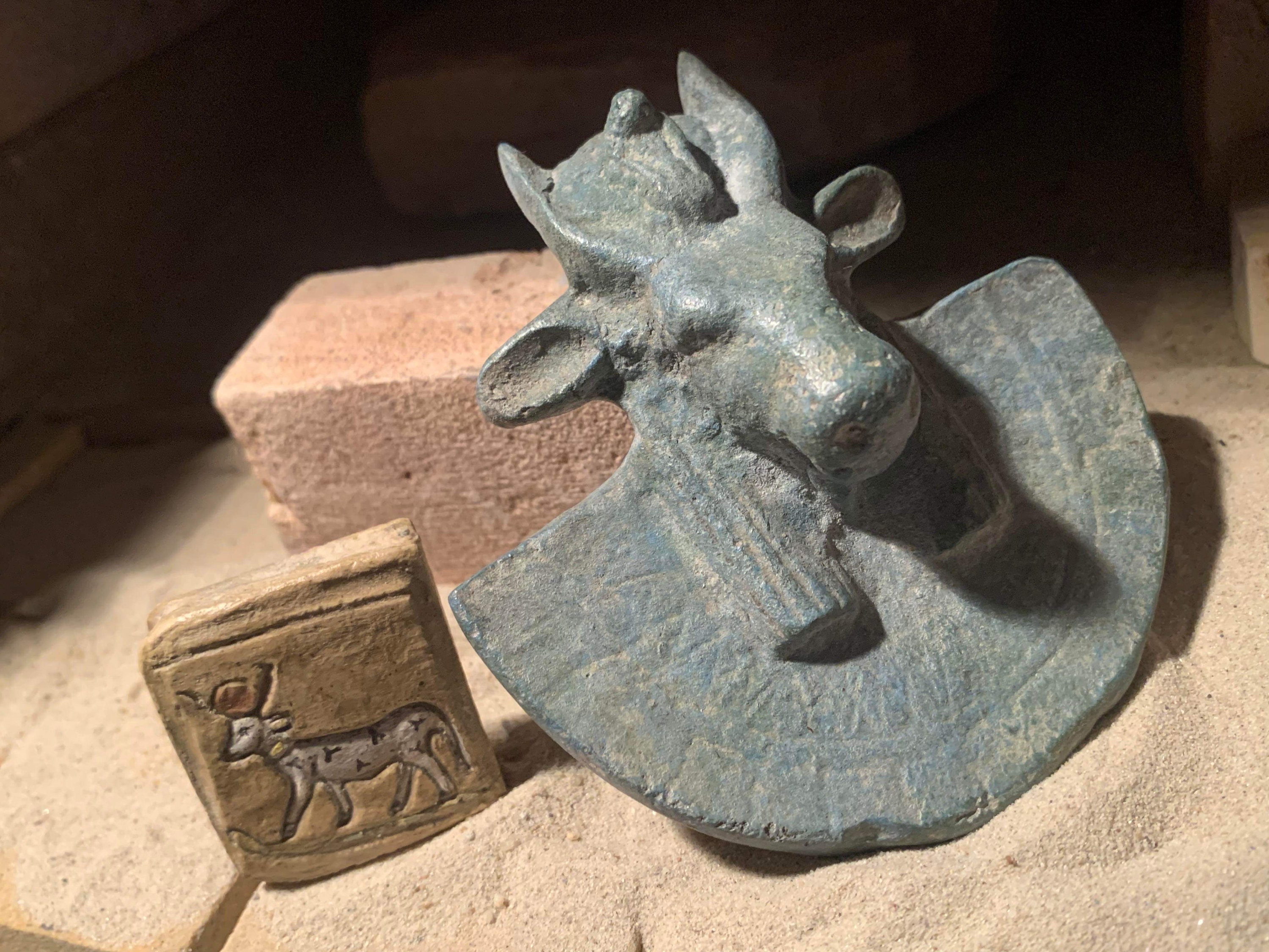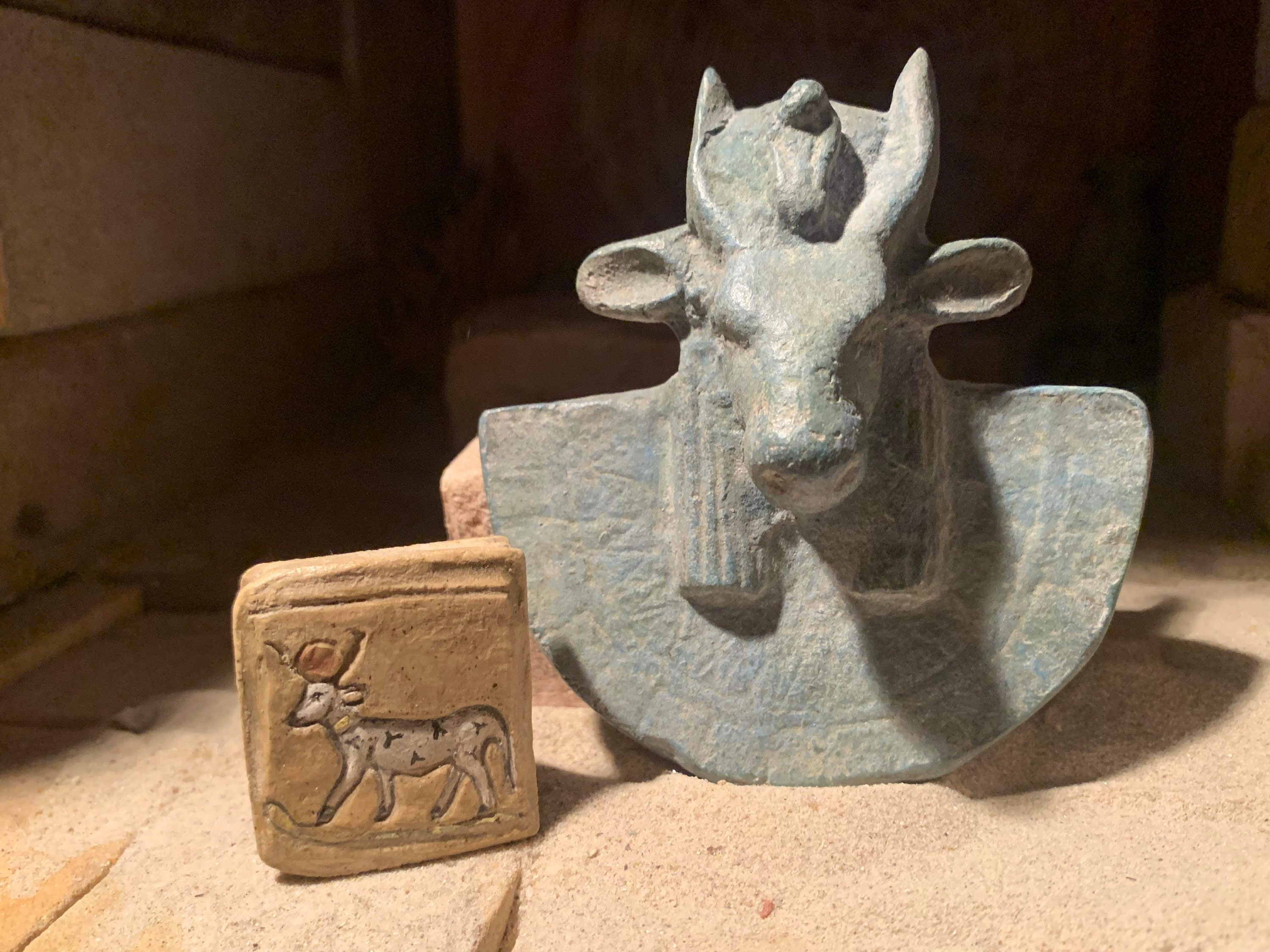 Egyptian art / sculpture - Apis bull aegis artifact replica & Hathor cow amulet
