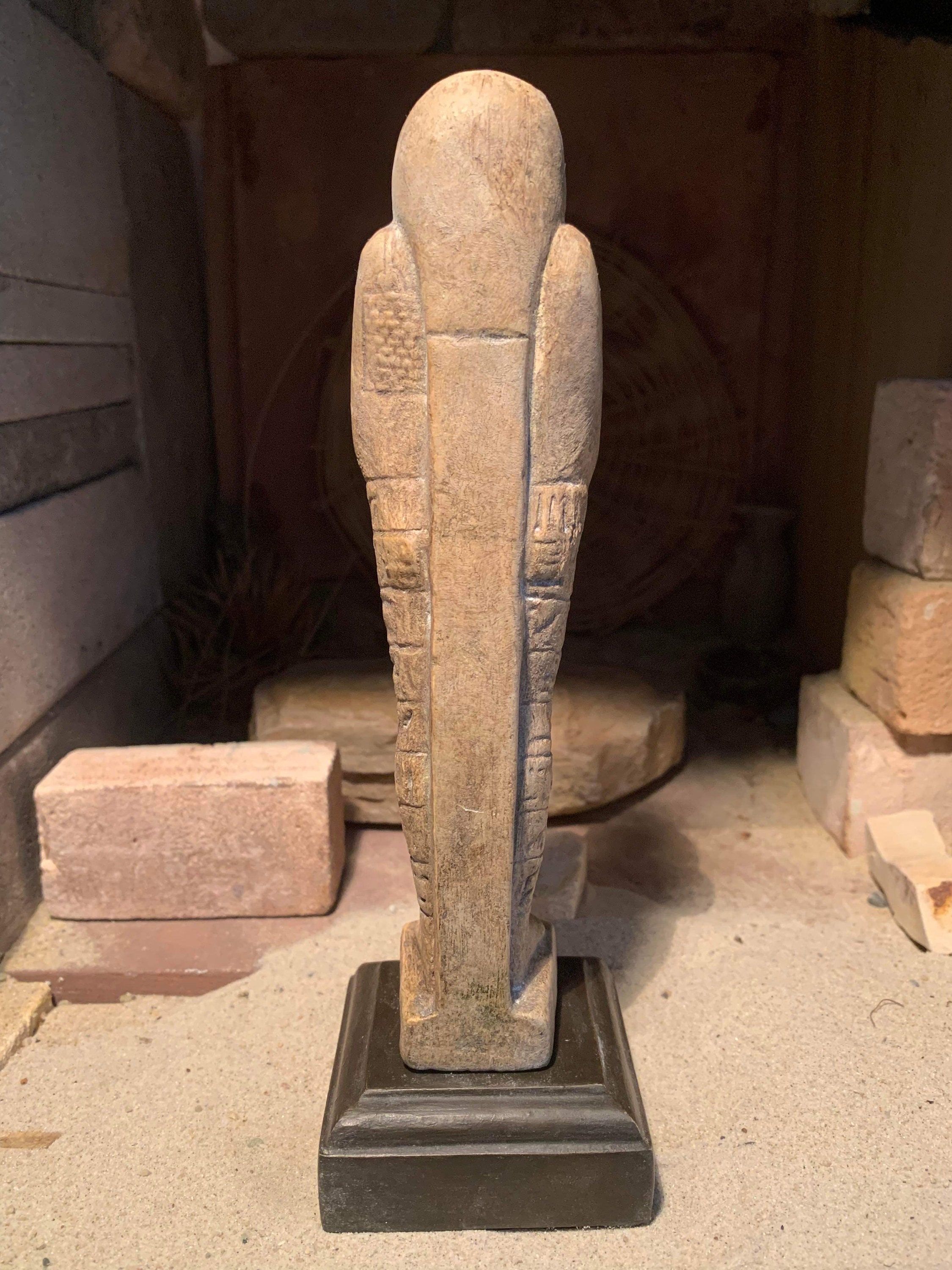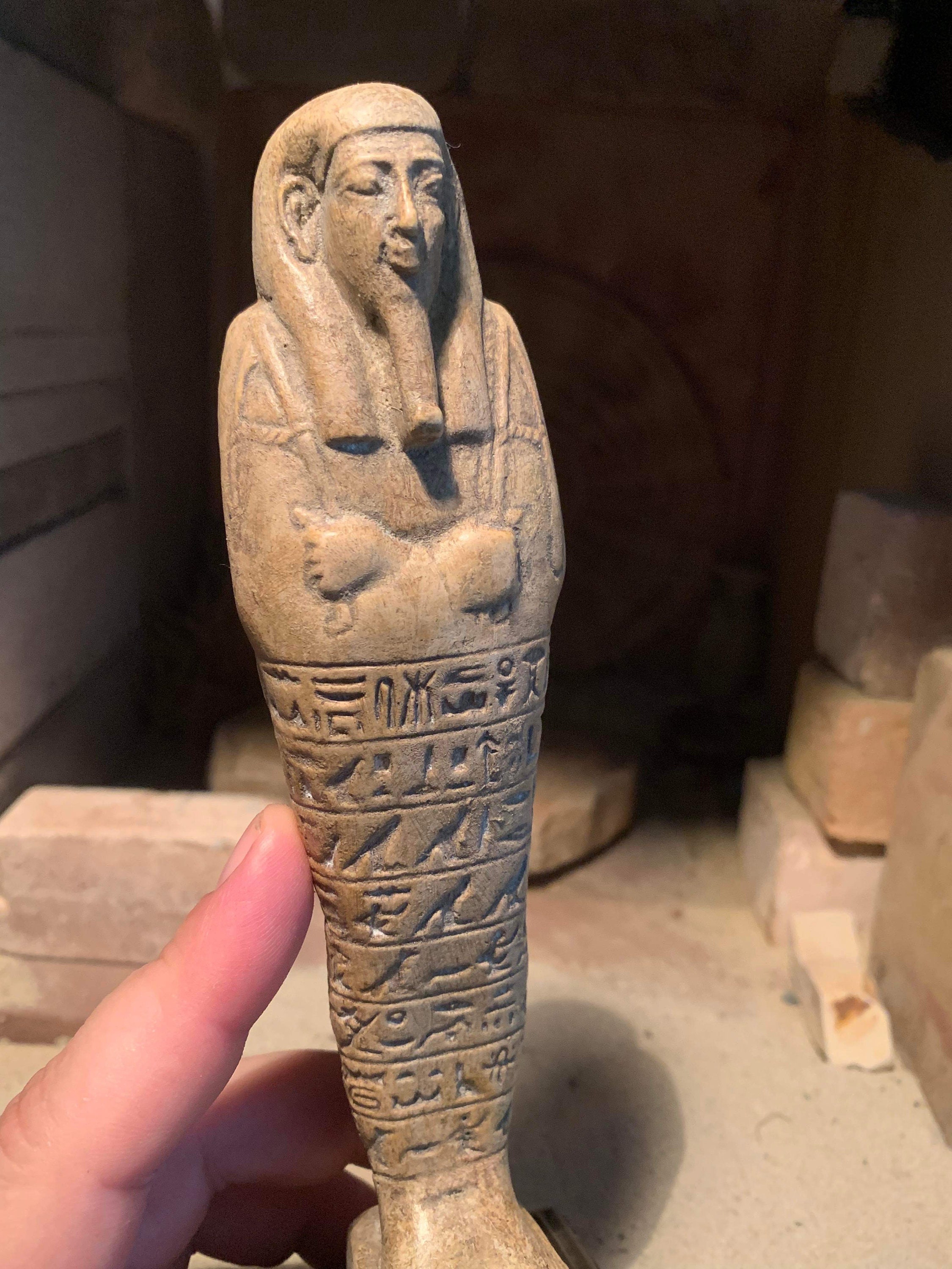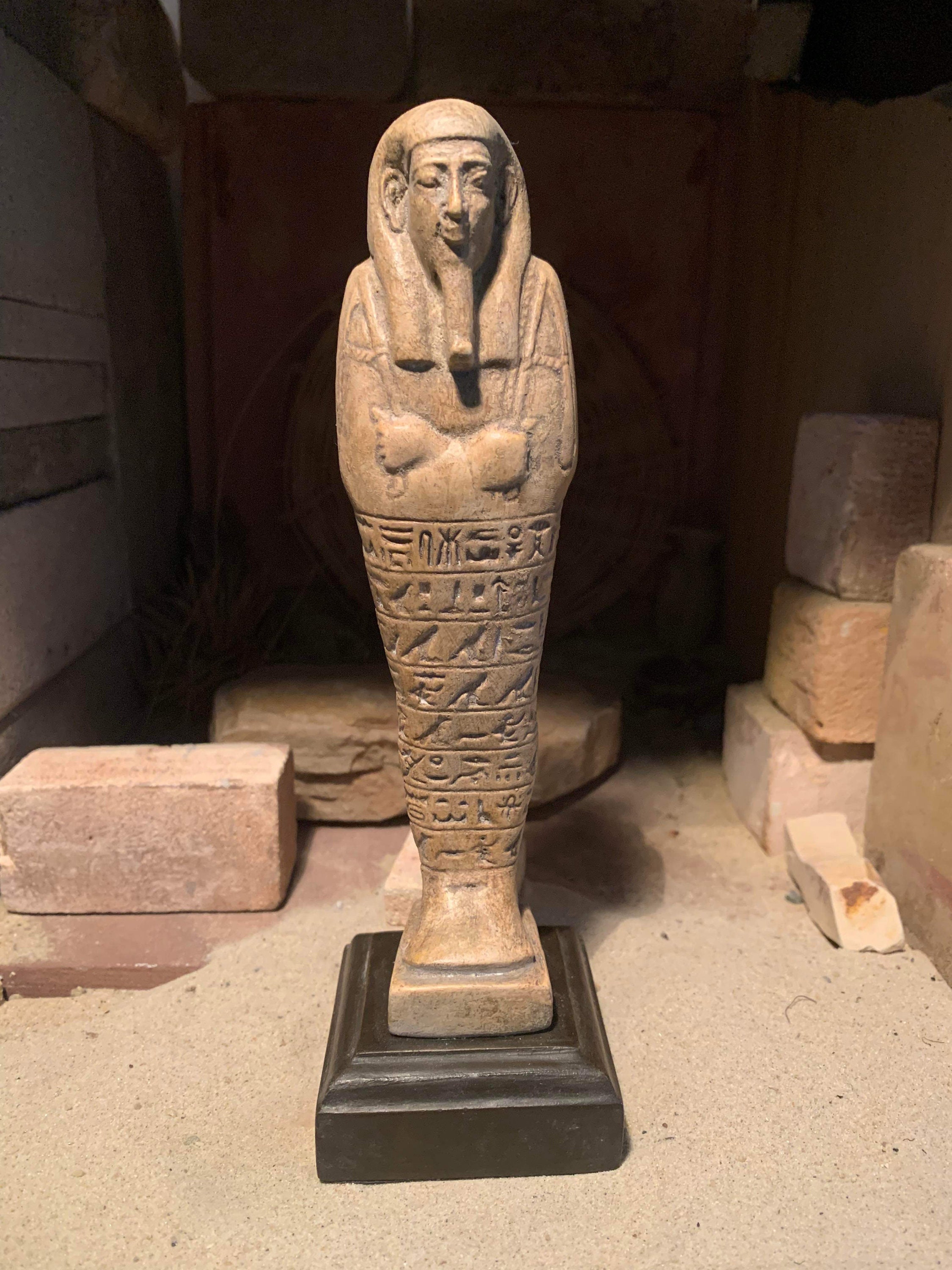 The name stems from the Sha-wab tree, as early figures were made from its wood. Later figures employed a great variety of materials such as clay, faience{opaque blue green glass} plaster and stone depending on what you could afford. These figures were placed within the tomb of an individual to magically come to life performing any work required by the god Osiris in the afterlife. A modest burial would have one or two figures, however during the late period the quantities included within a burial increased to allow a shabti for each day of the year plus overseers. Some burials had even more.