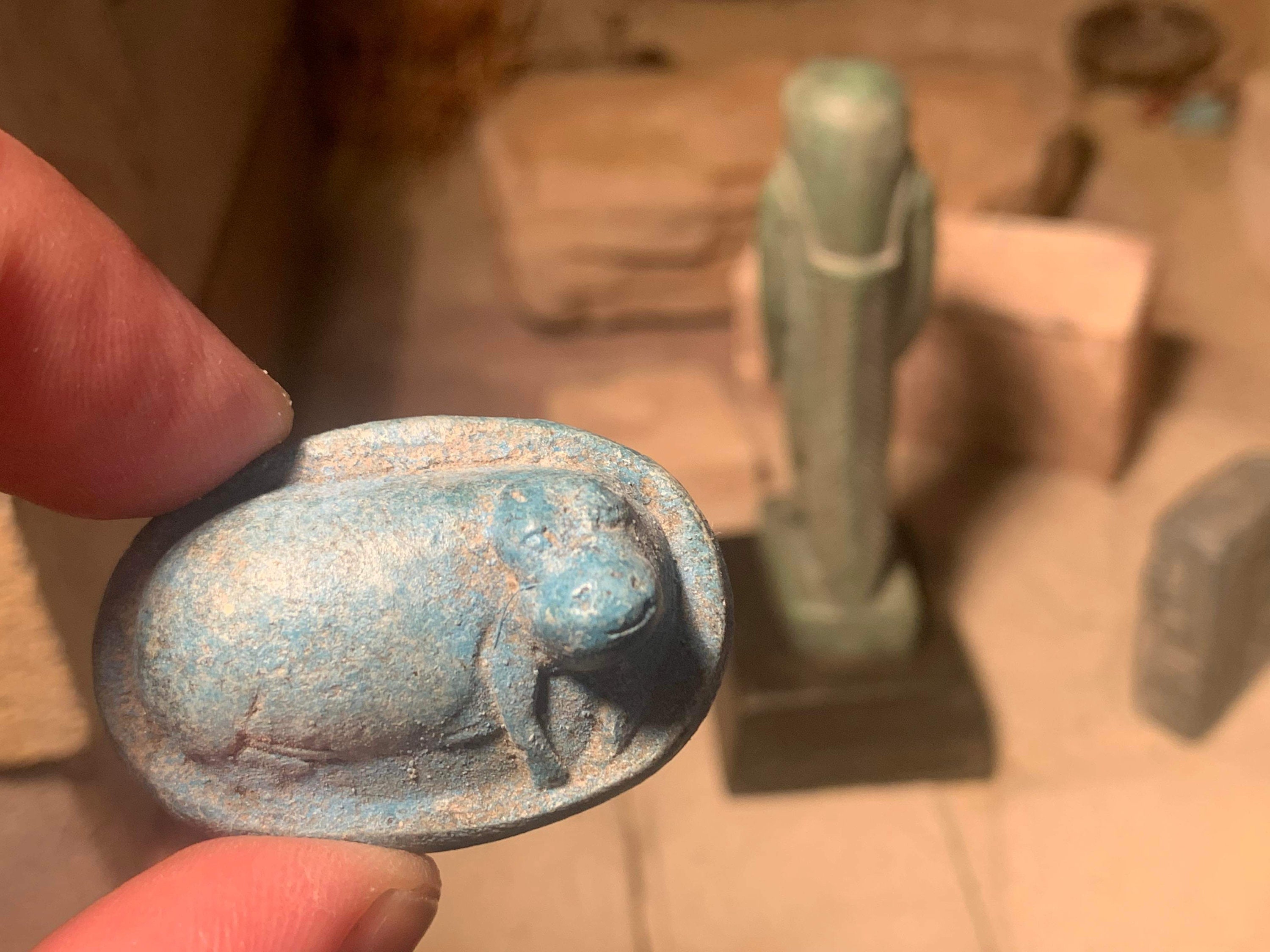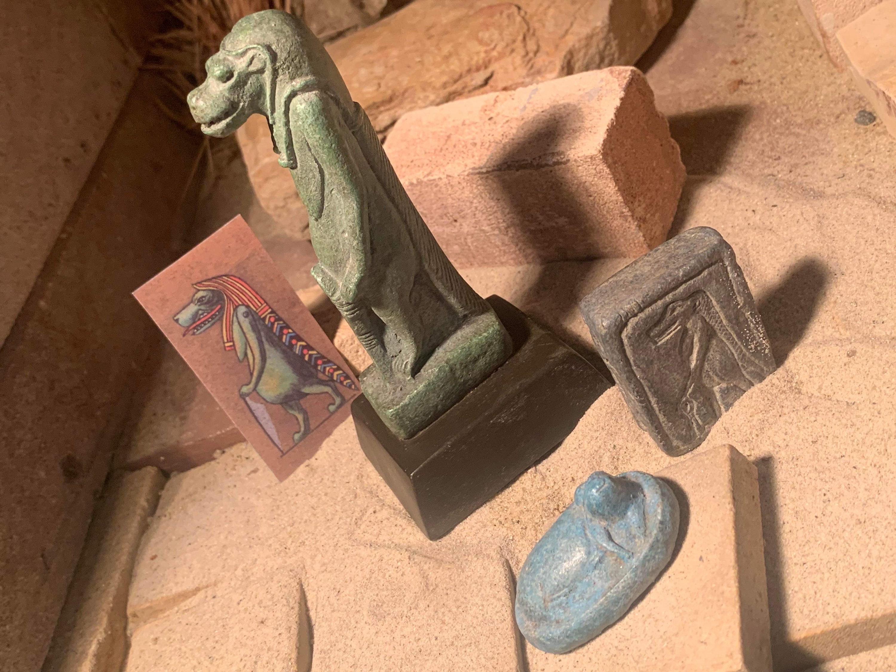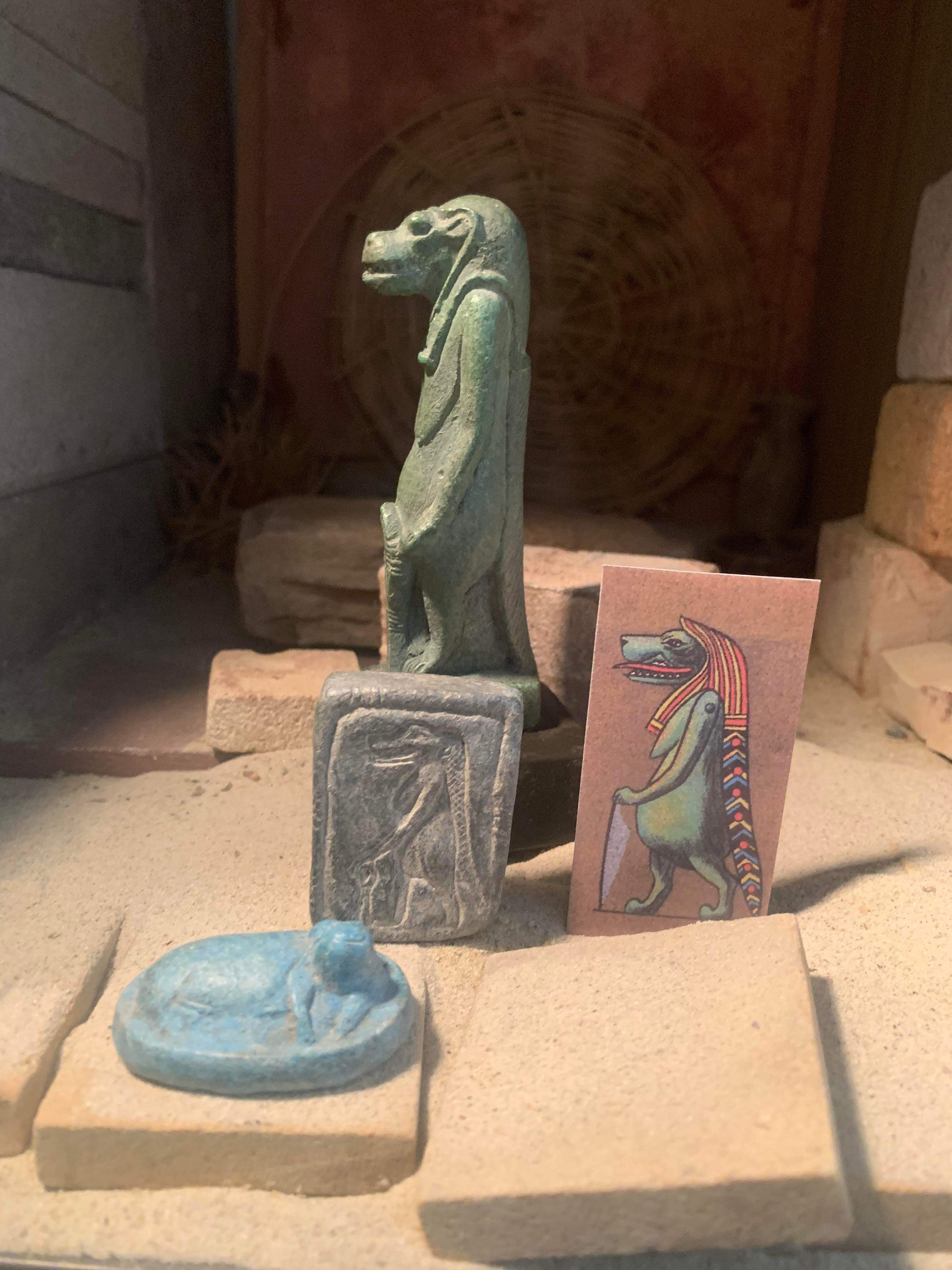 The rectangular amulet is a perfect match as it depicts Tauret in the same stance but in the form of a profile relief carving. The other amulet features a reclining hippo which was her sacred animal. A replica collector card of early 20th century design further rounds out the collection with a fine illustration of Taweret.