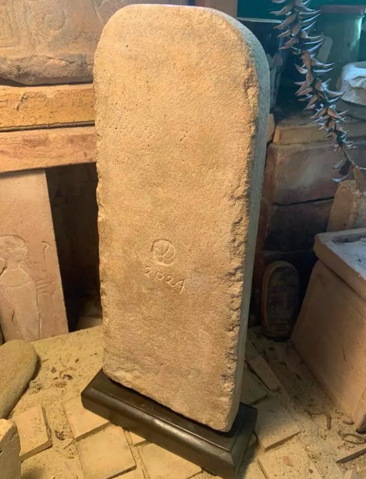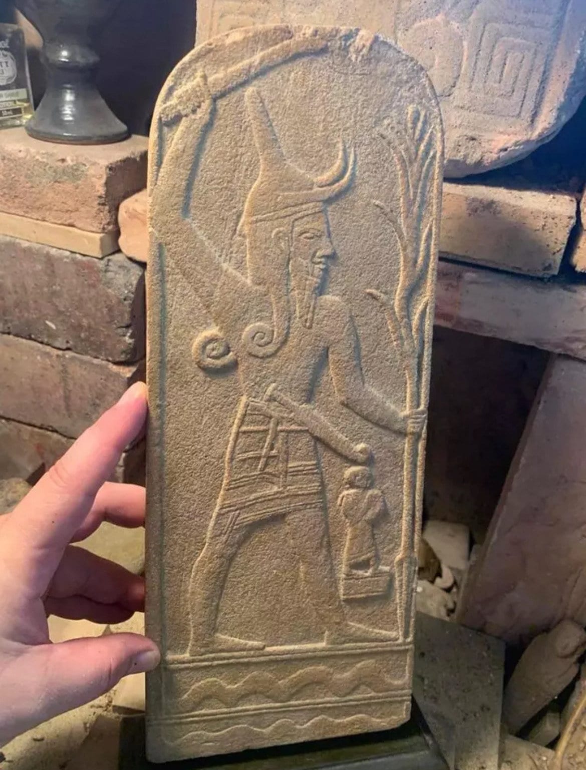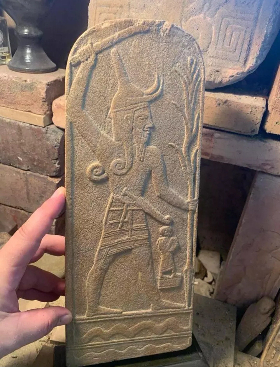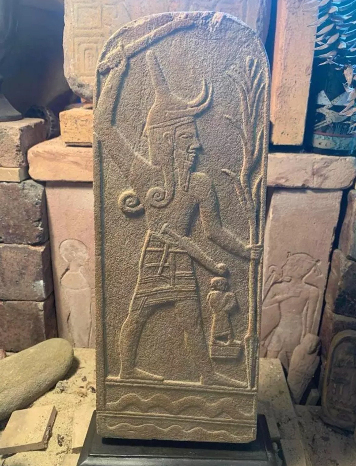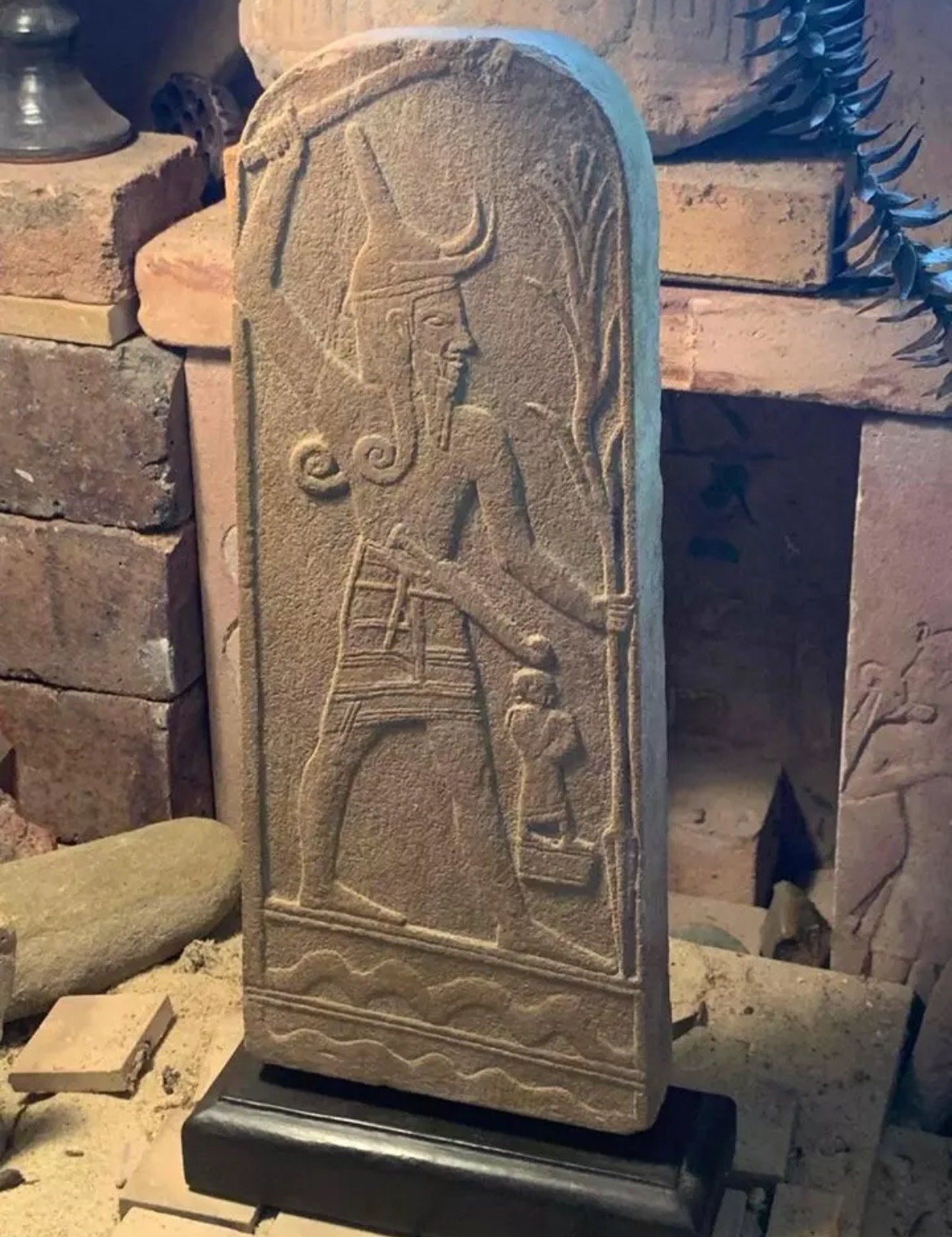 This explains why essentially the carving looks Egyptian in overall pose and proportion, however, it has distinctive differences. The grasping of a lightning bolt is very unusual as is the narrow, horned headdress. Even the multiple curls of the hair are very different to how an Egyptian male figure is depicted - mortal or otherwise.