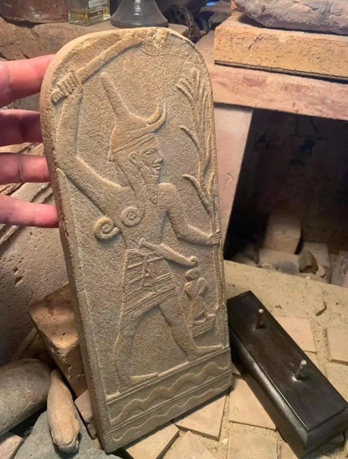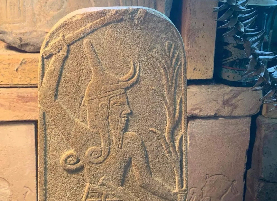Clasping a thunderbolt arrow, pounding it into the ground, in this carving Ba’al stands above a symbol of the precious water that his worshippers prayed for.