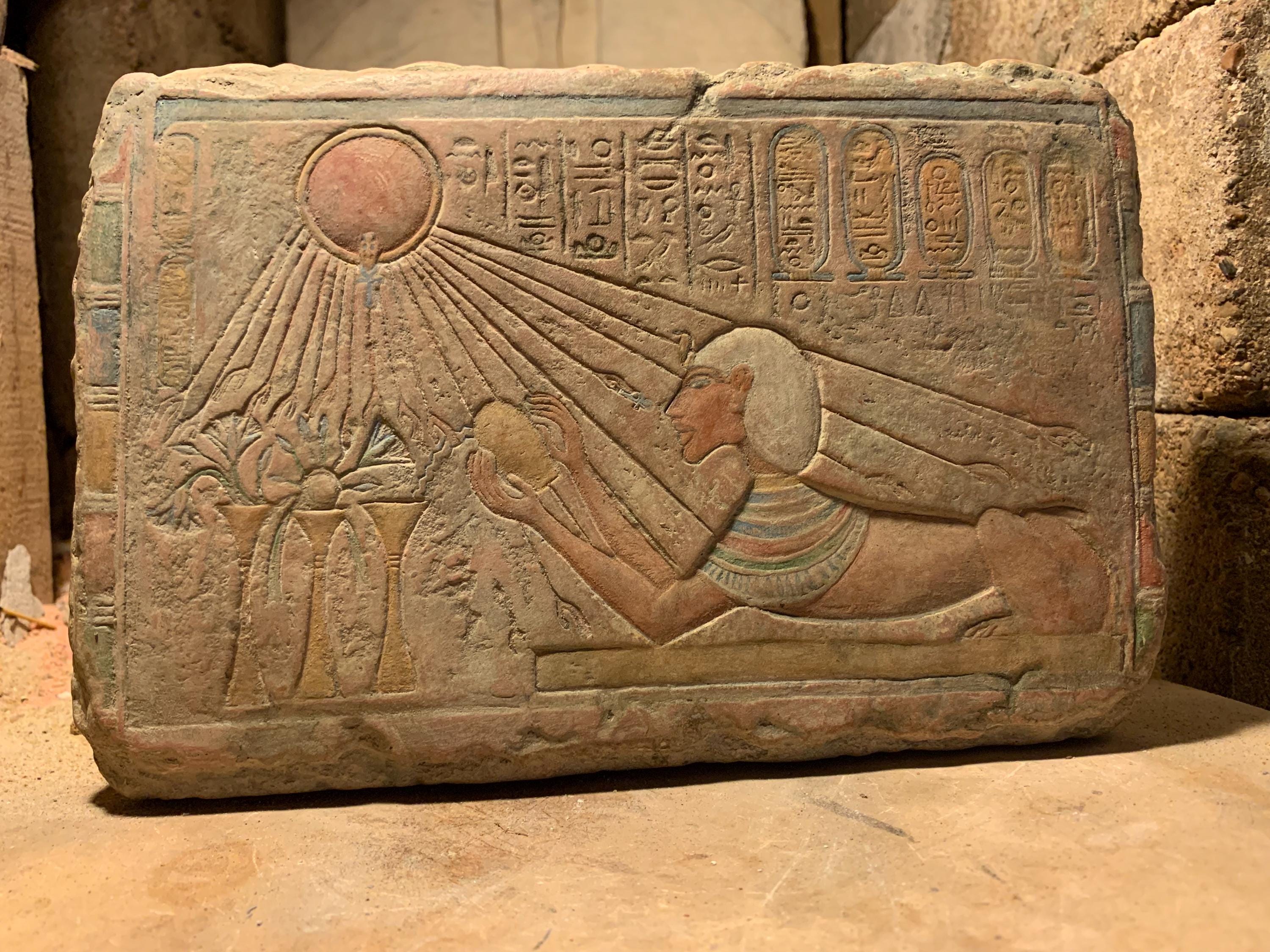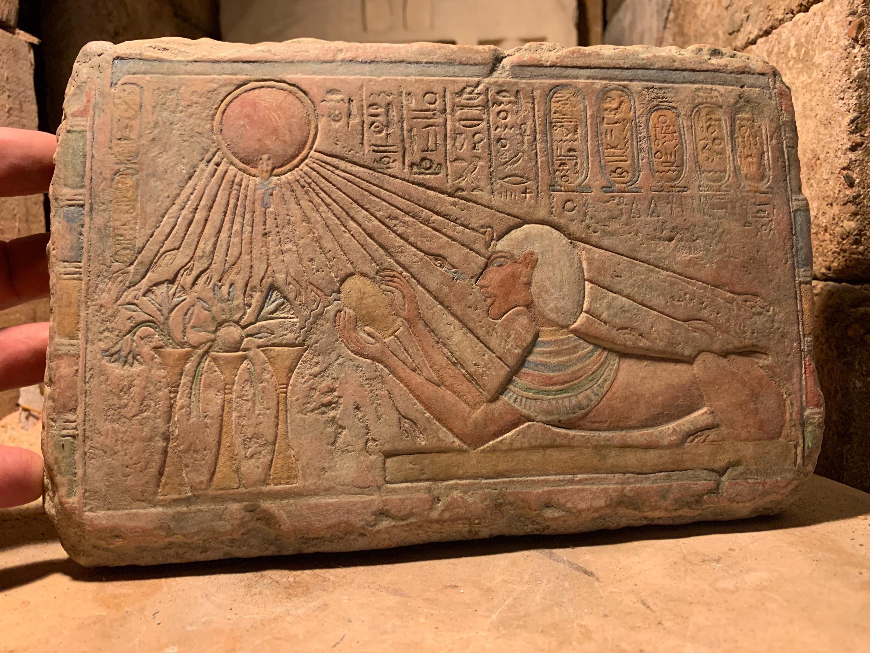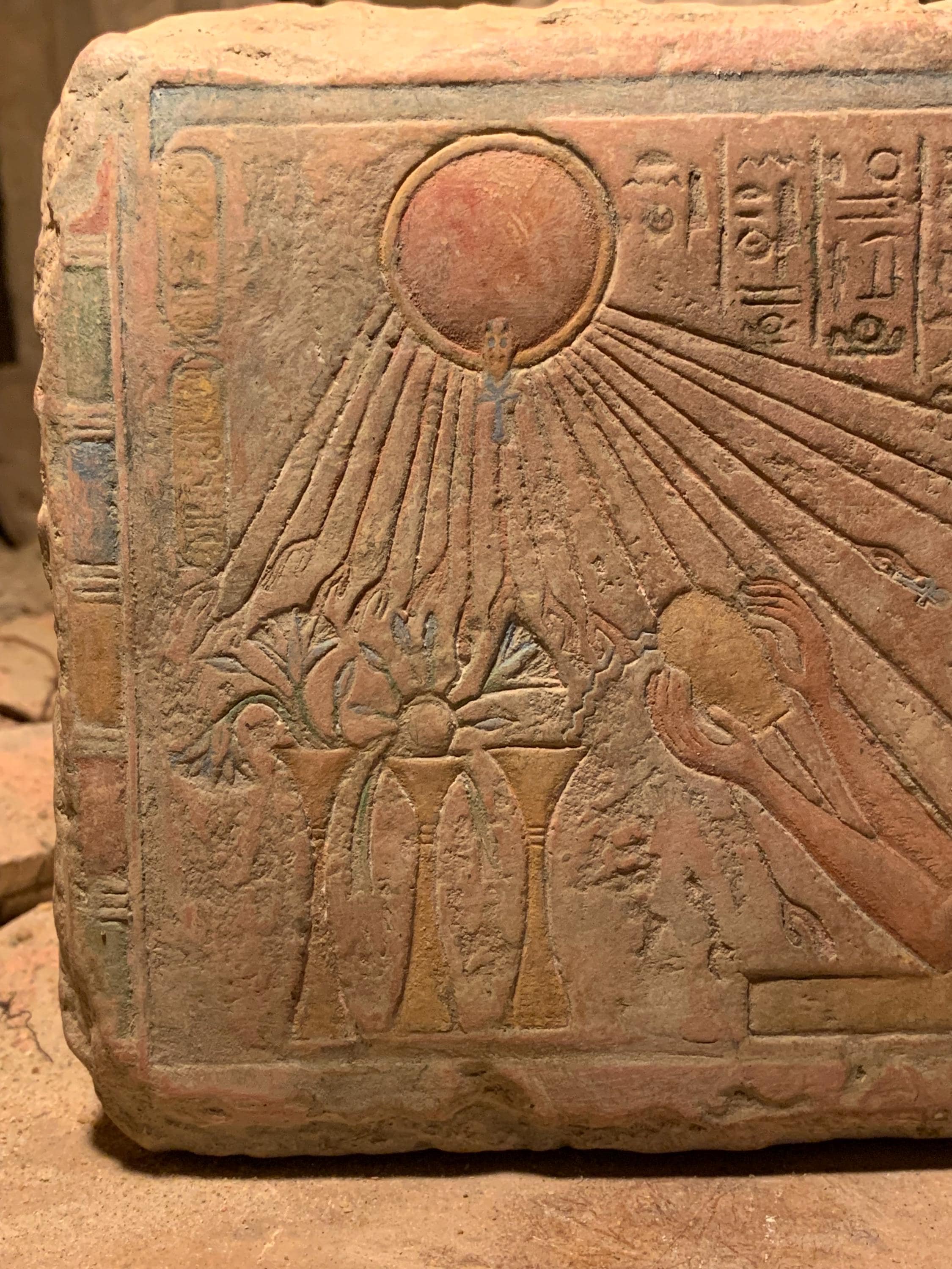 Scene description - In this scene Akhenaten as Sphinx makes offerings unto Aton/Aten, the sun disc whose benevolent rays terminate in tiny human hands to receive the offering. In return, Aten offers a tiny ankh to the nostril for Akhenaten to receive the breath of life. The hieroglyph for heaven stretches over the whole scene with the various names of Aten, Akhenaten and Nefertiti carved in hieroglyphics directly below within oval cartouches. Three tall, slender offering tables are piled with lotus buds and blooms that Akhenaten pours water upon, streaming in stylized zig - zag lines from a libation jar. The scene originated from what is known as a 'sun shade', a small kiosk like structure that would serve as a type of recharging booth for the Royal family. No doubt facing east.