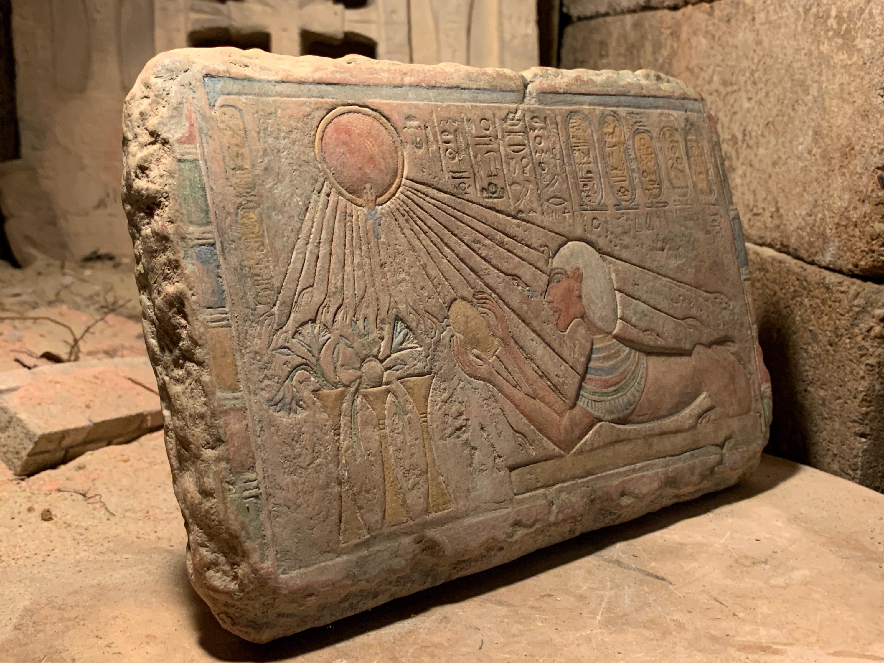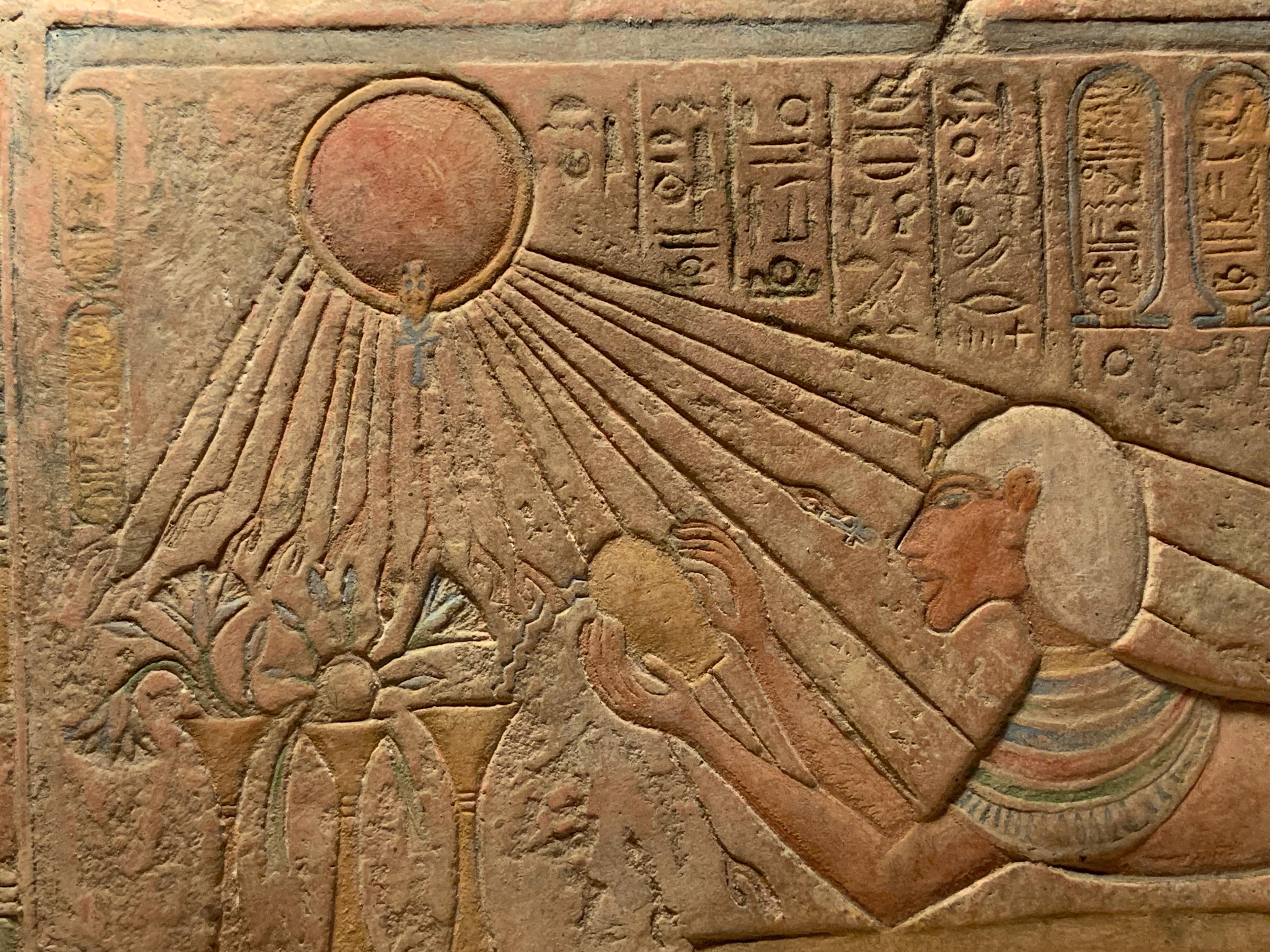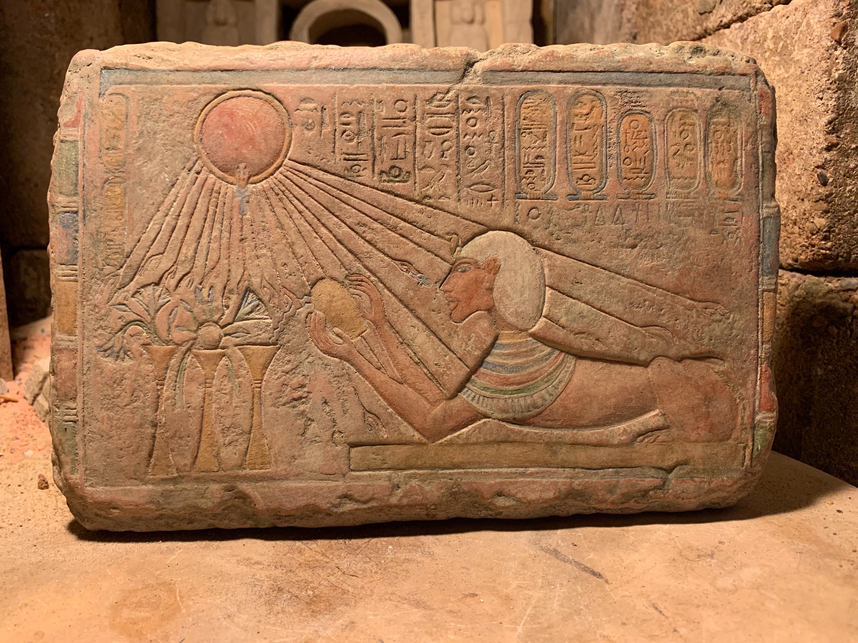 Scene description - In this scene Akhenaten as Sphinx makes offerings unto Aton/Aten, the sun disc whose benevolent rays terminate in tiny human hands to receive the offering. In return, Aten offers a tiny ankh to the nostril for Akhenaten to receive the breath of life. The hieroglyph for heaven stretches over the whole scene with the various names of Aten, Akhenaten and Nefertiti carved in hieroglyphics directly below within oval cartouches. Three tall, slender offering tables are piled with lotus buds and blooms that Akhenaten pours water upon, streaming in stylized zig - zag lines from a libation jar. The scene originated from what is known as a 'sun shade', a small kiosk like structure that would serve as a type of recharging booth for the Royal family. No doubt facing east.