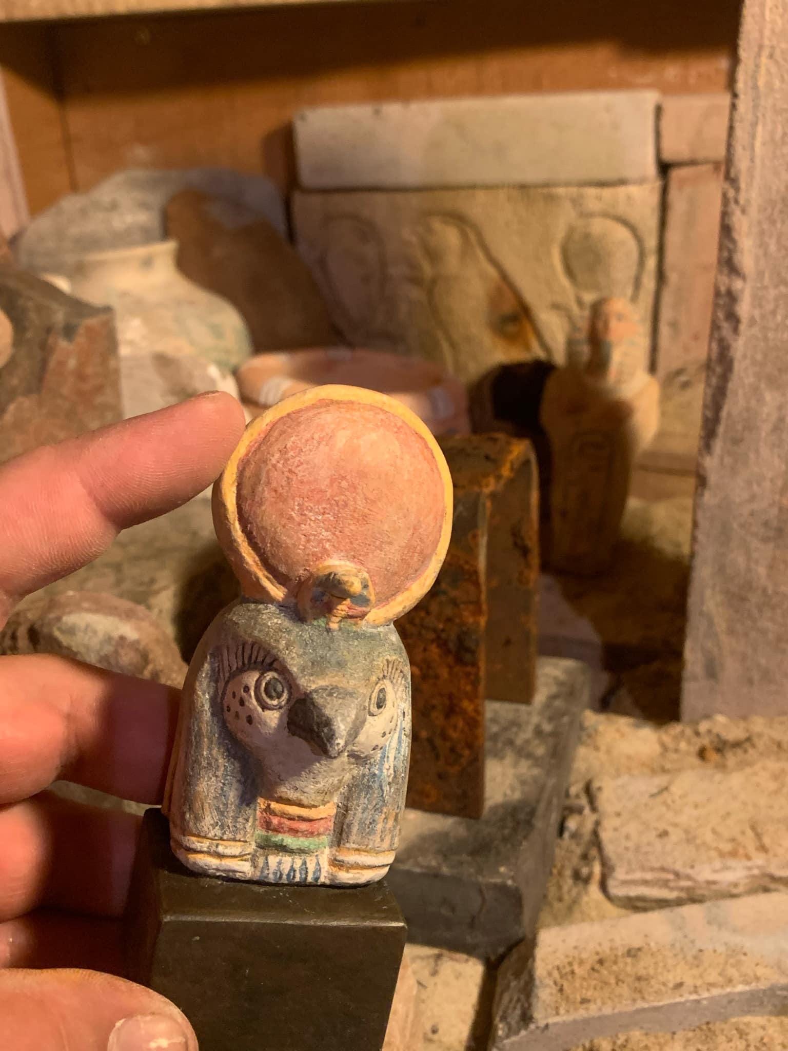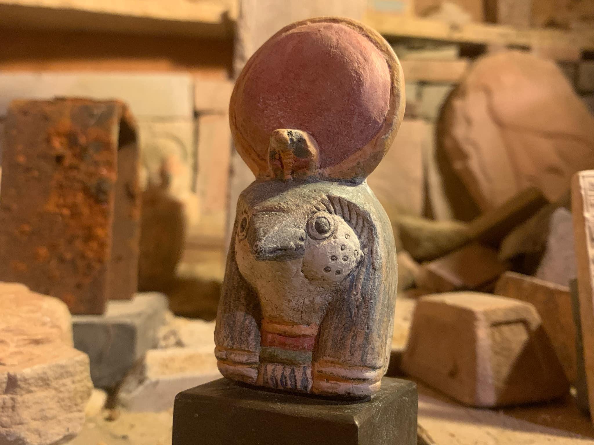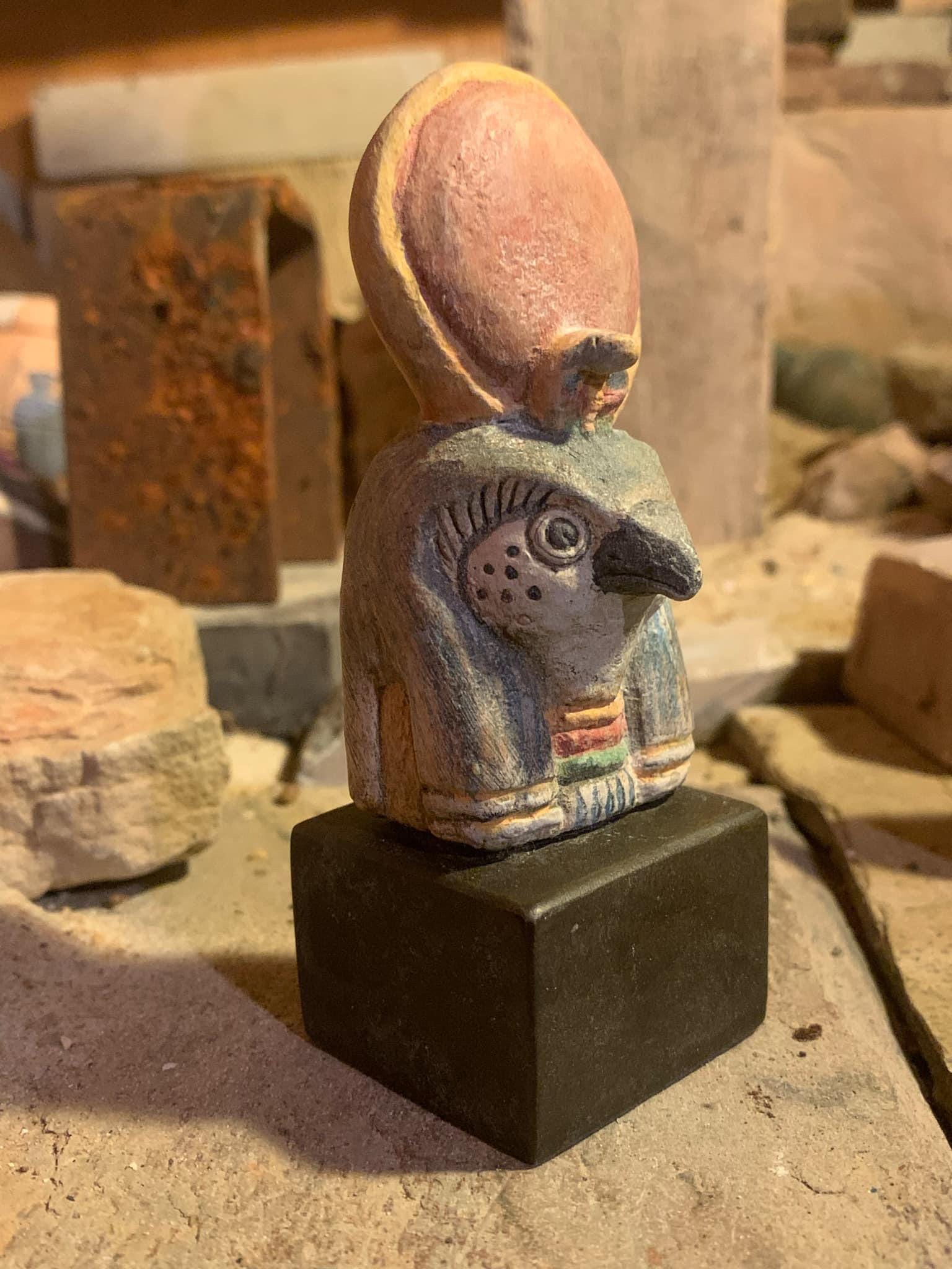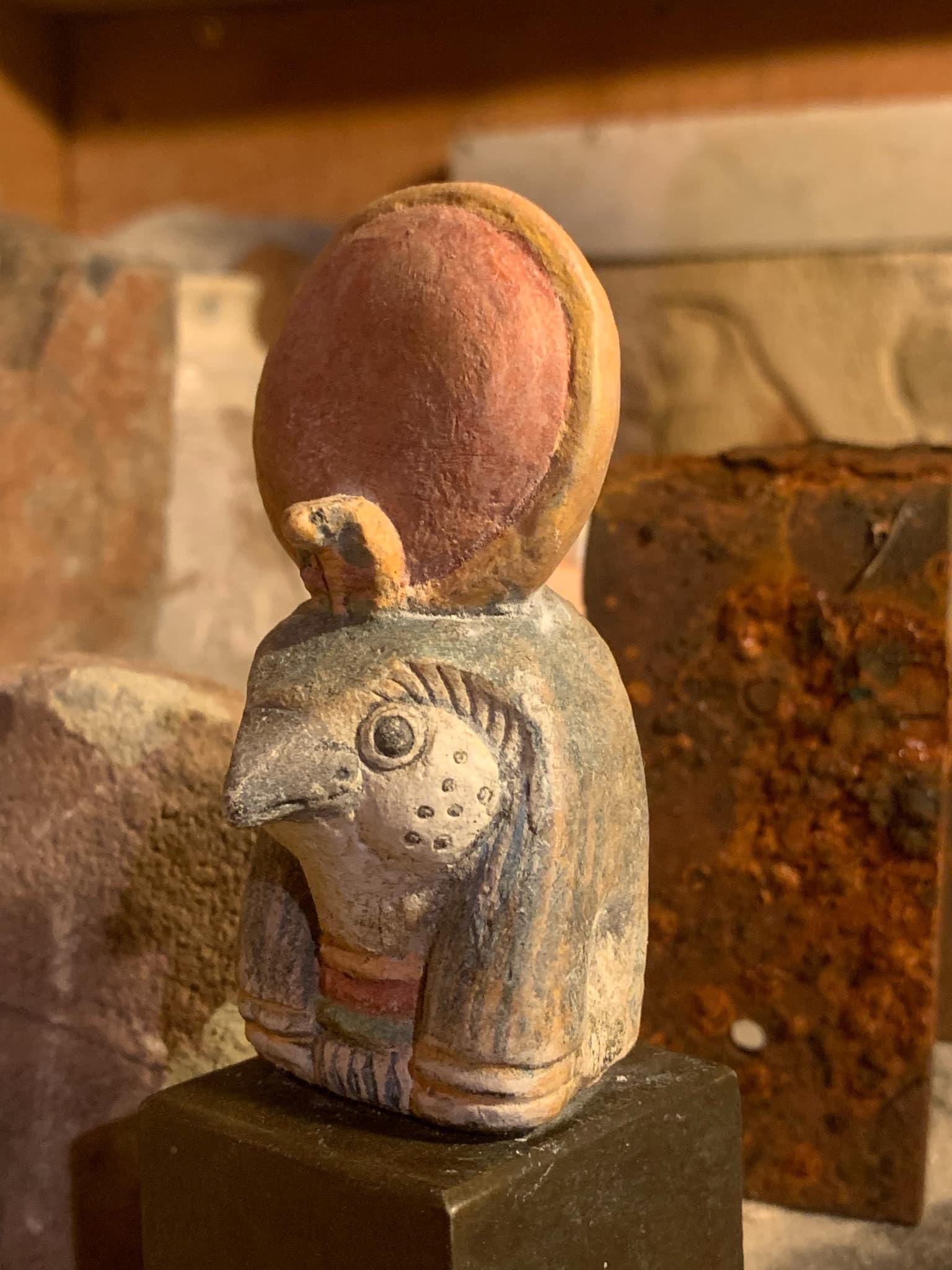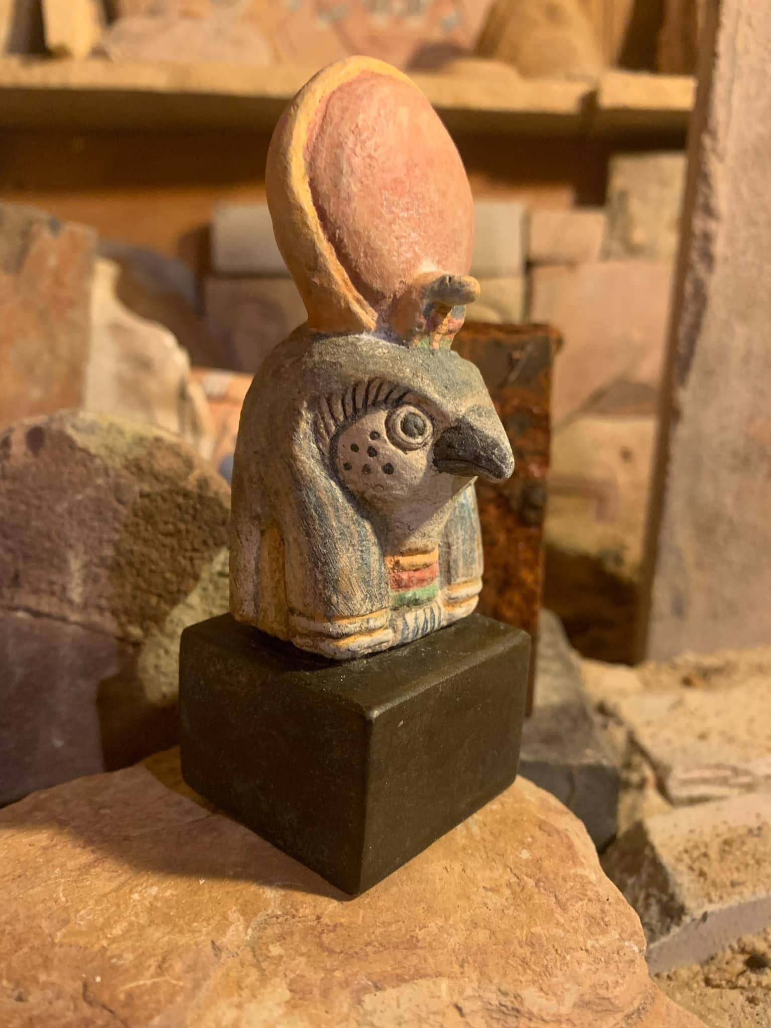 On offer here is a replica of one of my original Ra statues. Made of a limestone and quartzite composition stone, It has a been hand painted in traditional Egyptian colours with the disc of the sun a subdued red. It is mounted on a polished, felt based stand.