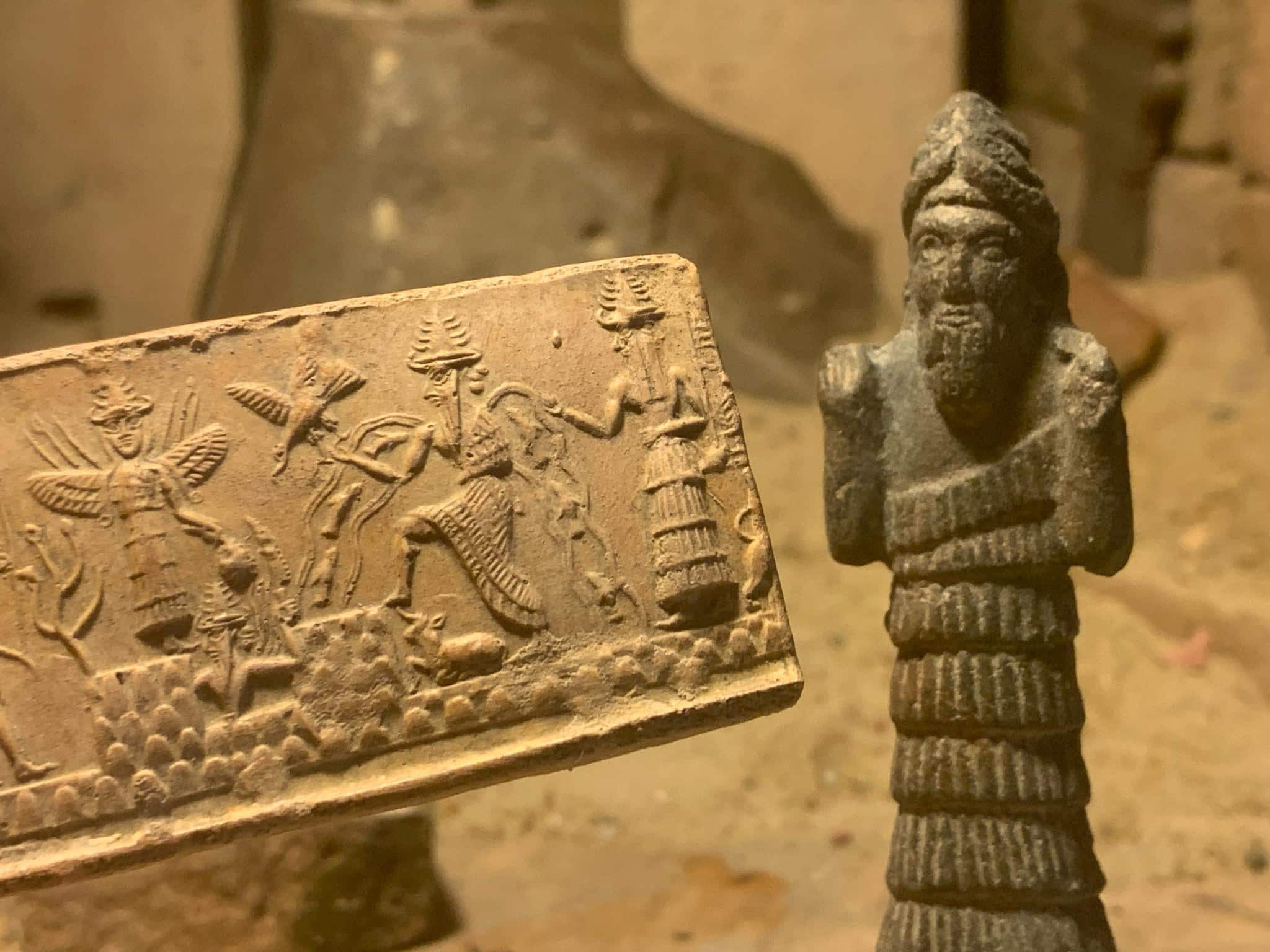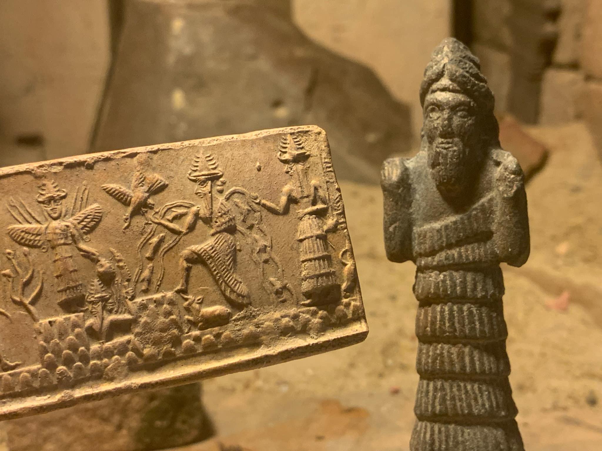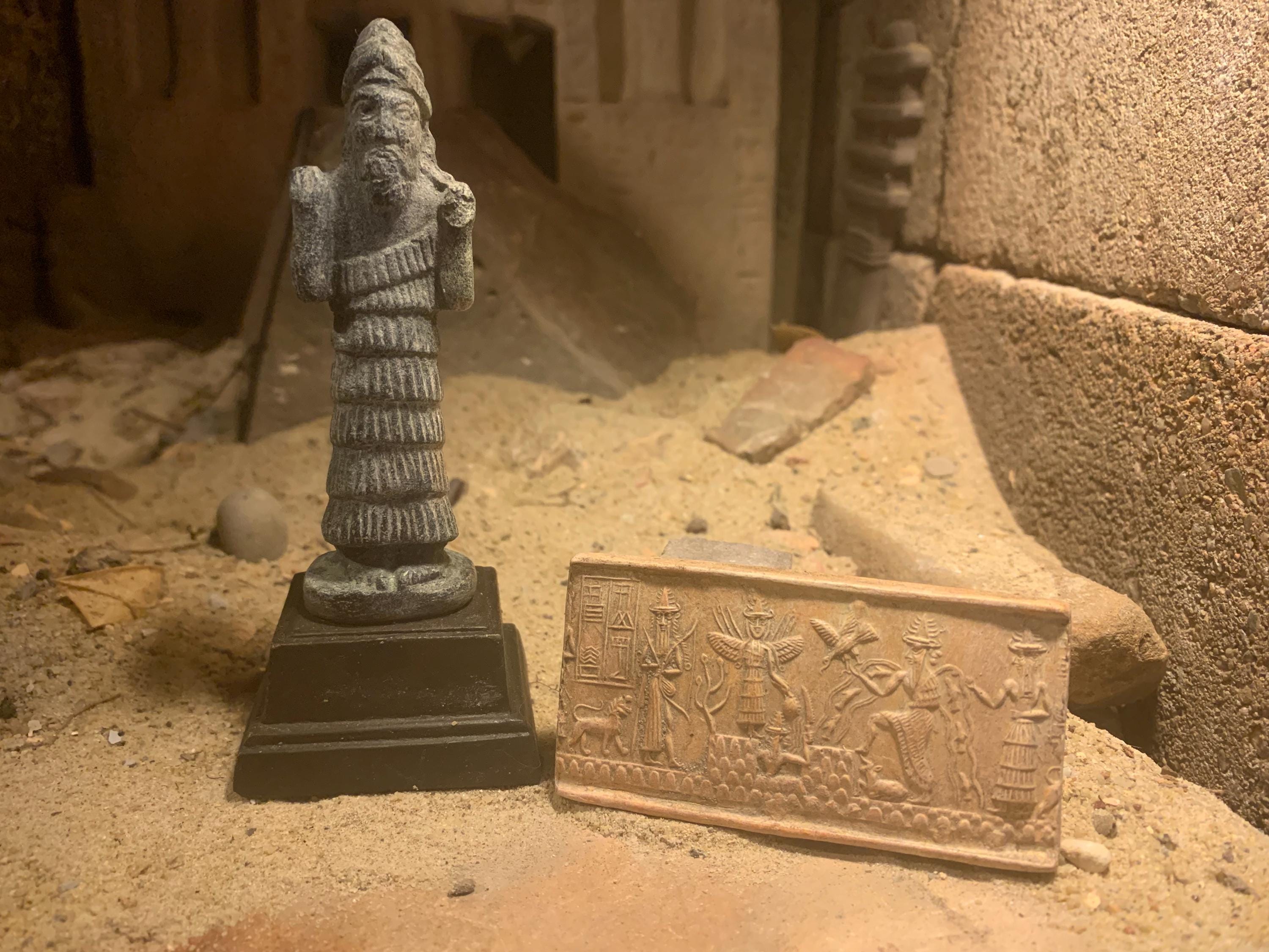 On offer here is a fine, and highly detailed replica of an Akkadian seal impression featuring four of the principal Gods of the Mesopotamian world and an attendant messenger. In addition a small statuette of Enki makes for a great combination display option.