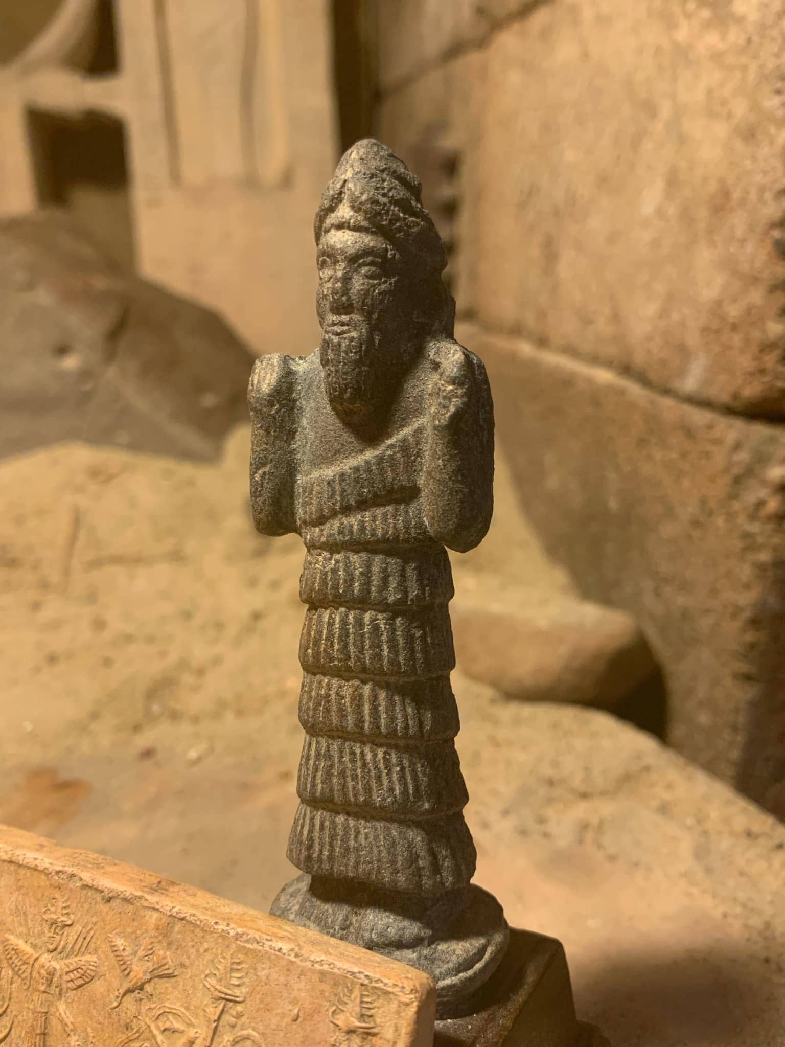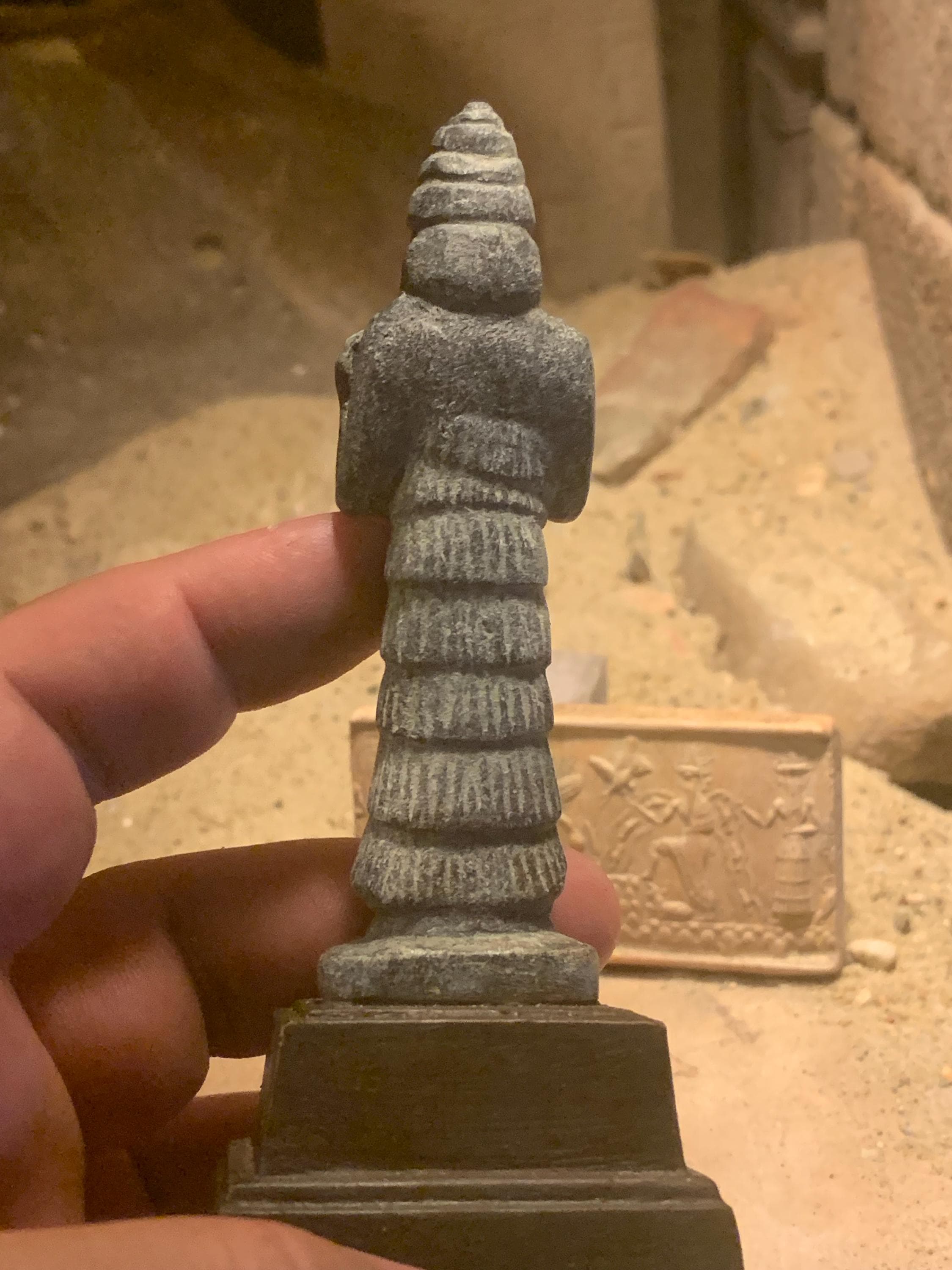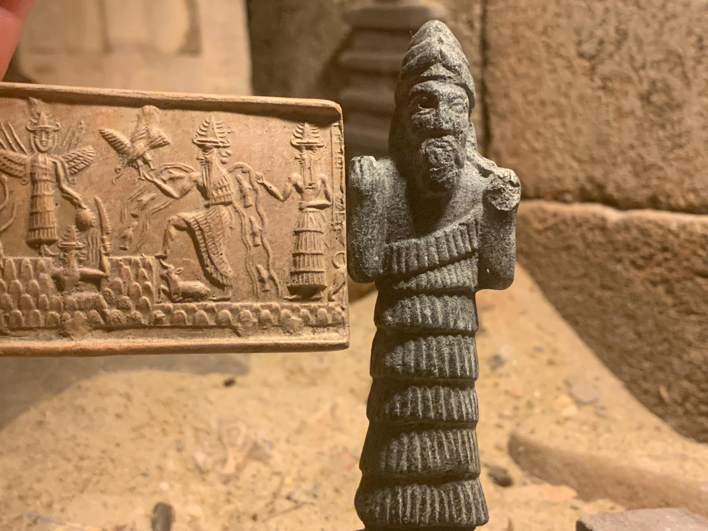 On offer here is a fine, and highly detailed replica of an Akkadian seal impression featuring four of the principal Gods of the Mesopotamian world and an attendant messenger. In addition a small statuette of Enki makes for a great combination display option.