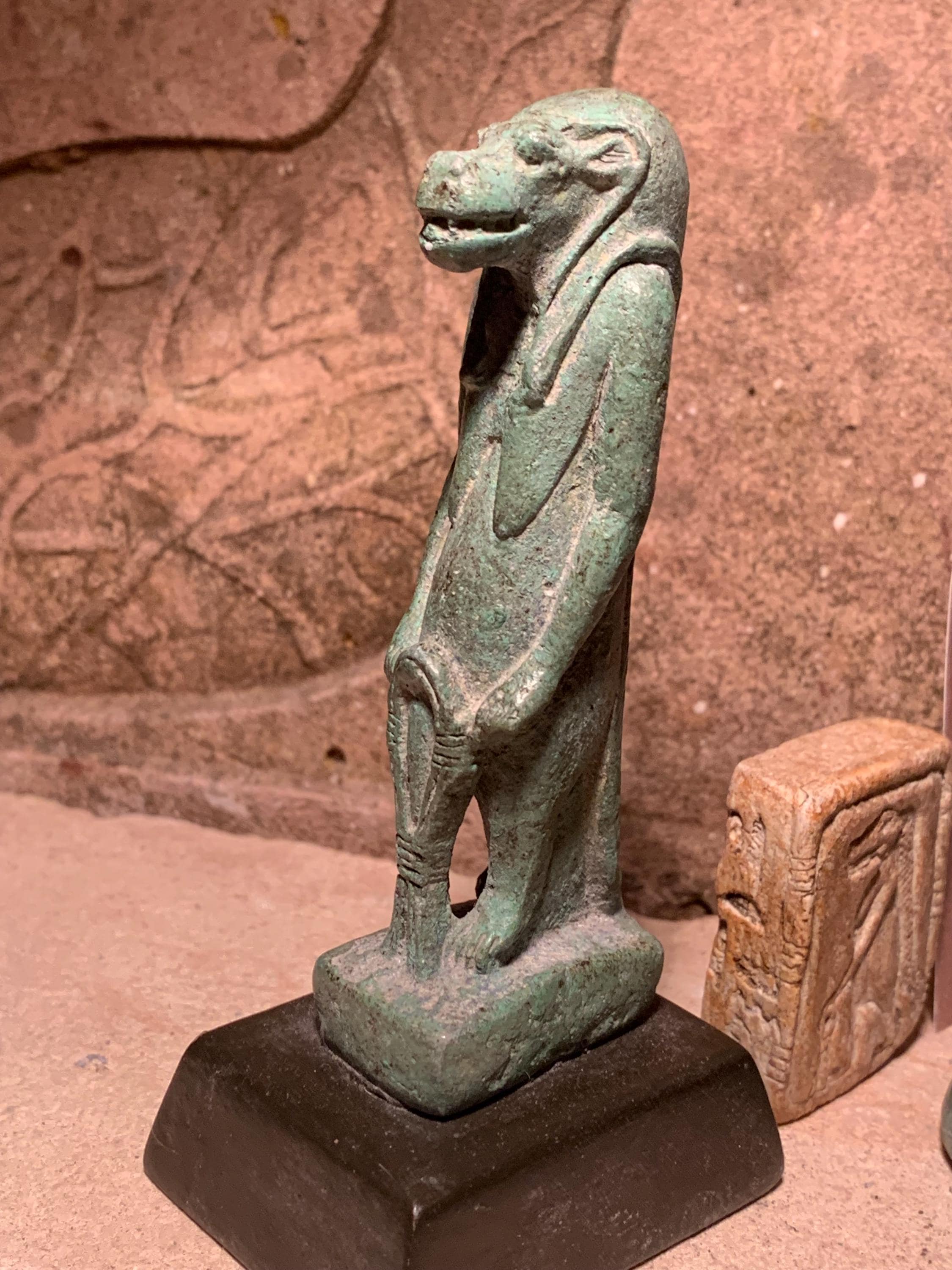 On offer here is a fine replica statue and a pair of amulets of Tauret, the hippopotamus Goddess. She was the patron deity of child birth and pregnant women and her very shape inspired such pregnant associations. Unlike a real hippopotamus, she walked on two leonine legs and could incorporate the tail of the crocodile (as in this representation) to swish away any spiritual entanglements.
