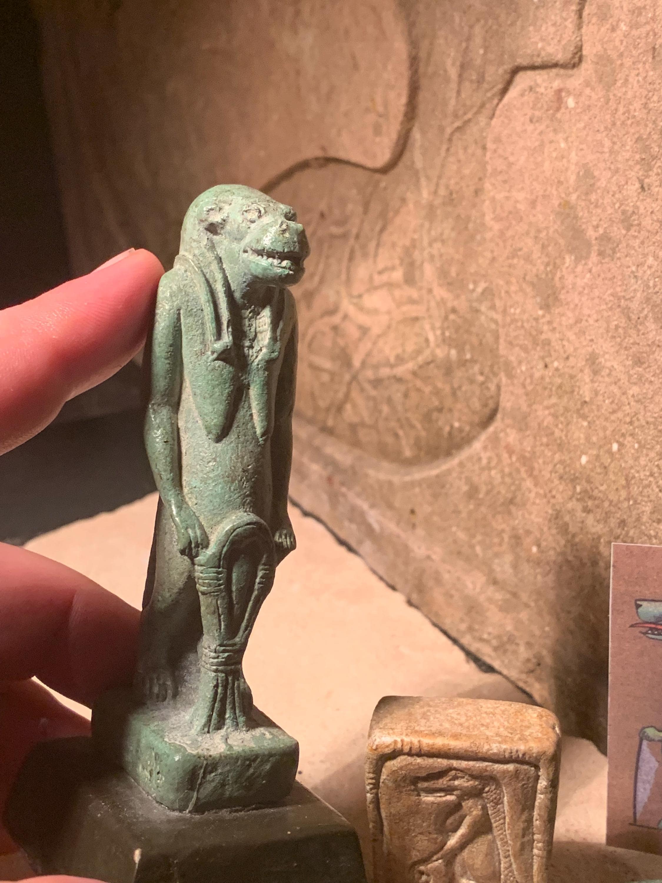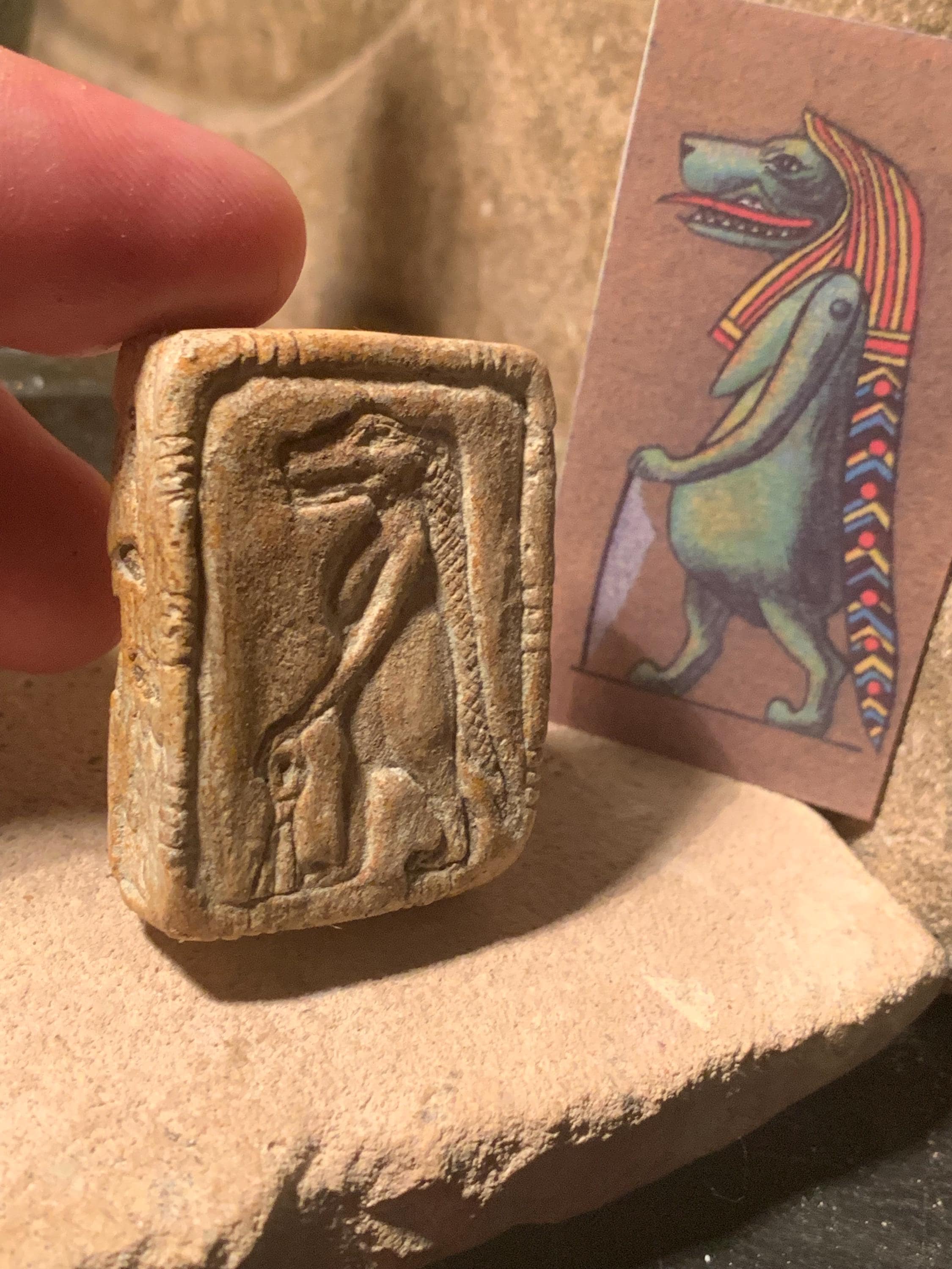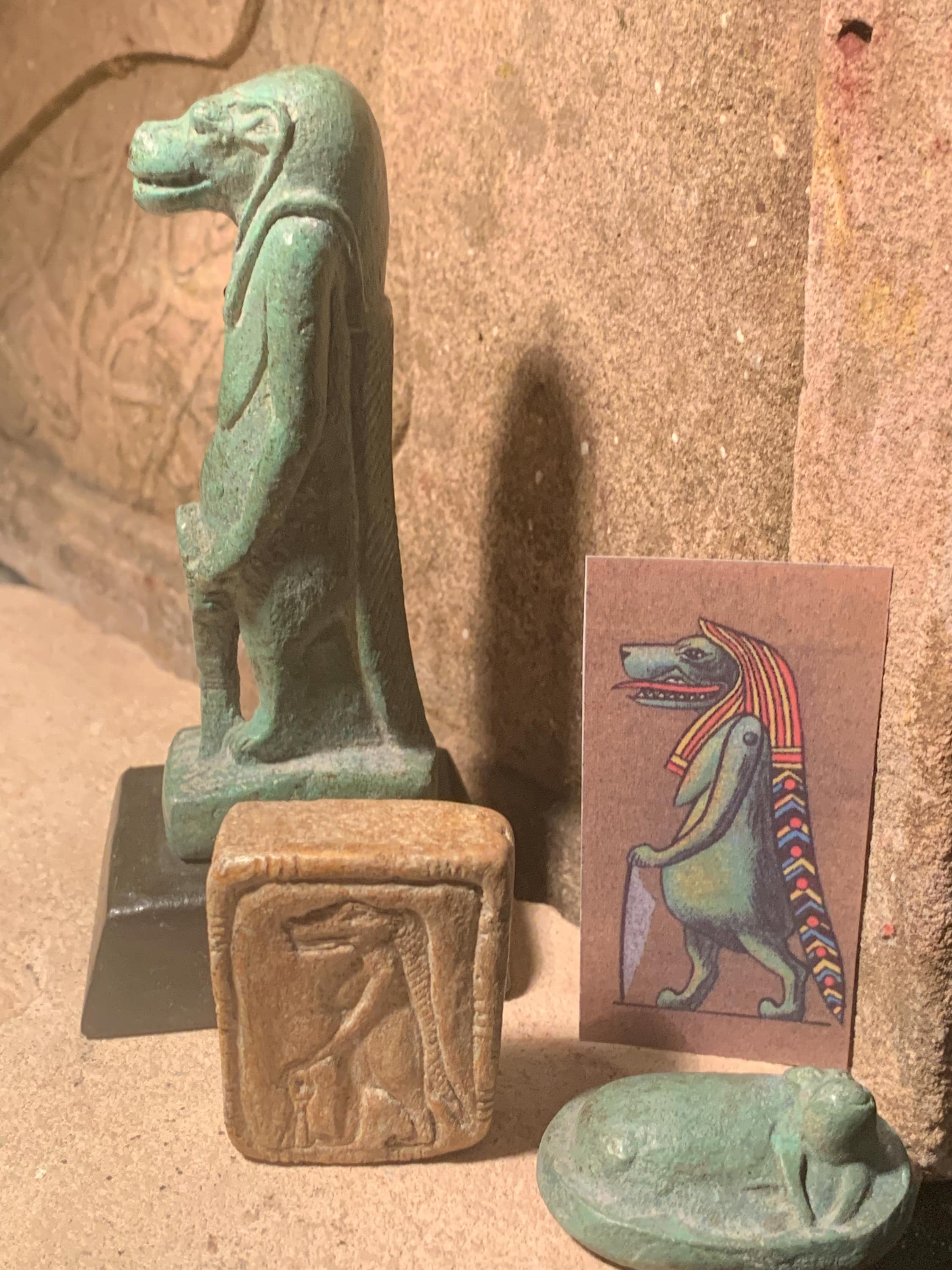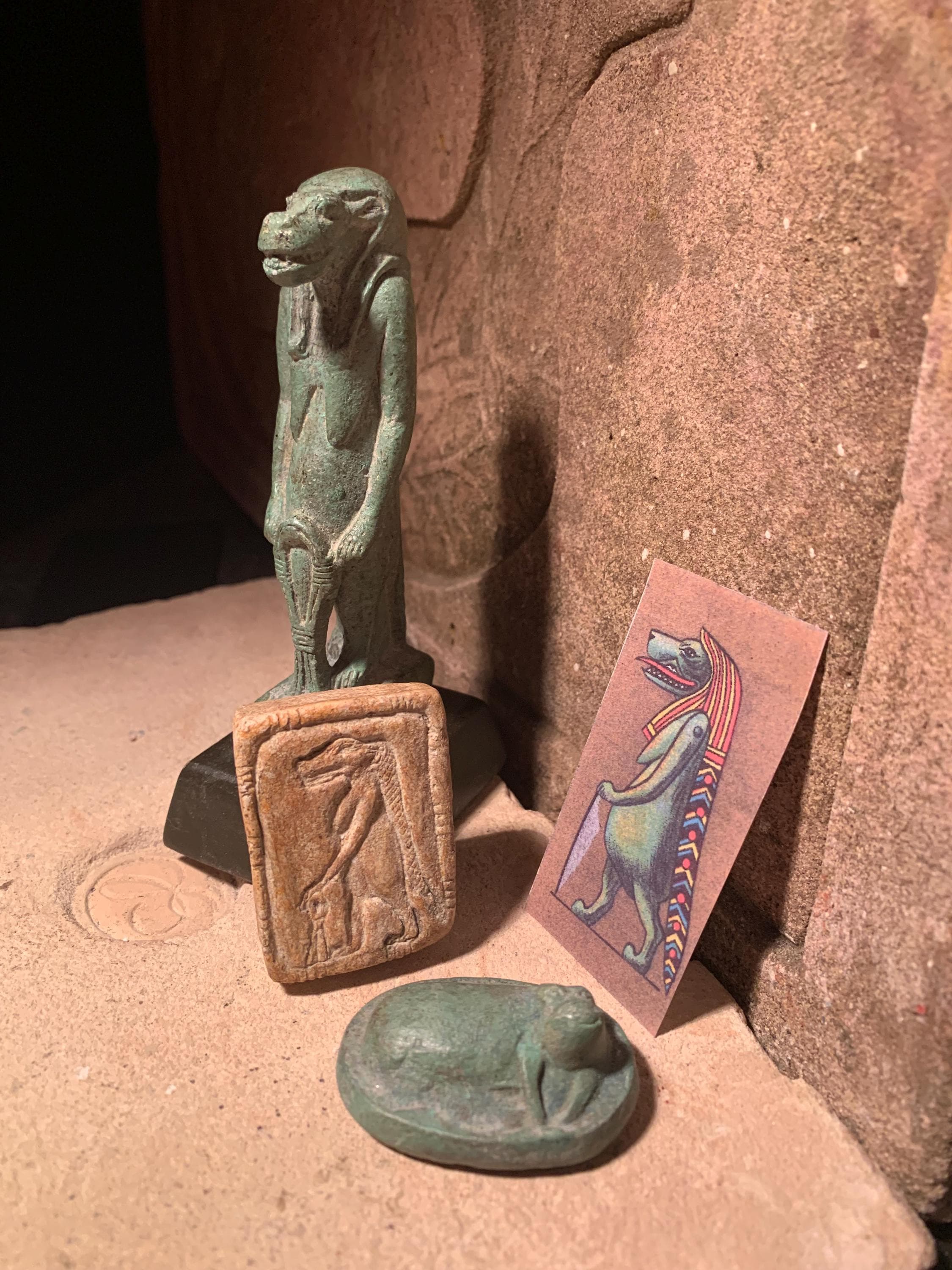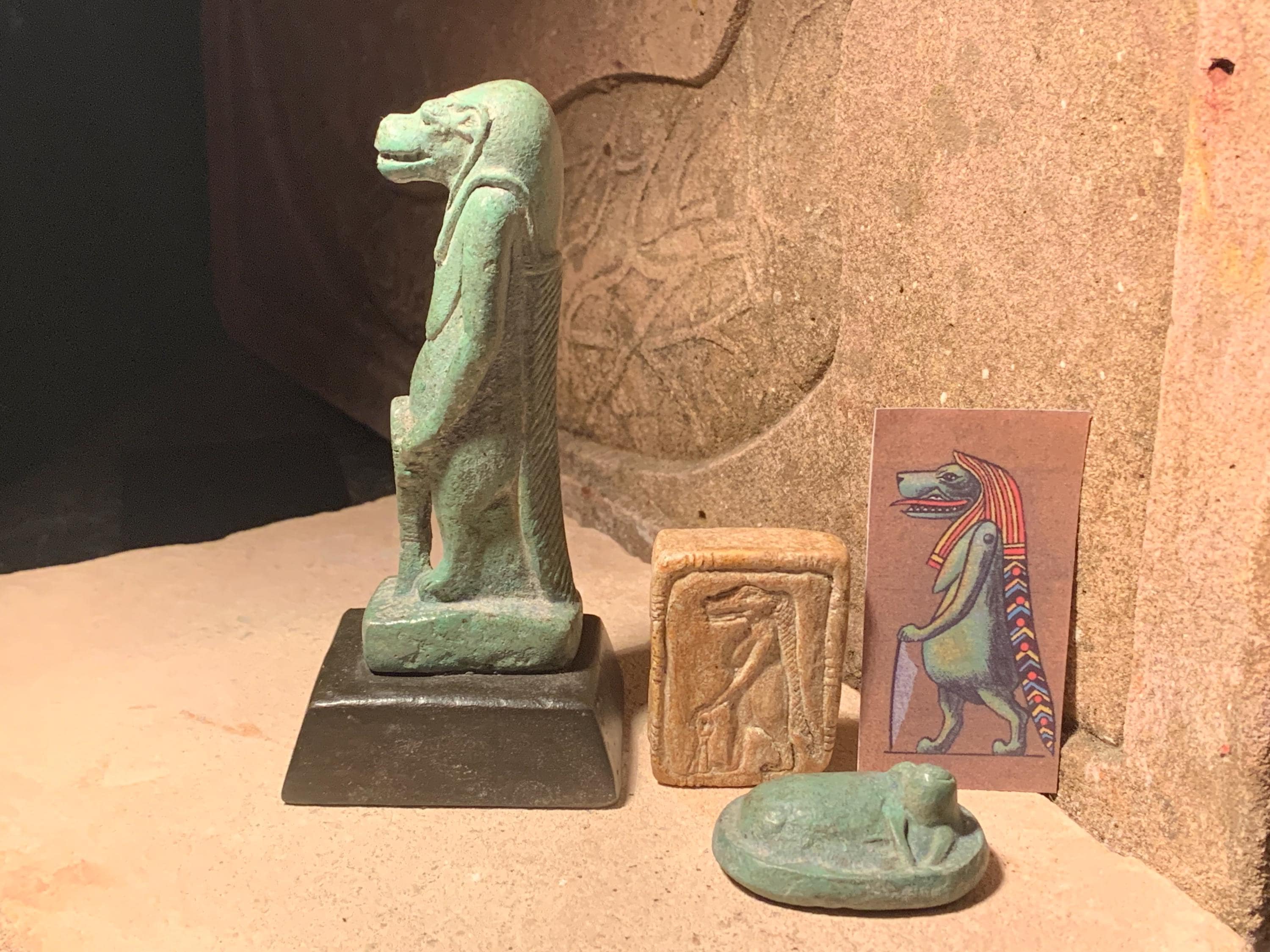 The rectangular amulet is a perfect match as it depicts Tauret in the same stance but in the form of a profile relief carving. The other amulet features a reclining hippo which was her sacred animal. A replica collector card of early 20th century design further rounds out the collection with a fine illustration of Taweret.