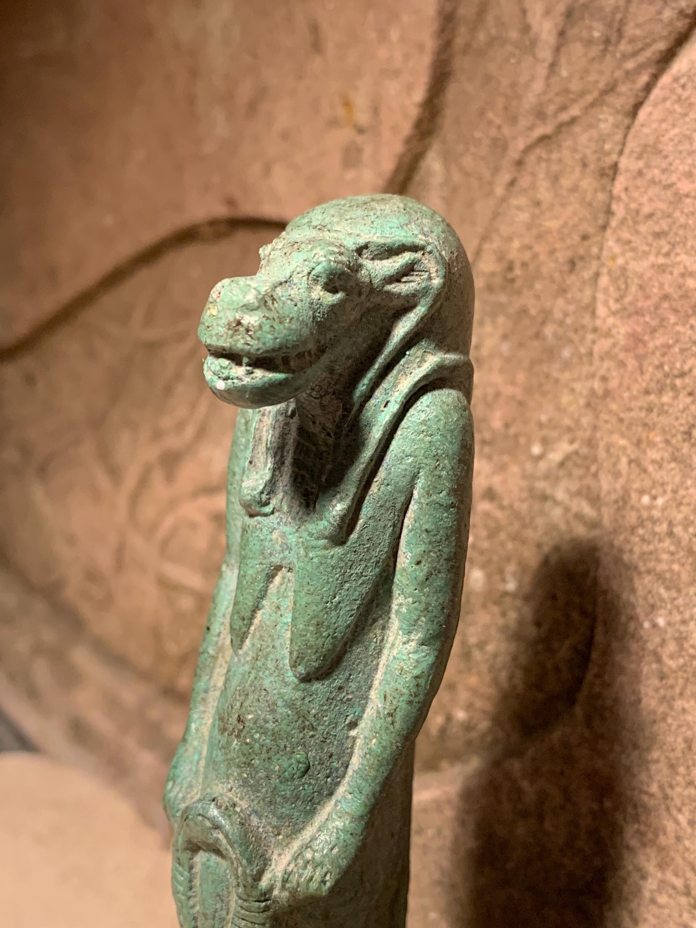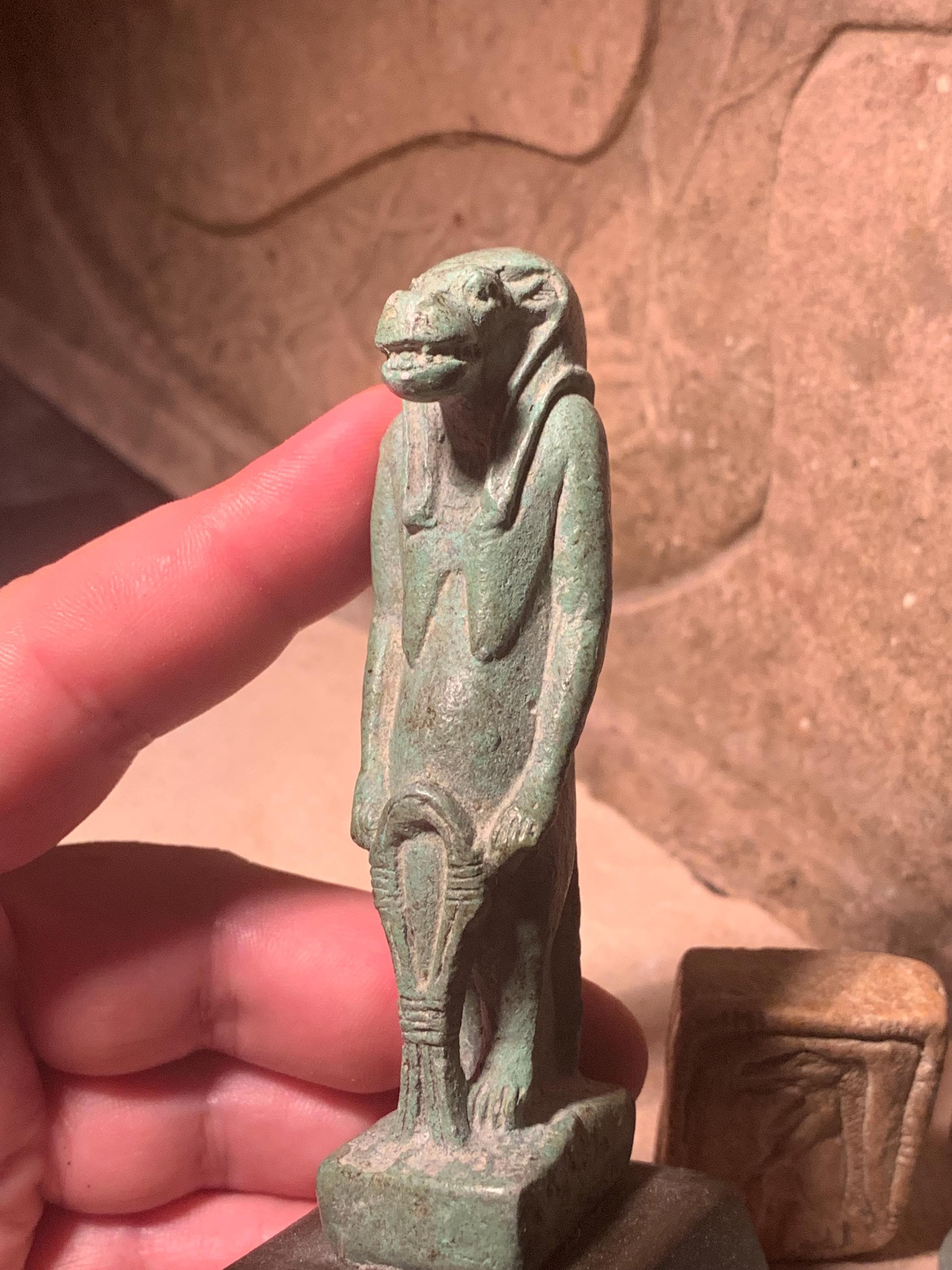 In both the statue and the amulet Taweret stands holding the 'Sa' knot which is a symbol of protection for children. Protection from evil and protection in childbirth.