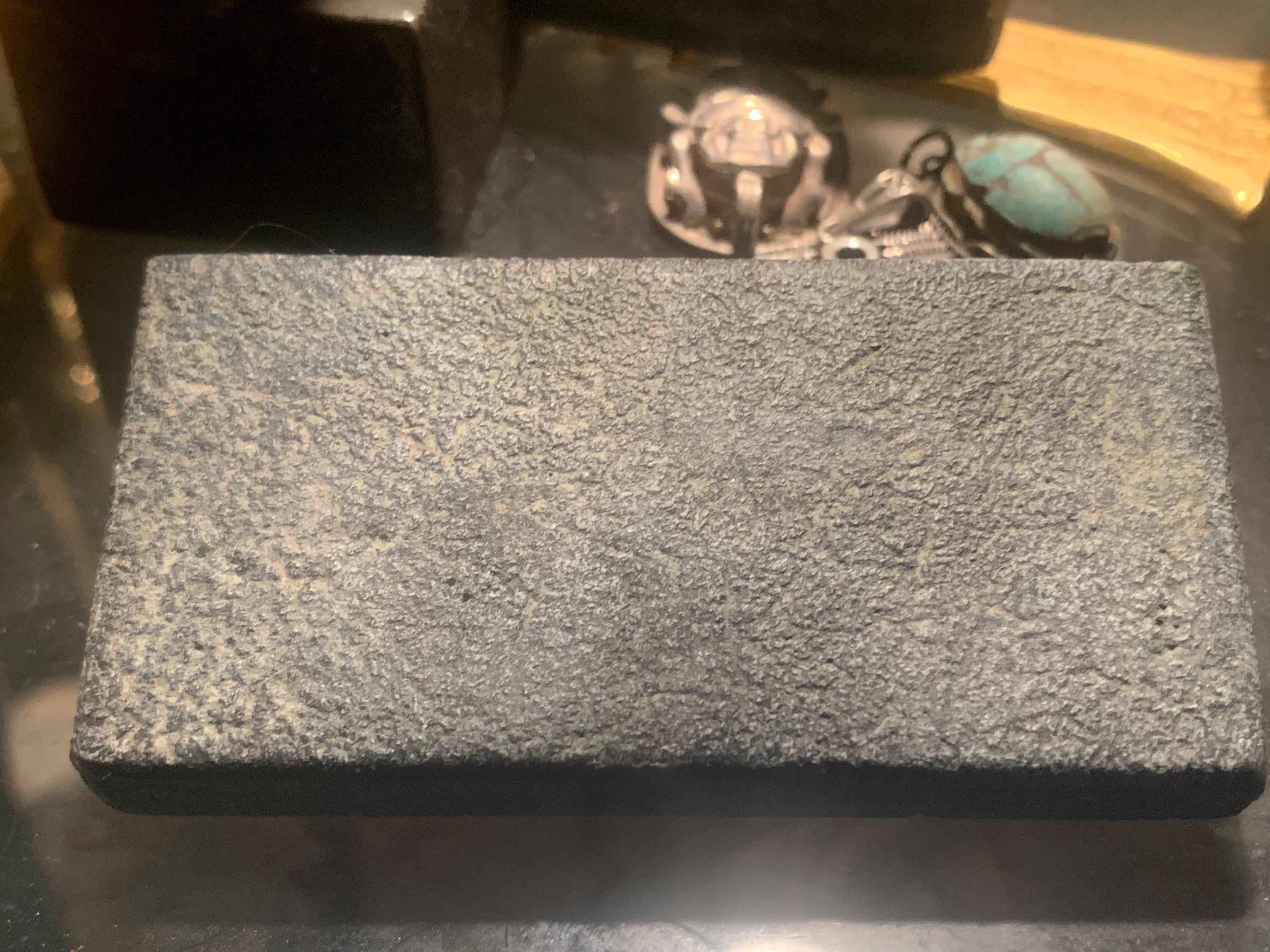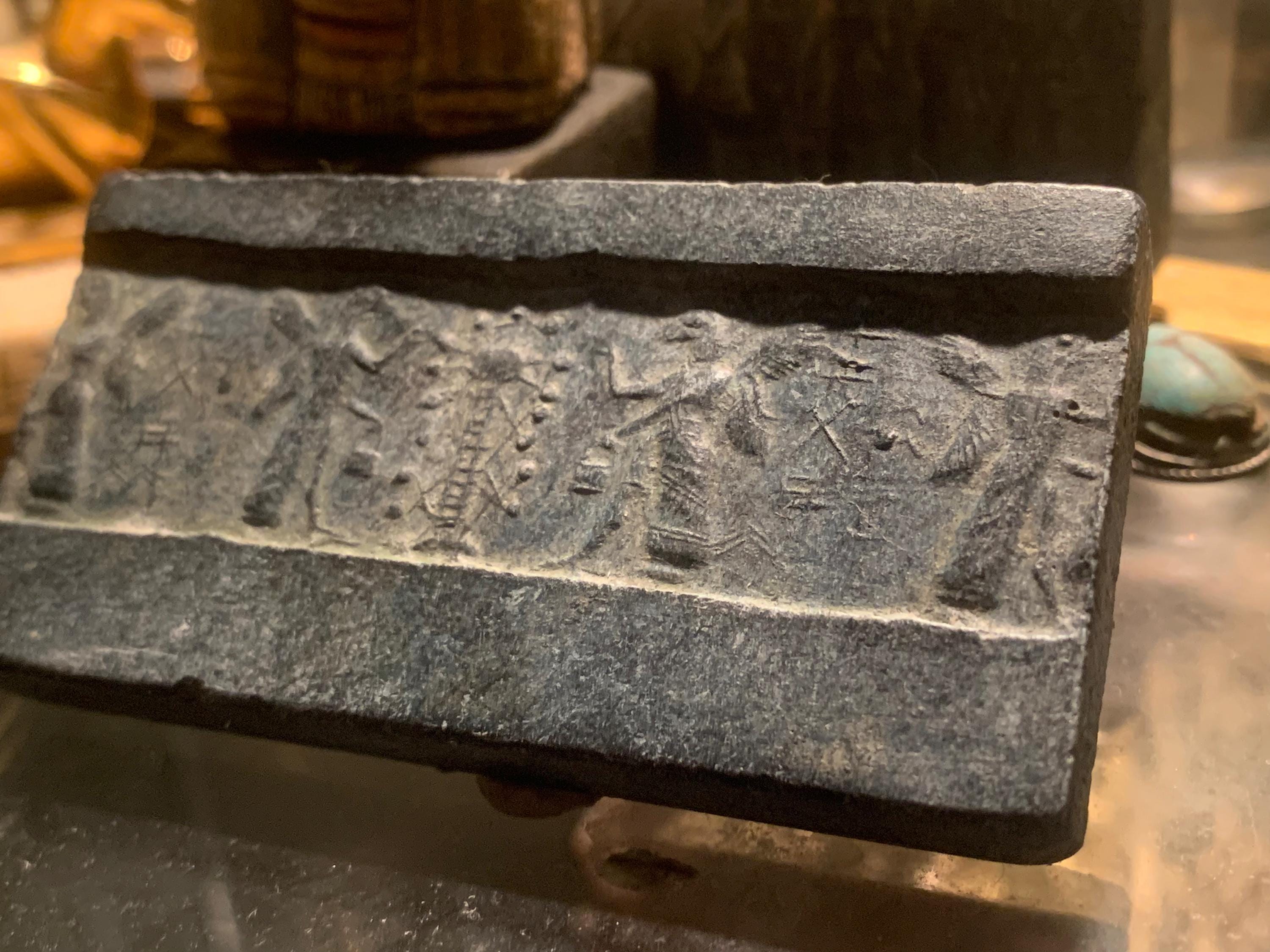 On offer here is a rare seal impression replica of Assyrian design. Made of limestone and quartzite composition stone it has an aged patina.