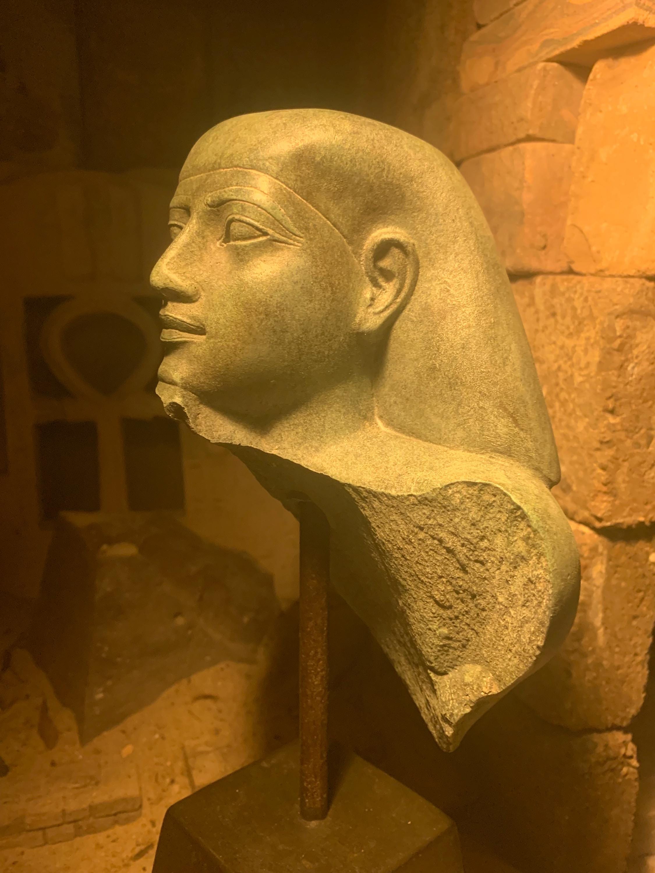 A fortunate discovery in the Cairo museum has identified the body that matches the distinctive jagged break of the head. This find allows for a greater understanding of the art as it was conceived and it was indeed a block statue with very fine feet protruding from the cloak he wore. Hopefully the two pieces may be joined together again one day.