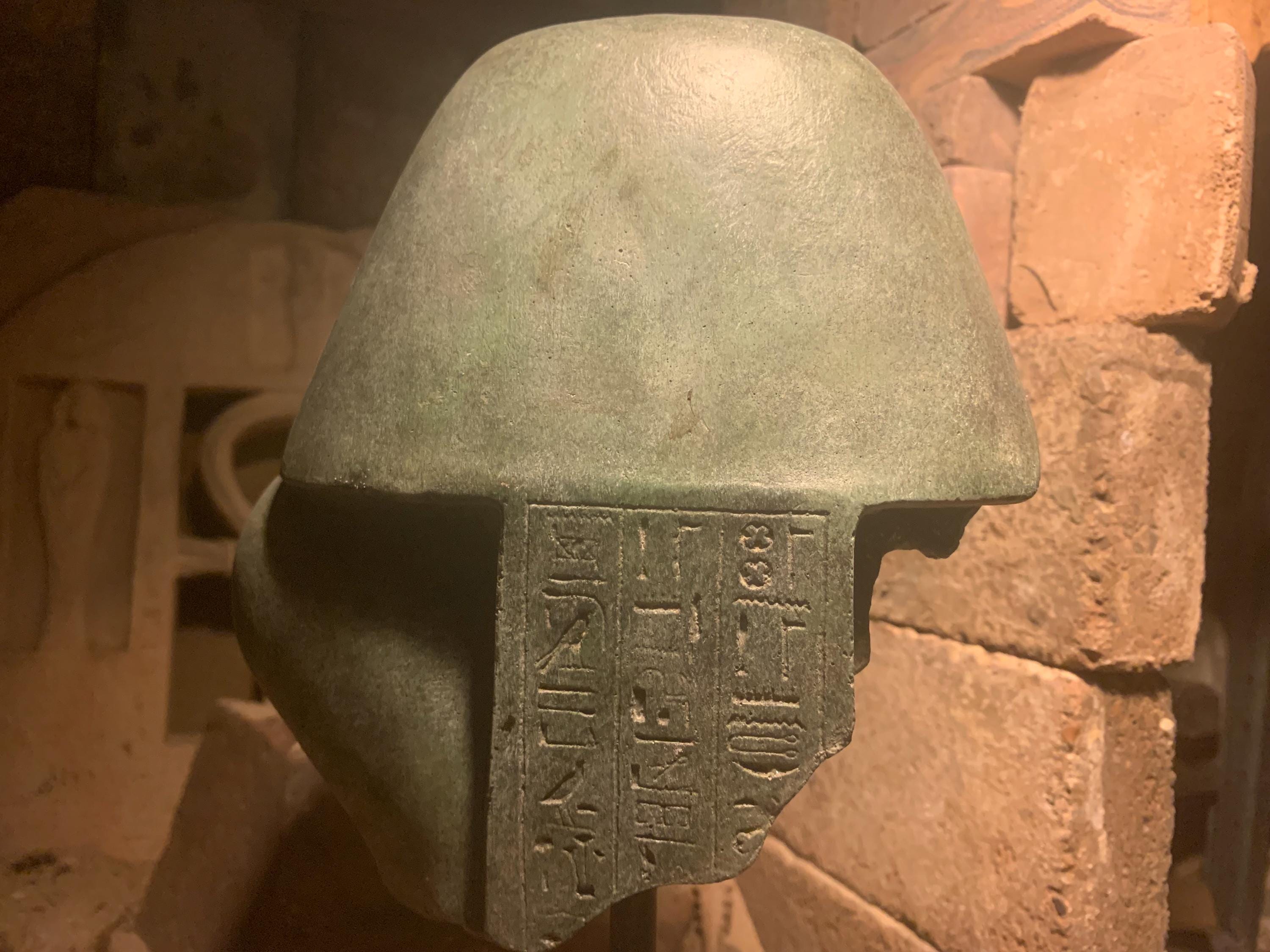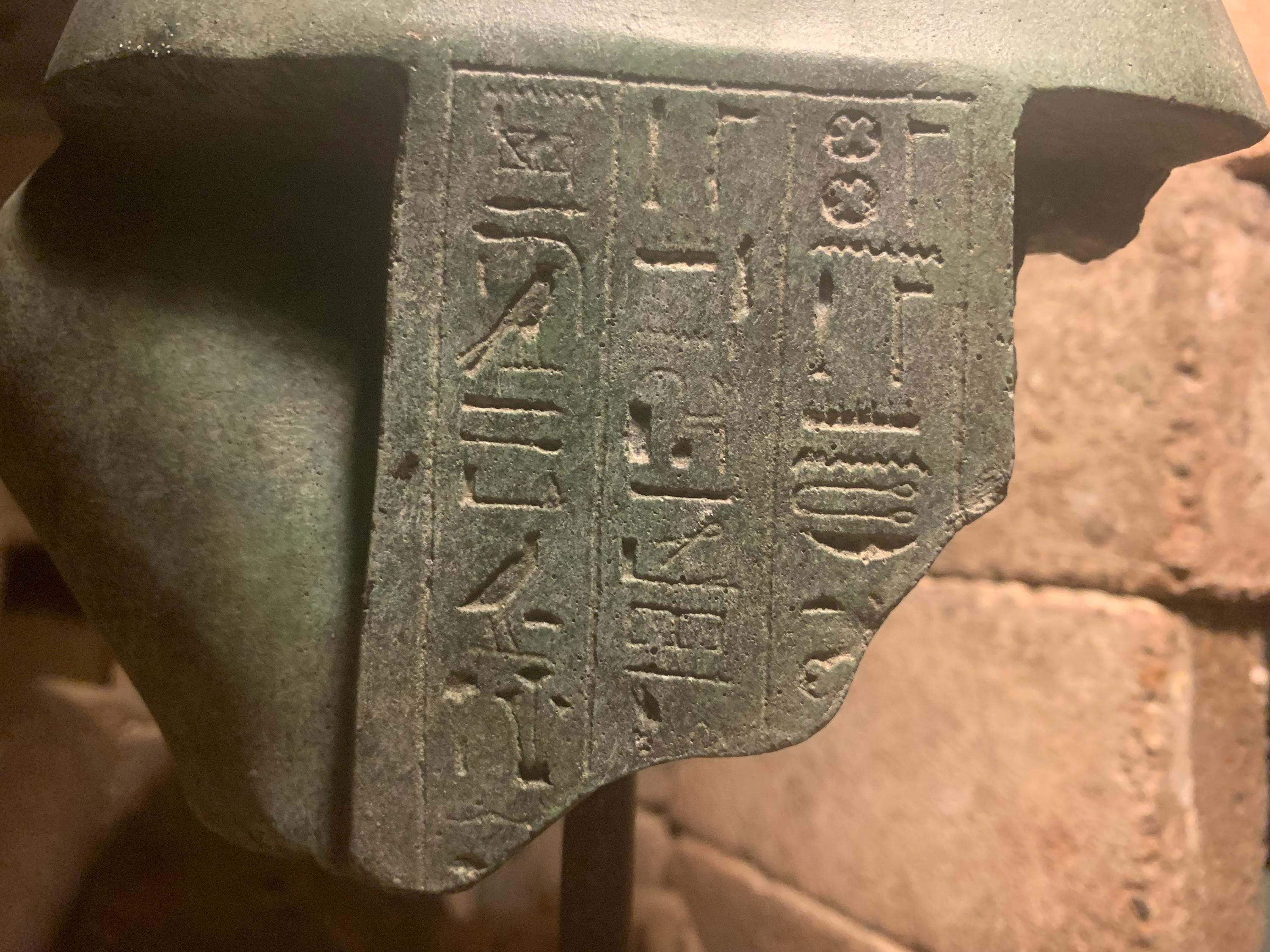 The hair is smooth and very tactile, the hieroglyphs seen on the back view are neat and spaced in a way very typical of the era. The text begins to tell the titles and genealogy of Ankh-khonshu who lived in the early years of dynasty 26 under the rule of Psamtik 1st.