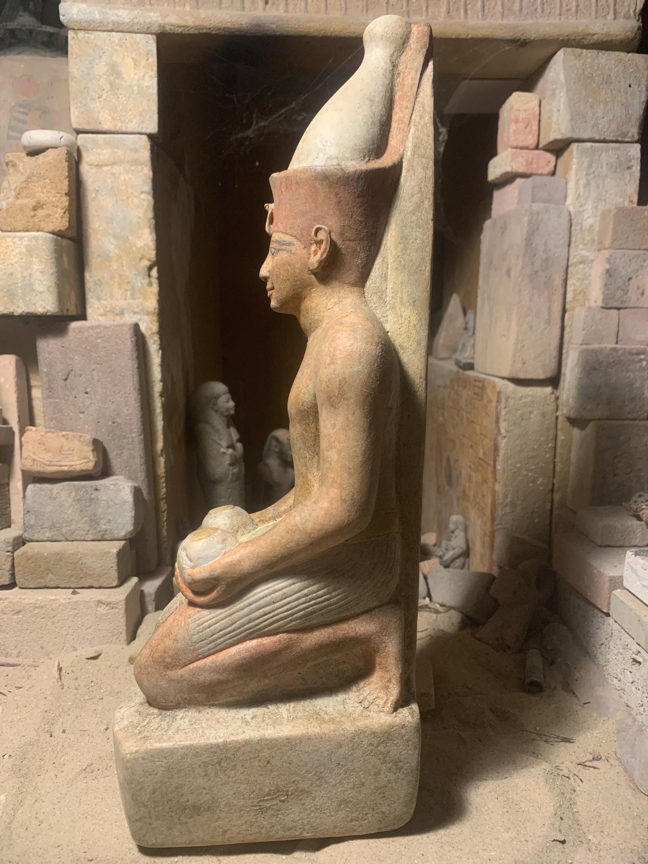 This piece is made of a limestone and quartzite composition stone and has been given an aged patina using the appropriate Egyptian colour palette.