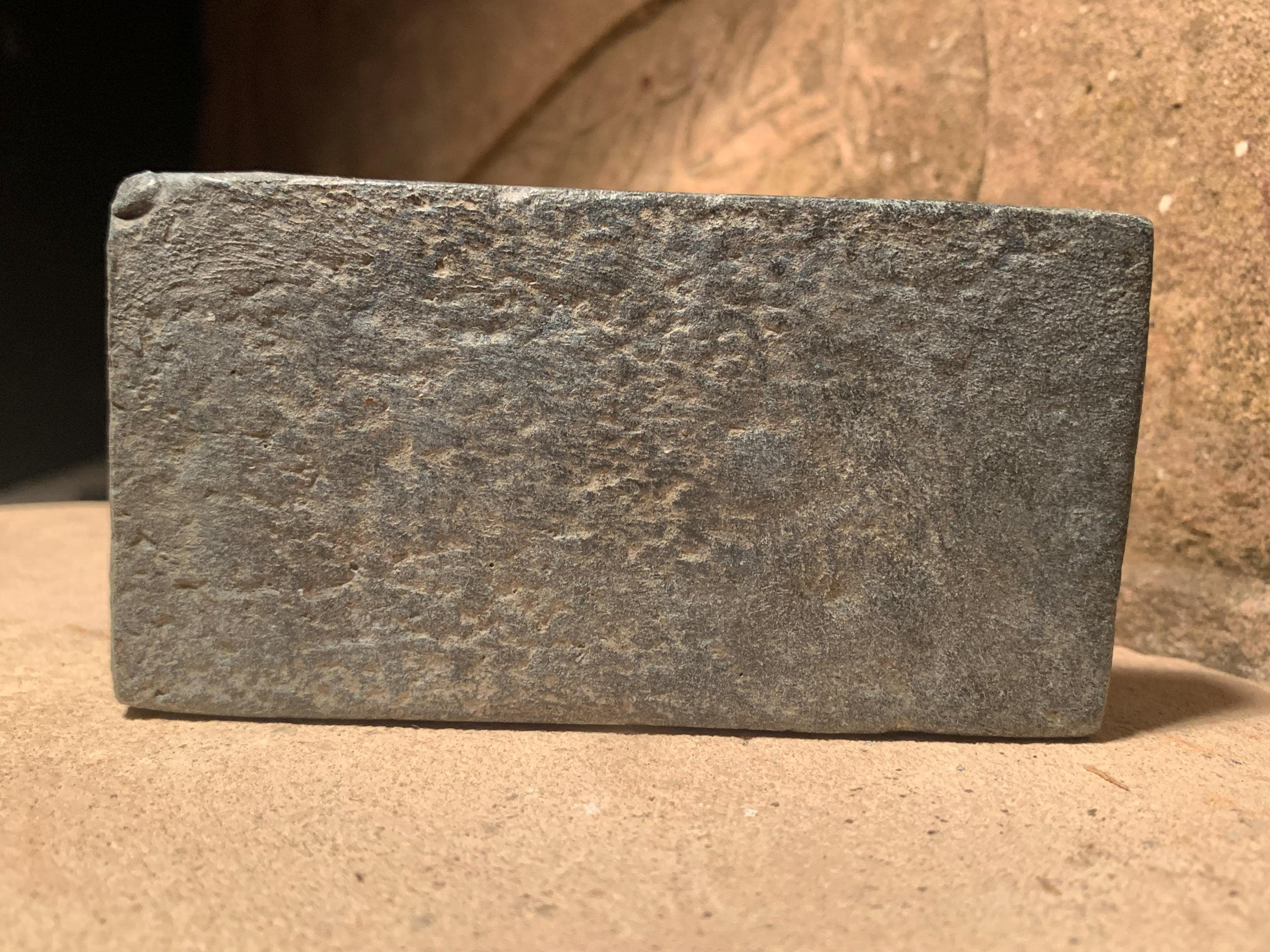 Made of a limestone and quartzite composition stone this piece has an aged slate black patina with a light polish.