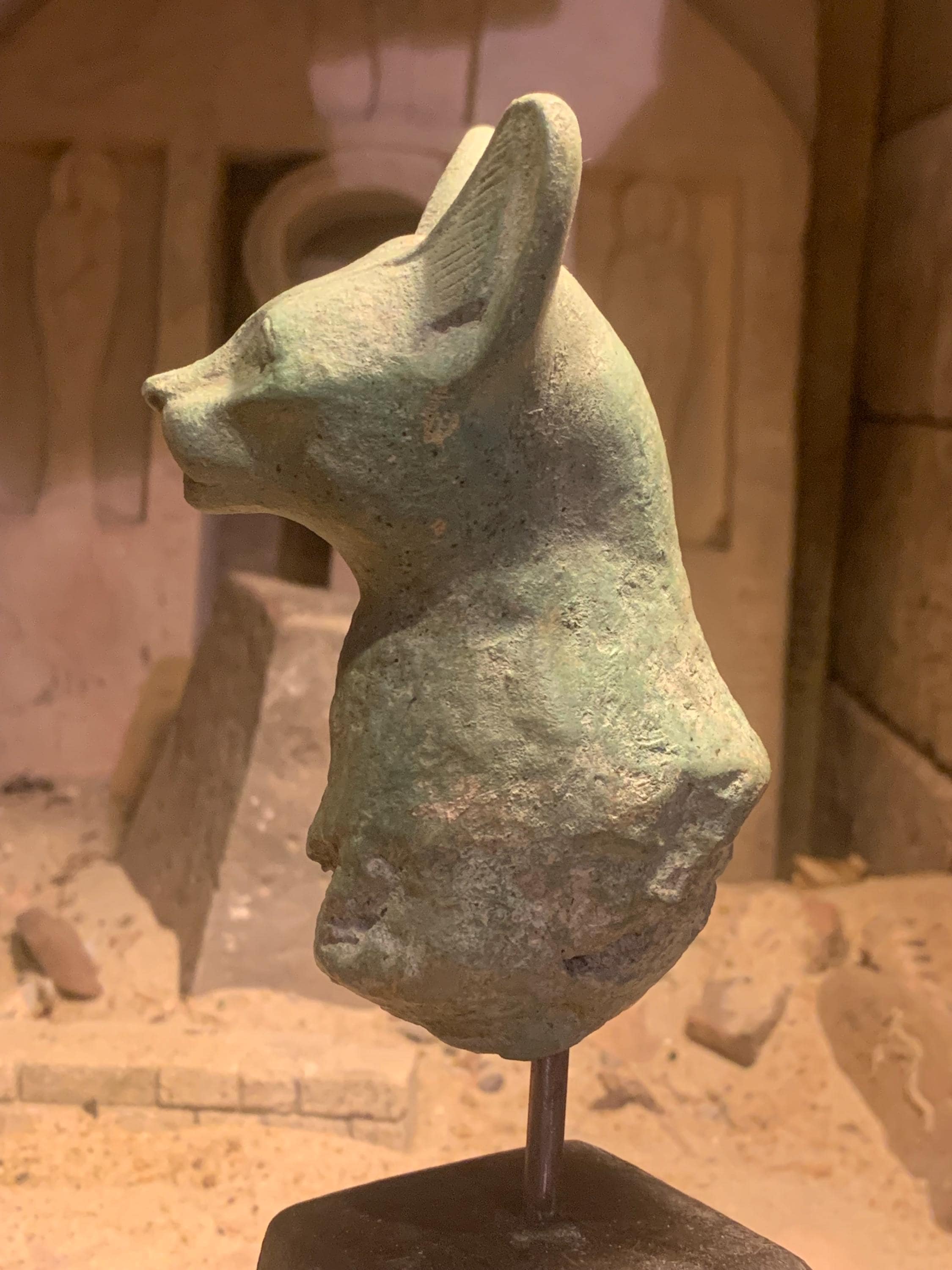 On offer here is a very fine replica statue fragment of the Egyptian cat goddess Bast. A most handsome face is preserved displaying great sculptural quality and a lot of personality. Depending on the angle you view, a sweet and demure face will greet you or a confident, almost aerodynamic profile.