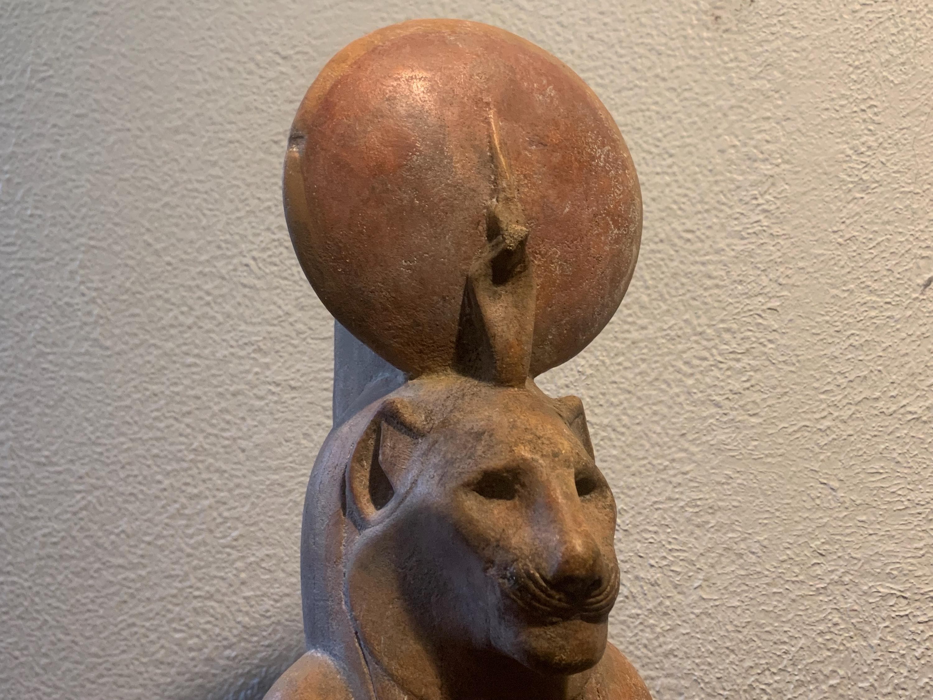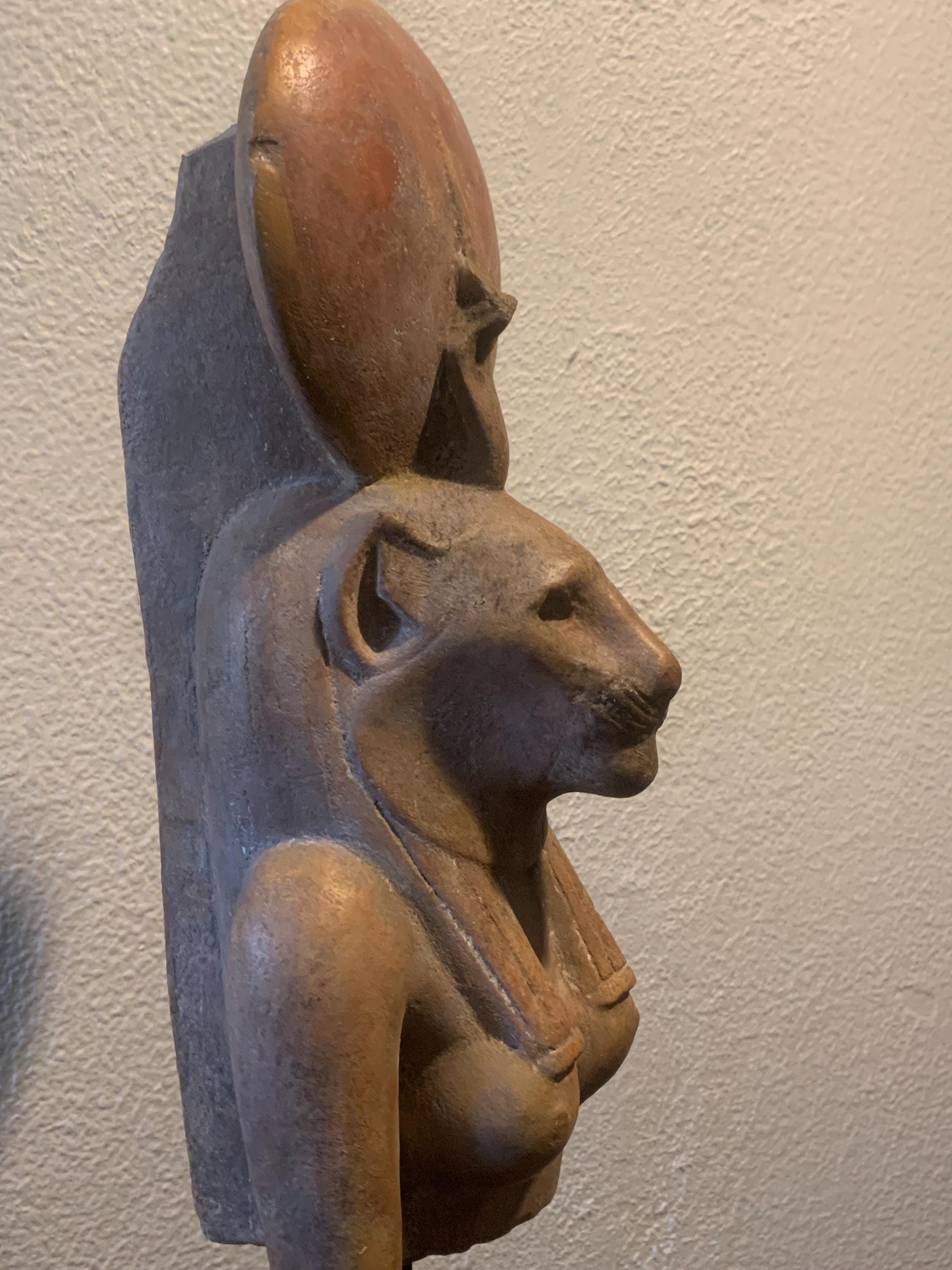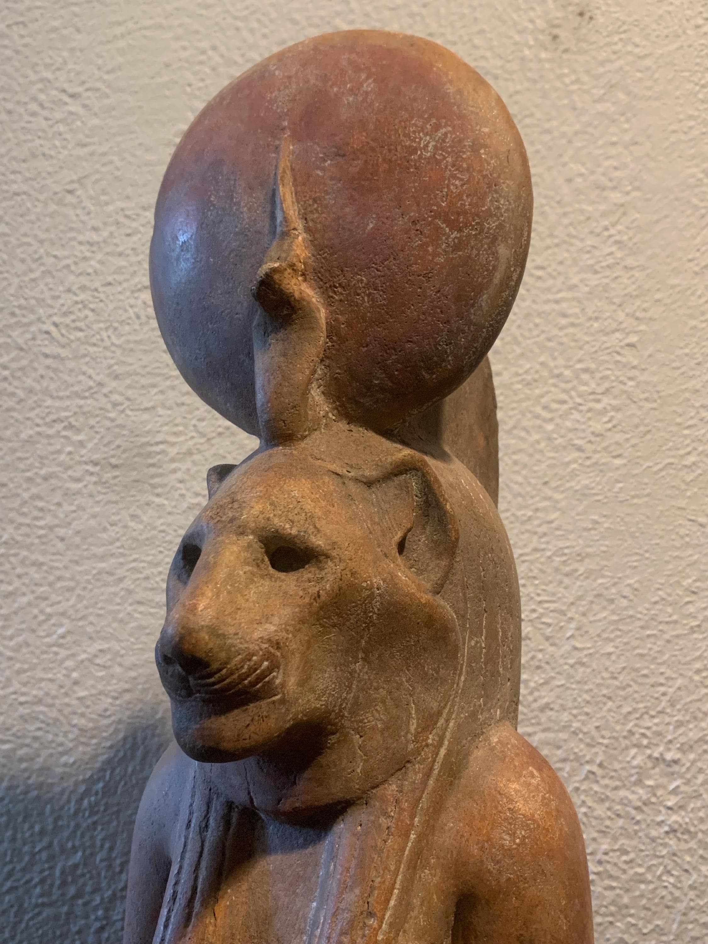 Made of a limestone and quartzite composition stone, Sekhmet has been given a well developed aged patina with red and yellow ochre defining the sun disc.