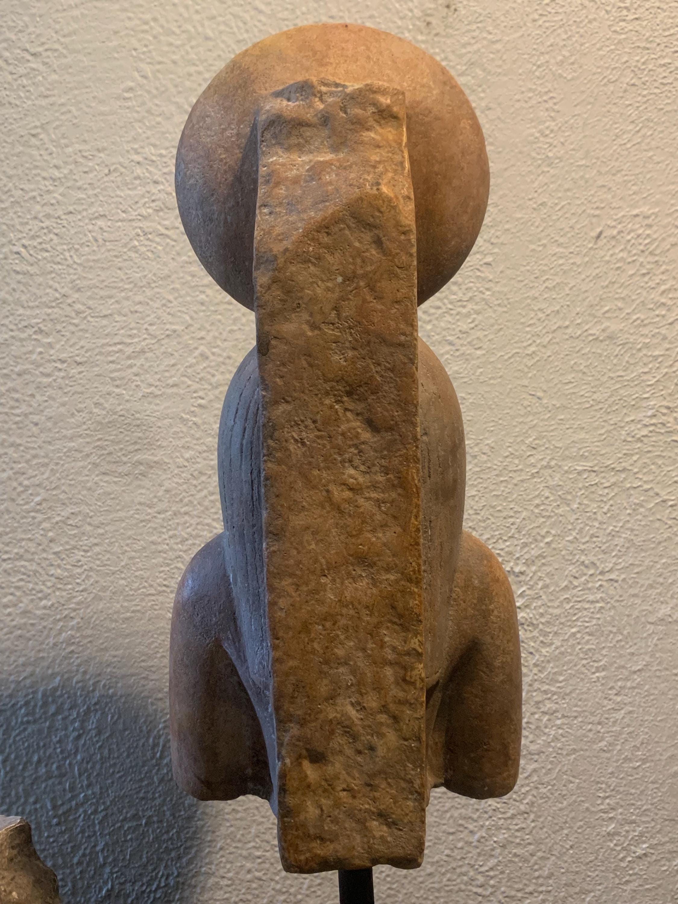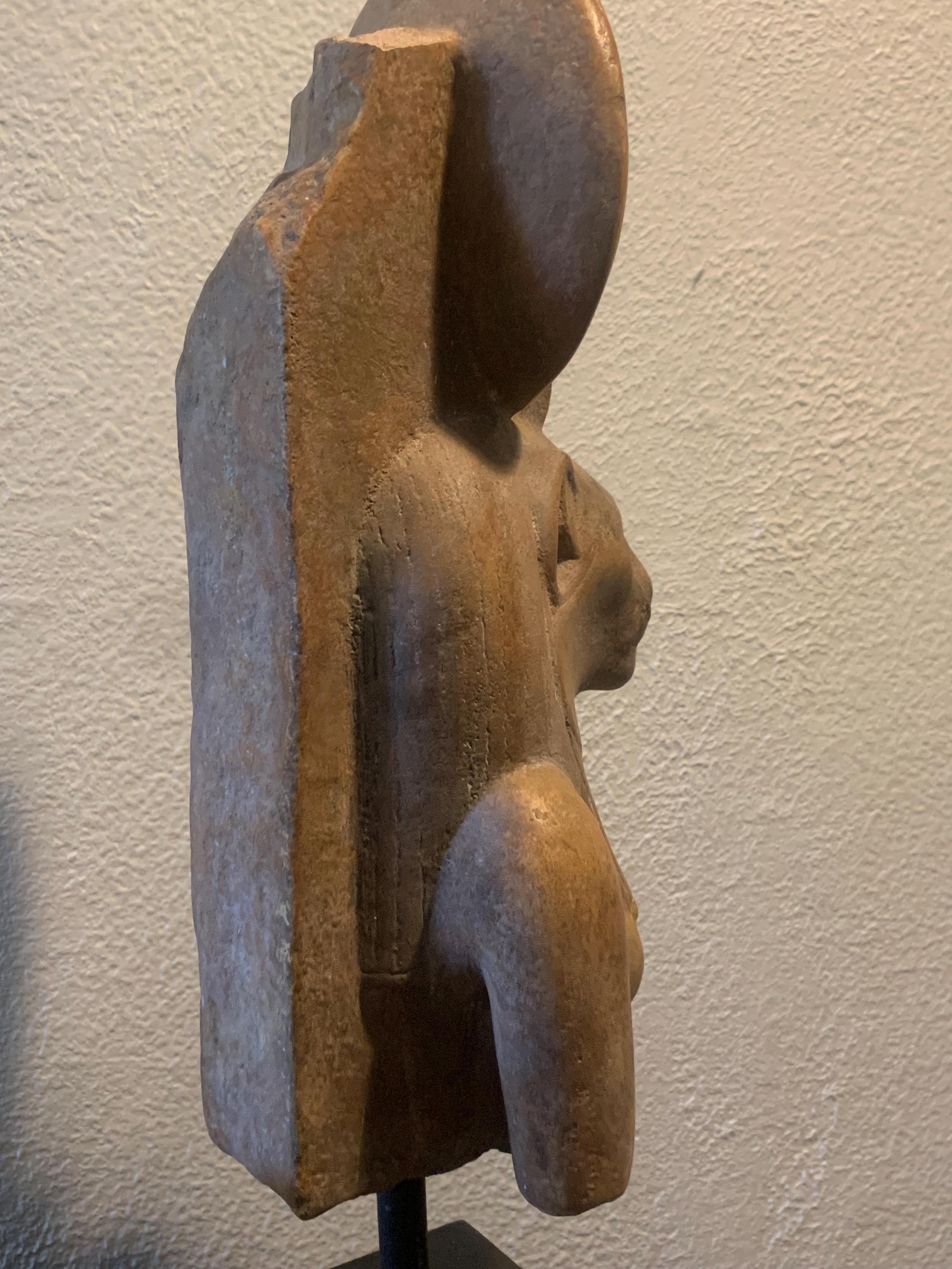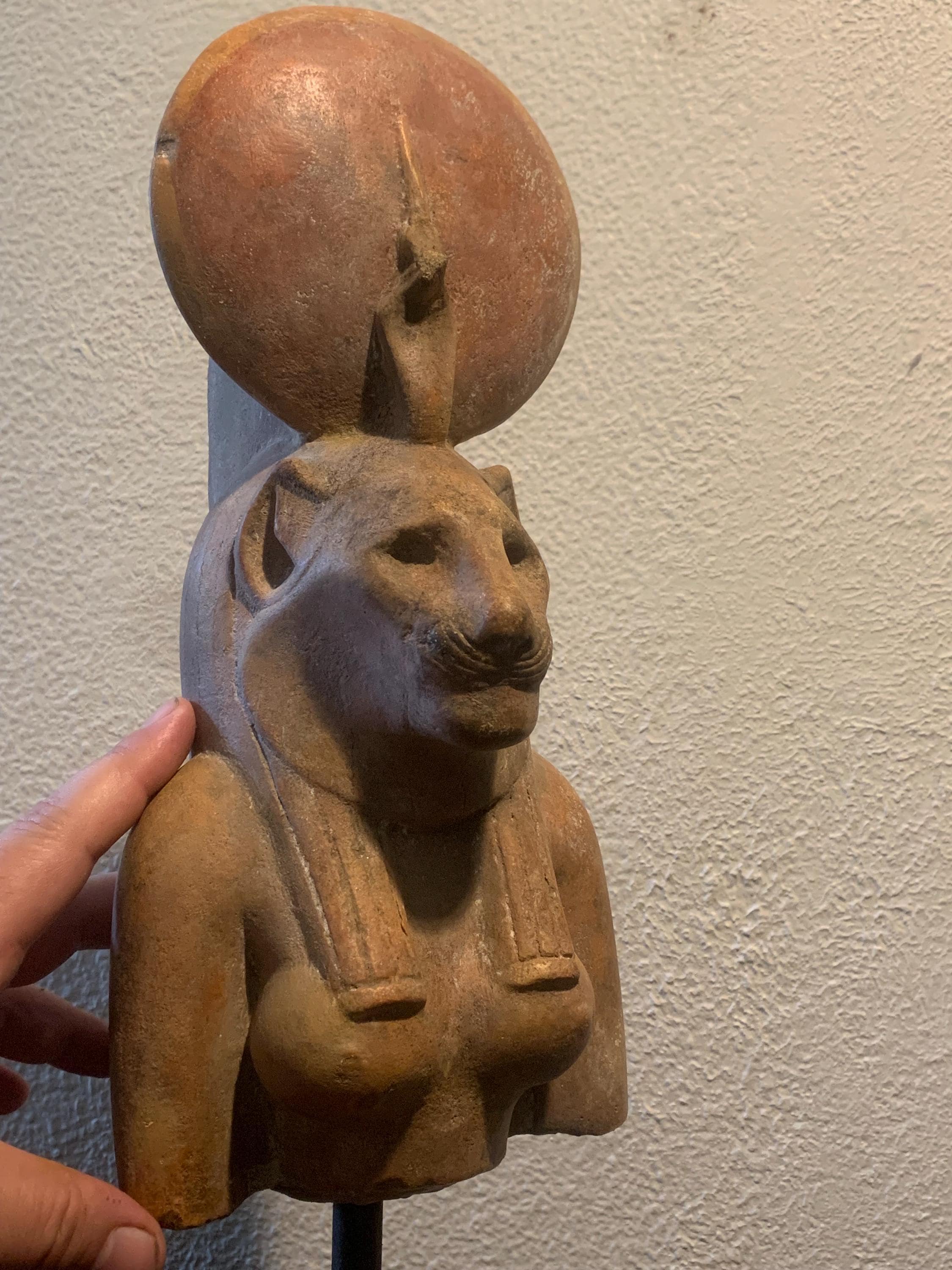 Made of a limestone and quartzite composition stone, Sekhmet has been given a well developed aged patina with red and yellow ochre defining the sun disc.