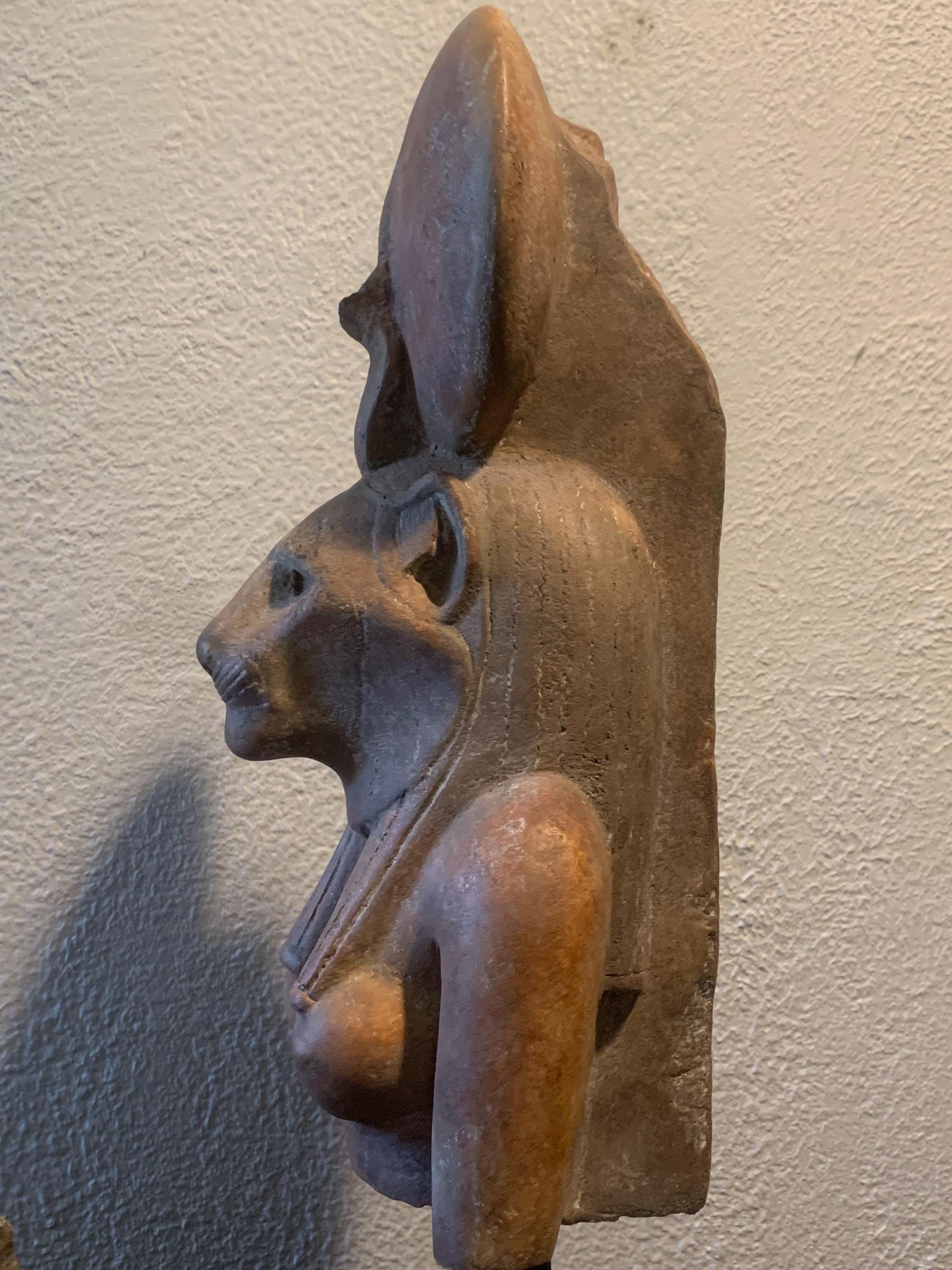 On offer here is a stunning replica fragment of the powerful and feisty Egyptian goddess Sekhmet. This is a large, almost half life size fragment of a once standing statue of the anthropomorphic goddess. That she was once standing can be determined by the remaining support pillar that can be seen in the rear view. A beautifully sculptured face, her engraved whiskers and ears are well defined.