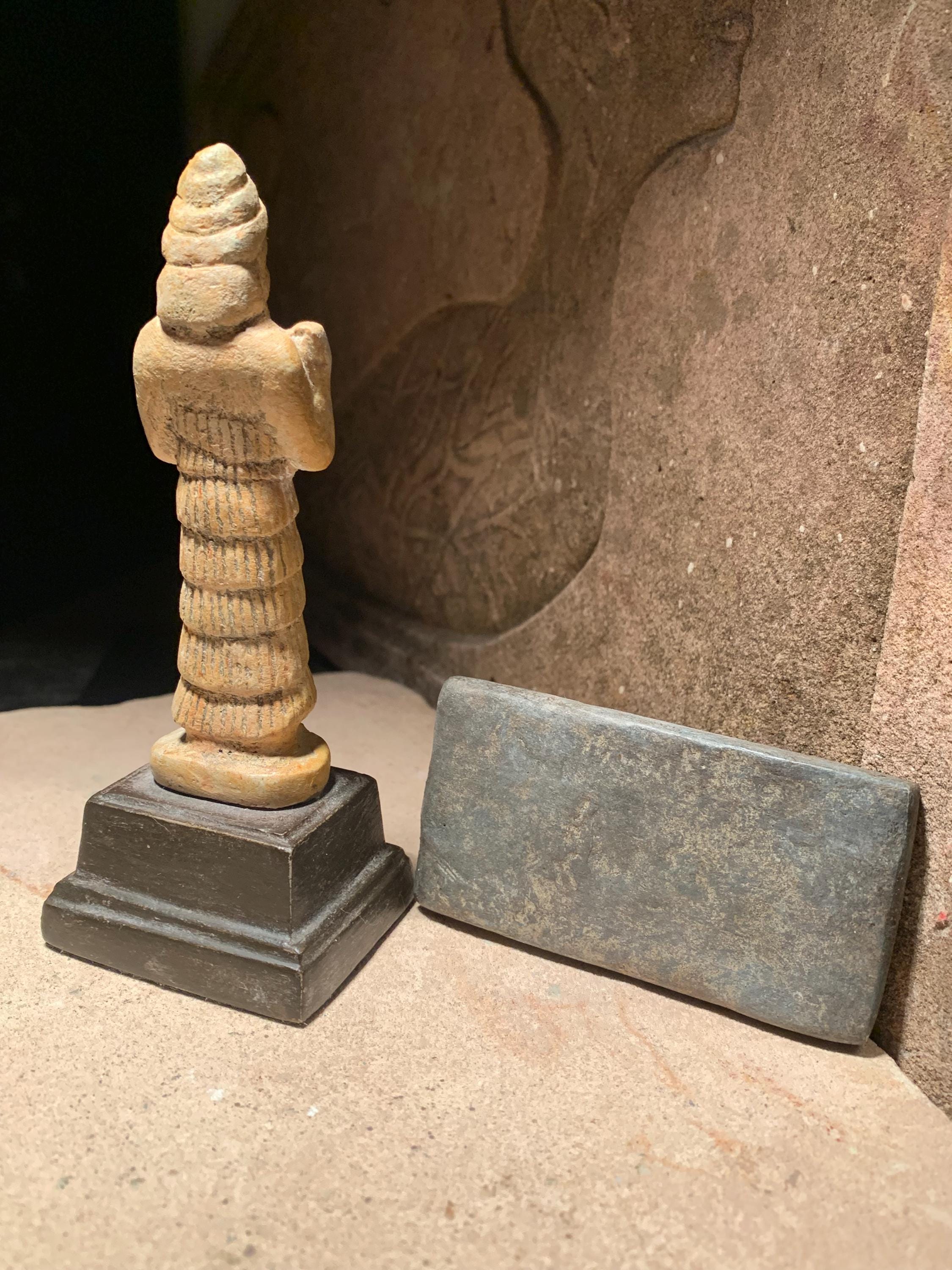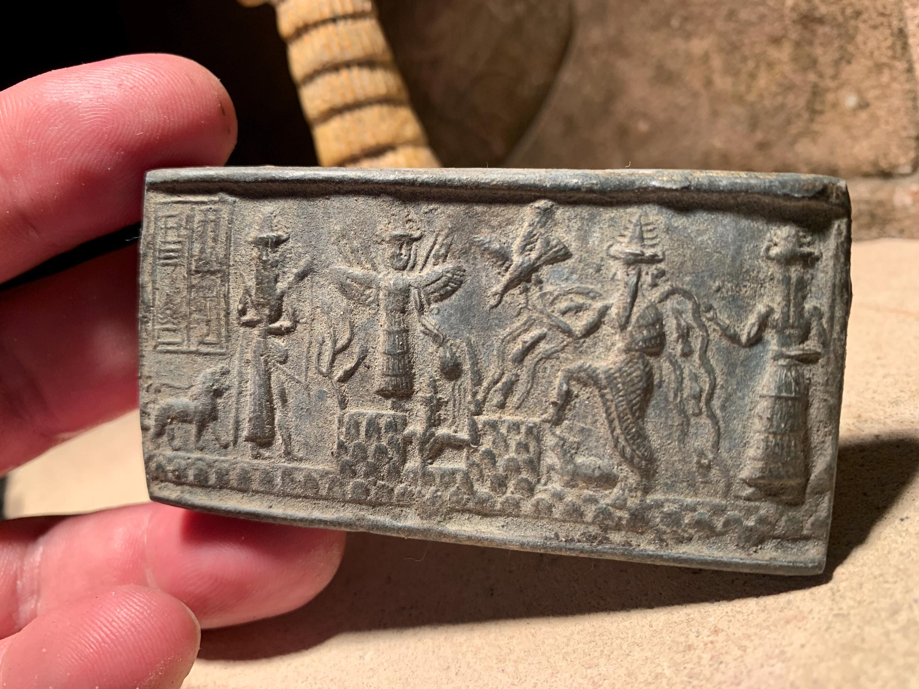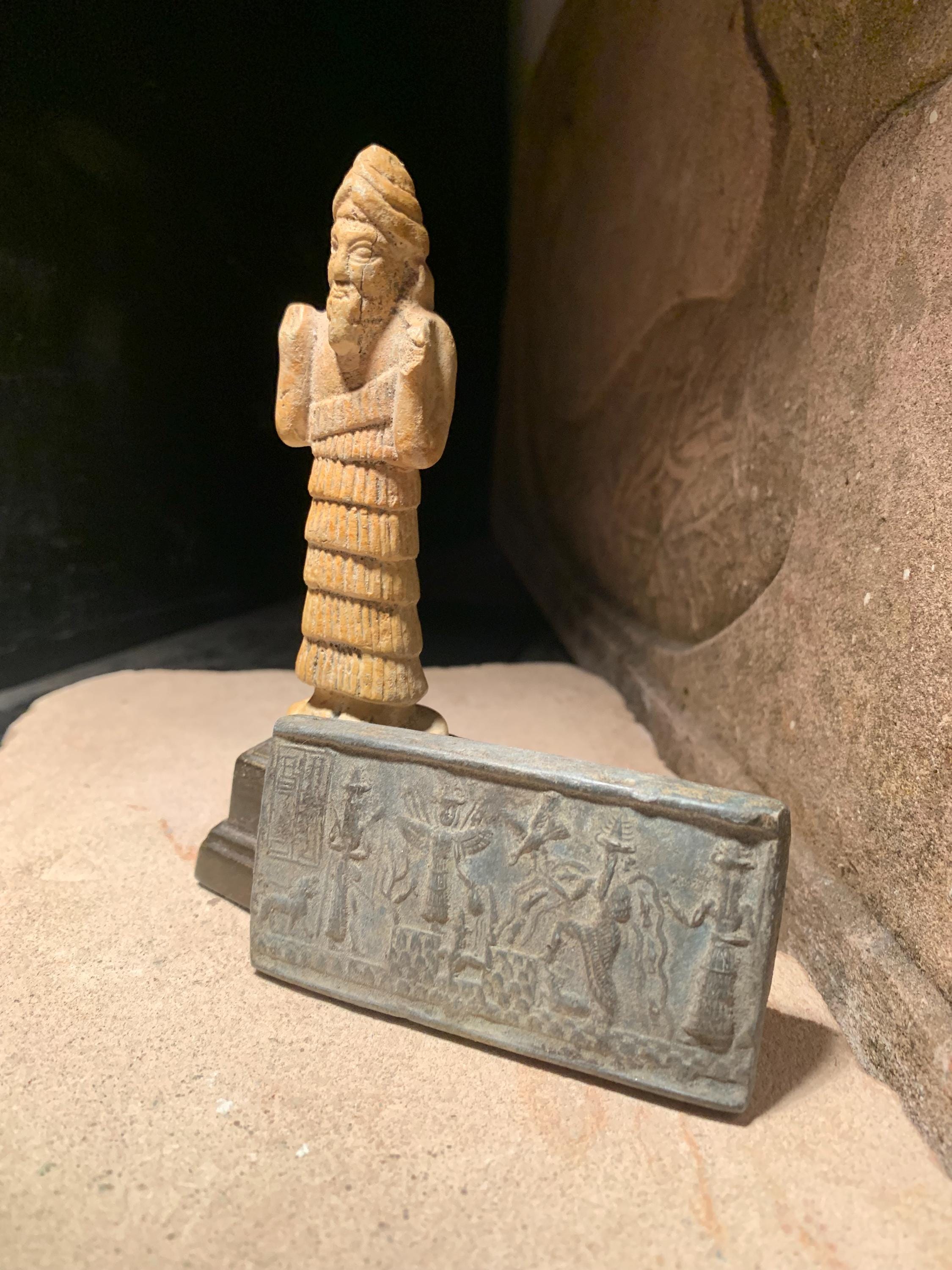 On offer here is a fine, and highly detailed replica of an Akkadian seal impression featuring four of the principal Gods of the Mesopotamian world and an attendant messenger. In addition a small statuette of Enki makes for a great combination display option.